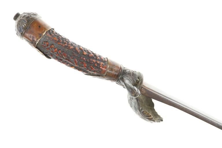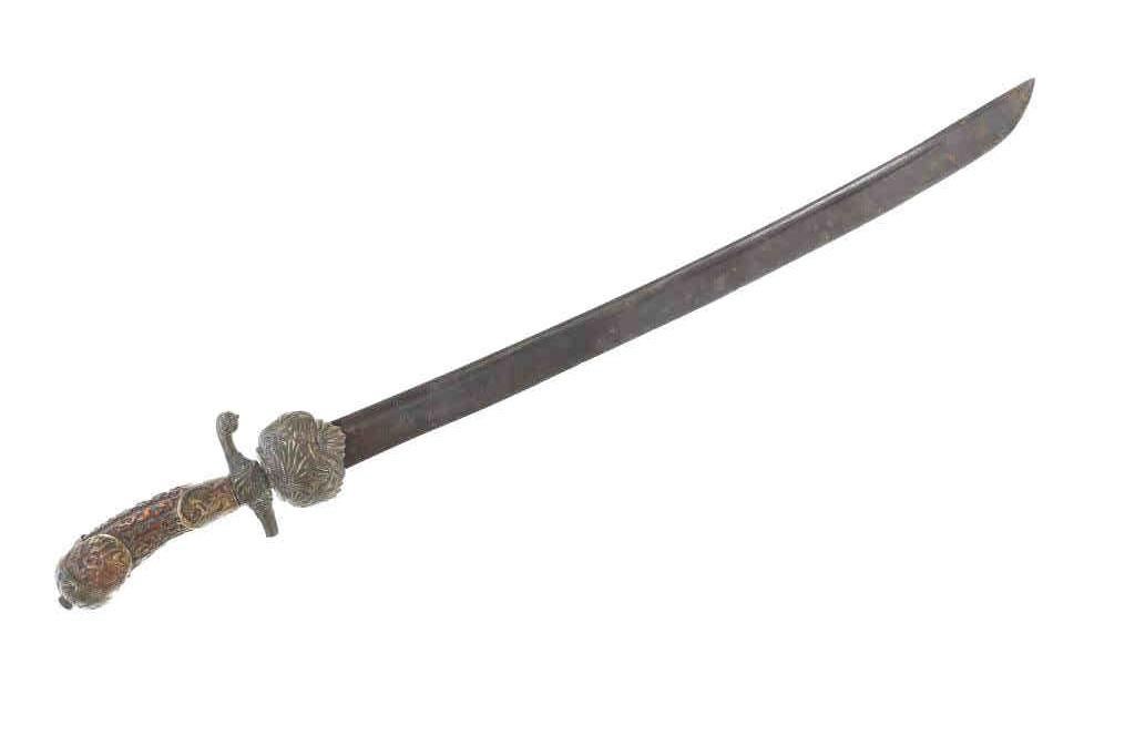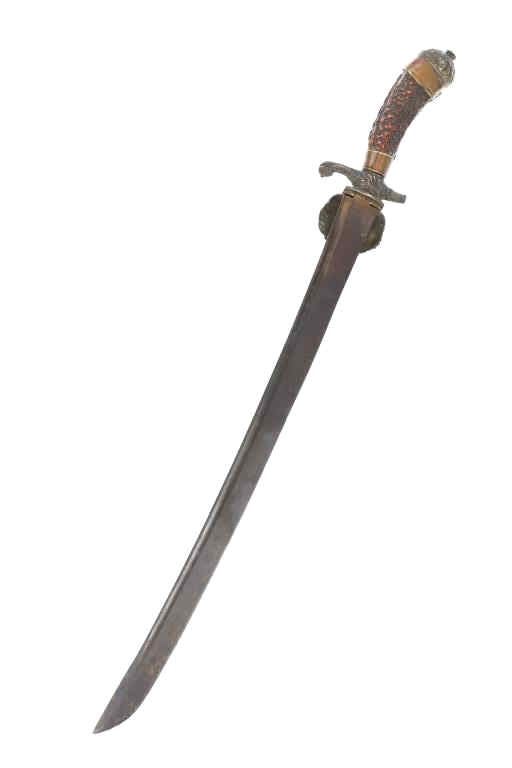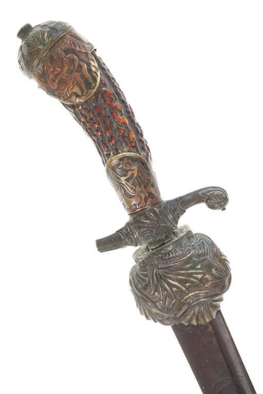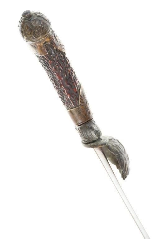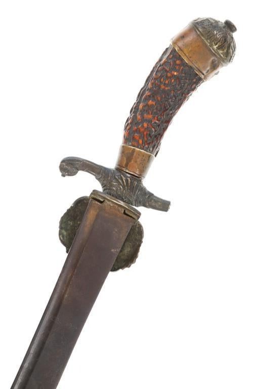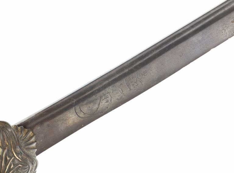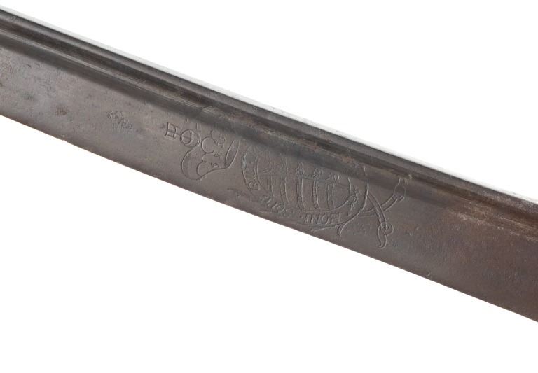 For your consideration this lot features a Rare Vintage American Revolution Era Most Noble of the Order of the Garter Cuttoe Hunting Sword, circa 1760-1820. The Most Noble Order of the Garter is highest order of chivalry in England, and this sword is different to most in that it bears the seal of that order instead of the normal Royal Coat of Arms; this means the officer who once owned and held it was a member of that order and a very important infantry officer indeed. Knights of the Garter are chosen personally by the Sovereign to honour those who have held public office, who have contributed in a particular way to national life or who have served the Sovereign personally. This style of cuttoe / hunting sword was very popular during the latter half of the 18th century, and are noted as being widely carried during the American Revolutionary War. George Washington favoured a hunting sword as his sidearm. One one side of the blade is the seal of the Order of the Garter with the inscribed ancient Anglo-Norman motto, "HONI SOIT QUI MAL Y PENSE", meaning "shamed be whoever thinks ill of it", or translated as "shame on anyone who thinks evil of it". Appears both hand-carved figural stag handle and brass carved shell guard, circa 1650, were added later. Guard is intact yet loose, hilt end missing on one side. Despite some minor light pitting, the blade is nice looking and the overall appearance of this American Colonial to Revolutionary War period sword is nice. Blade is 19.75"L x 1"W, full length 25"L x 3"W, weight 1lb, 4oz.