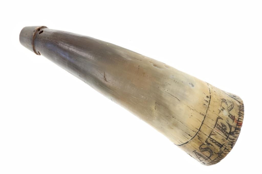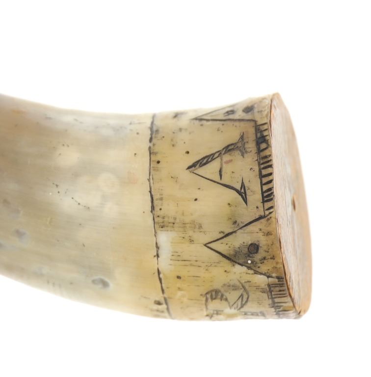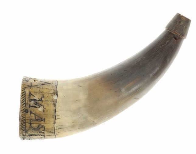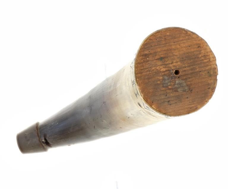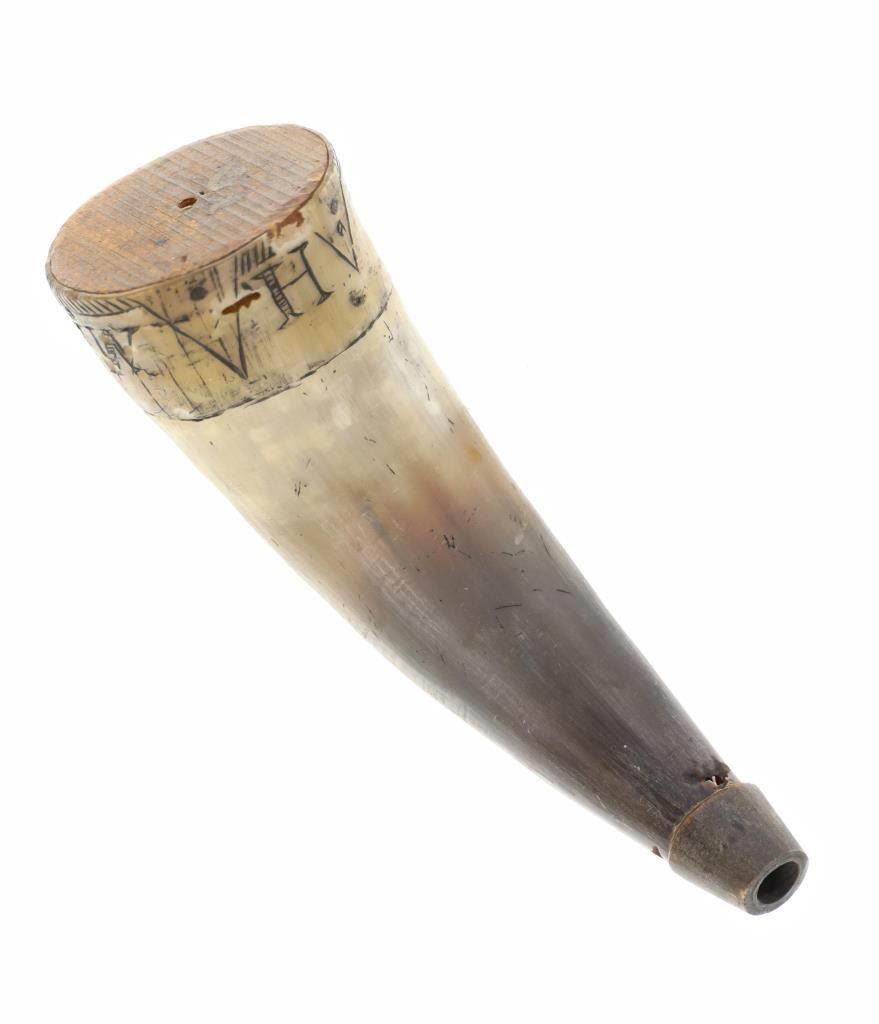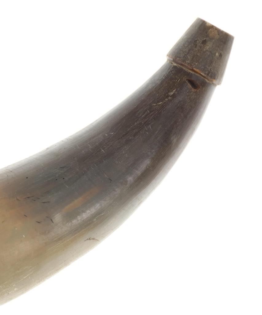 For your consideration is this beautiful scrimshaw steer horn powder flask early to mid 1800's. The powder horn shows scrimshaw at the base of the horn reading, "A H Master" while the tip features a finely crafted beveled design with a carved raised ridge. The base cap is held into place by five brass nails, keeping the contents of the powder horn, in the horn. The steer horn shows a black color towards the tip which gradually fades into a lighter beige/tan color towards the base. Overall the powder flask shows good condition overall with some wear from its age and use over the years but no obvious signs of damage are present. The diameter of the tip measures 9/16", while the base measures a diameter of 2 1/16". The length of the powder flask is 6 7/8" and it weighs 55.3 grams.