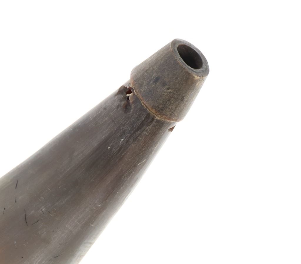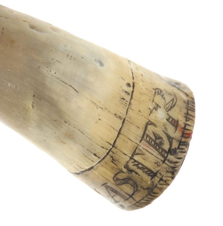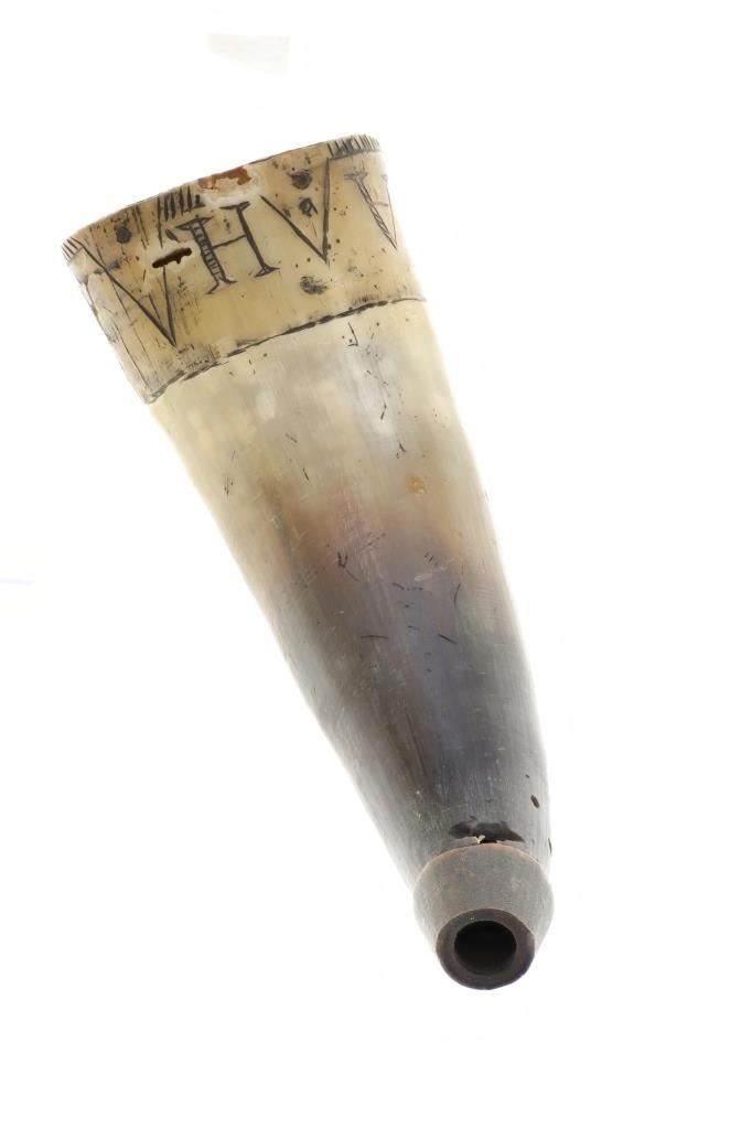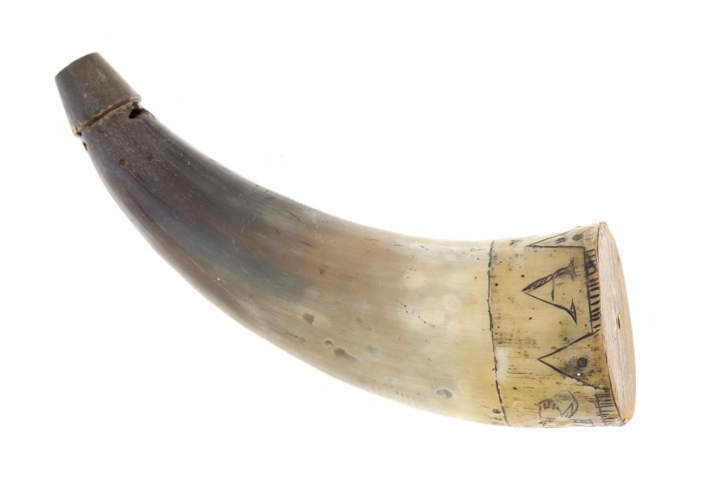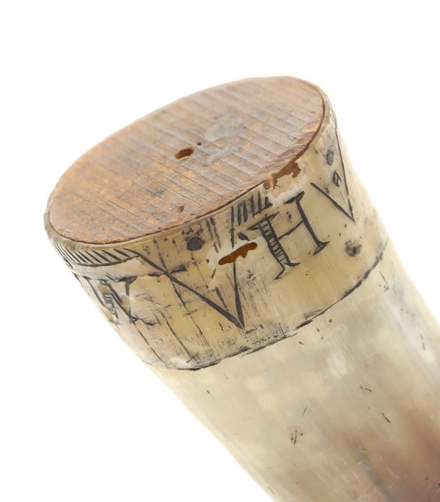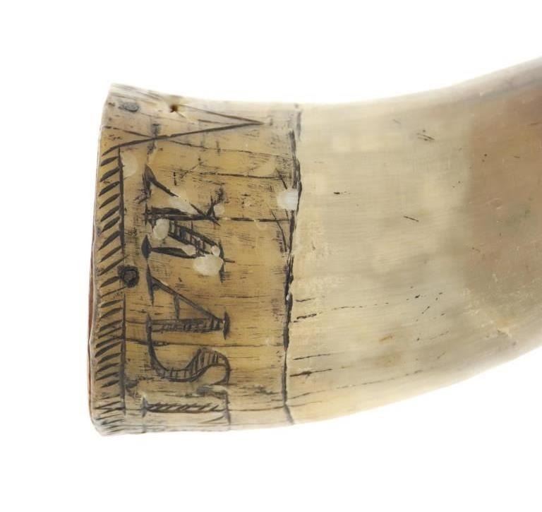 For your consideration is this beautiful scrimshaw steer horn powder flask early to mid 1800's. The powder horn shows scrimshaw at the base of the horn reading, "A H Master" while the tip features a finely crafted beveled design with a carved raised ridge. The base cap is held into place by five brass nails, keeping the contents of the powder horn, in the horn. The steer horn shows a black color towards the tip which gradually fades into a lighter beige/tan color towards the base. Overall the powder flask shows good condition overall with some wear from its age and use over the years but no obvious signs of damage are present. The diameter of the tip measures 9/16", while the base measures a diameter of 2 1/16". The length of the powder flask is 6 7/8" and it weighs 55.3 grams.