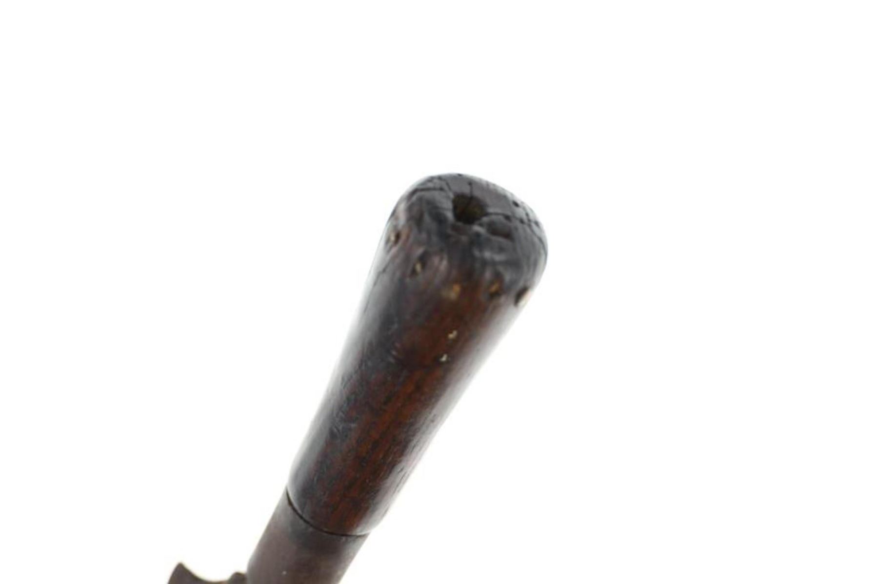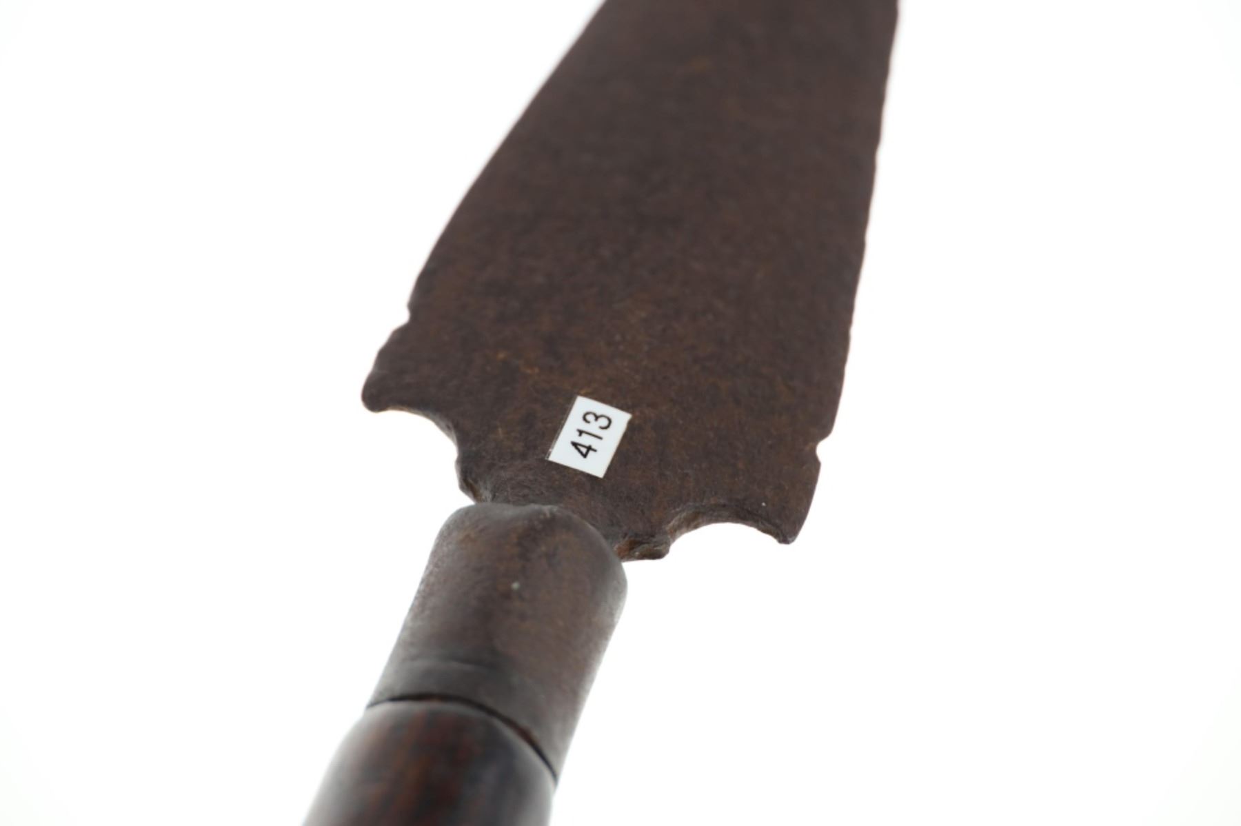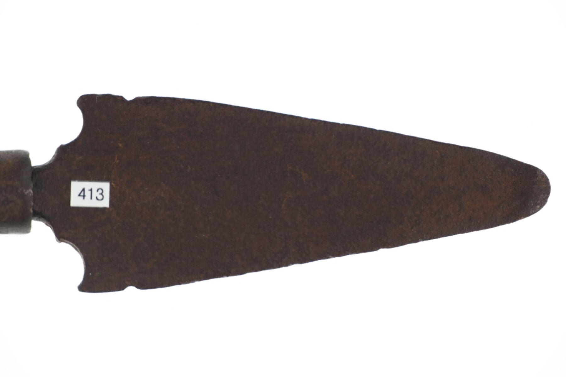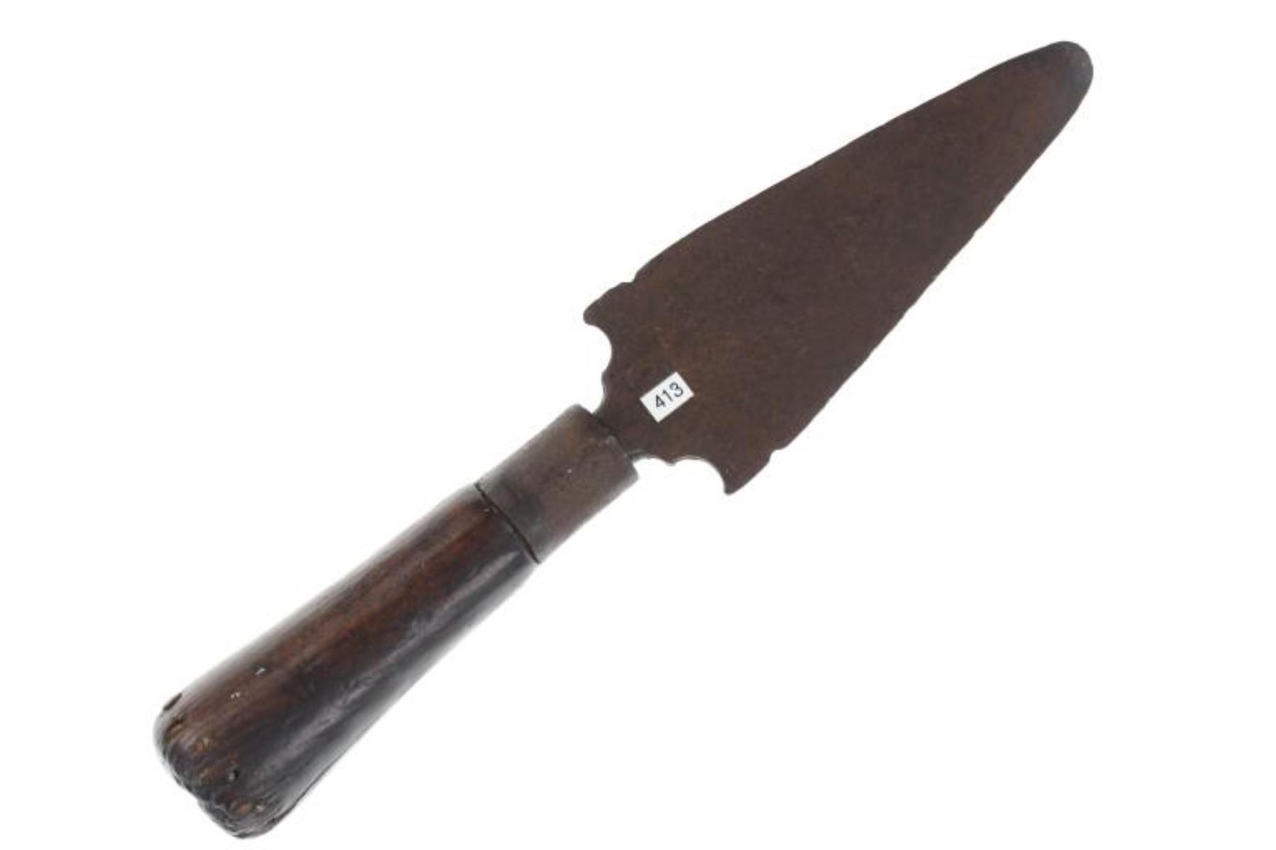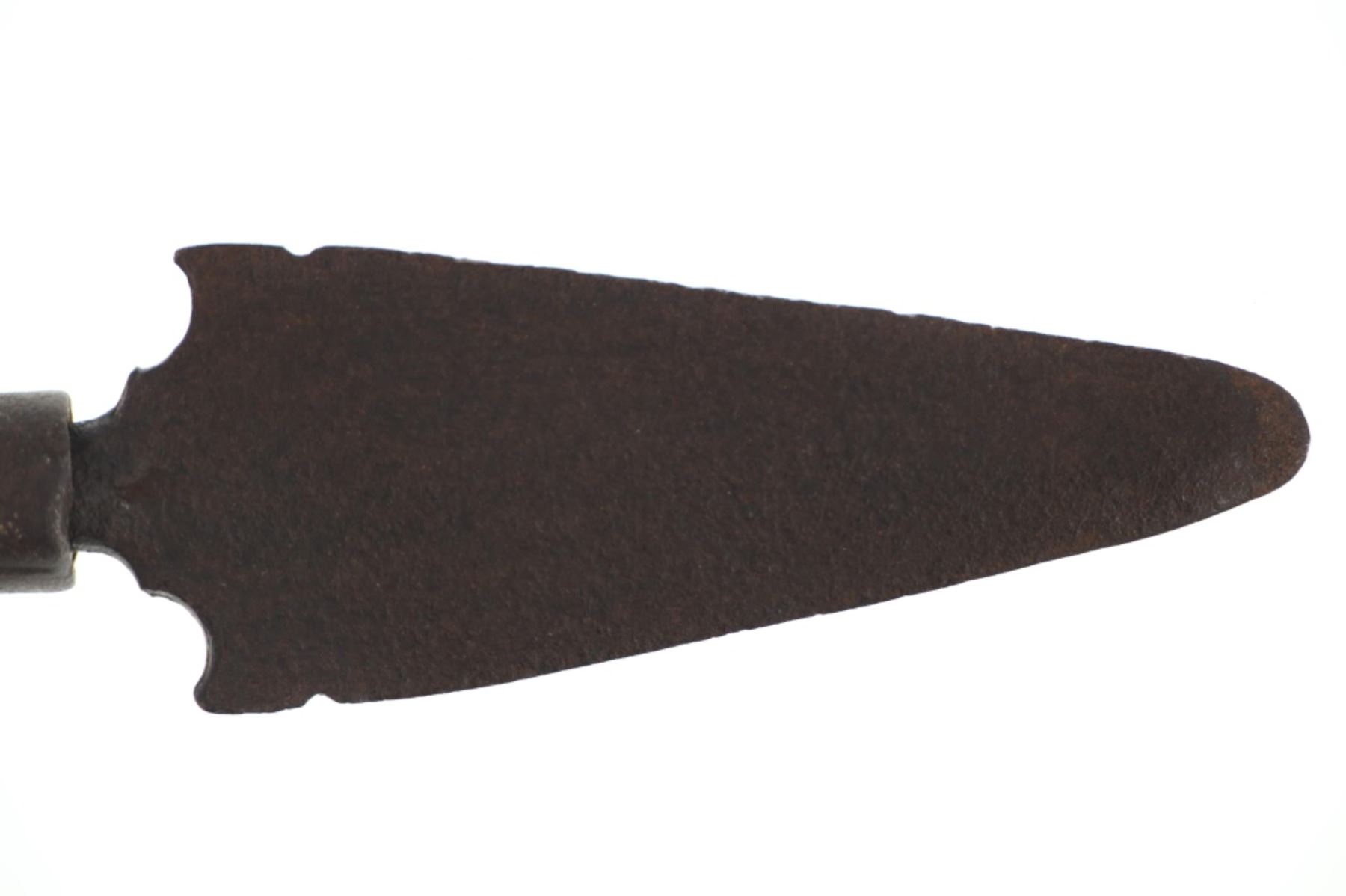 The lot features a truly scarce, Comanche dagger fighting dag knife from the ex-collection of Dan Wasko and Jeb Taylor. The piece has a Spanish Colonial lance spear head with one piece solid wood handle adorned with solid brass square shank small early 19th-century trade tack band at the base. The blade shows a thicker median body with double edge lance head blade having downward cirle and notched bottom with artful iron work just above the hilt. The hilt has an iron wrapping. Blades from the Comanche of the Southern Plains, escpecially during this era of their Indian Wars, are very scarce. This blade has nice original patina and wear and is well preserved. Provenance: From the ex-collection of Dan Wasko and Jeb Taylor. Measures overall 9.28-incehs long, blade protrudes 4 7/8-inches from the hilt and is 1 7/8-inches wide.