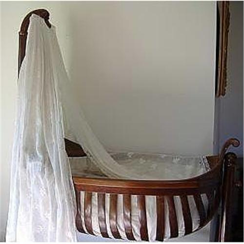 ***FREE DELIVERY WITHIN THE ATLANTA, GEORGIA AND SURROUNDING AREA*** Magnificent French Empire Cradle with original Batiste Bedding. The mouth of the long neck swan holds the fabric rod and would have been draped over end of cradle to protect child from insects and such. All batiste fabric is hand embroidered and shows some sign of wear, which is to be expected. Finding an empire cradle with original fabric is such a treat! There are no missing slats, cradle rocks back and forth but will need some added bolts and re securing a bit before using.