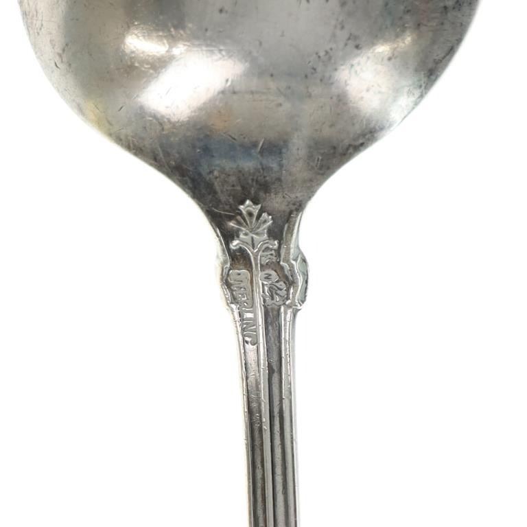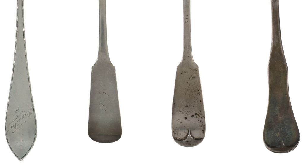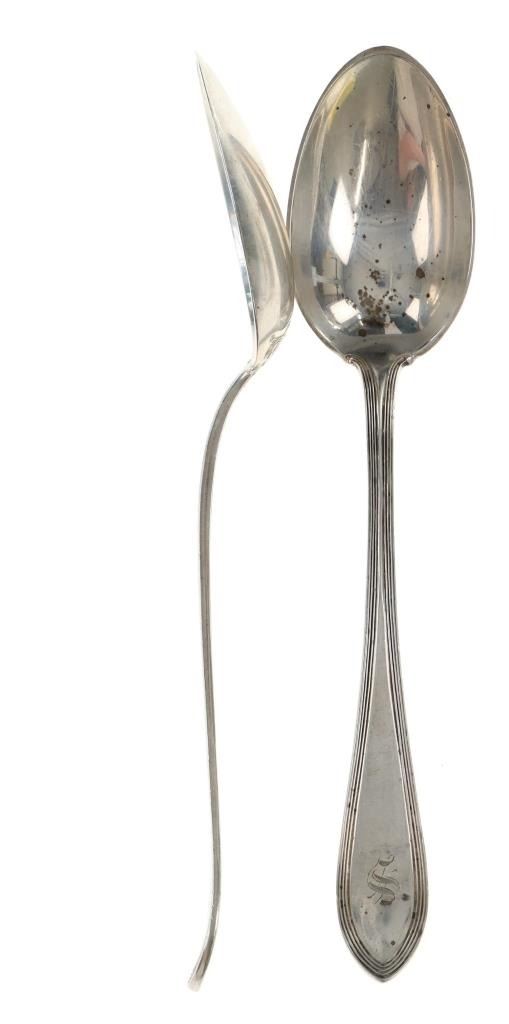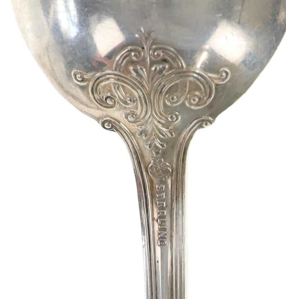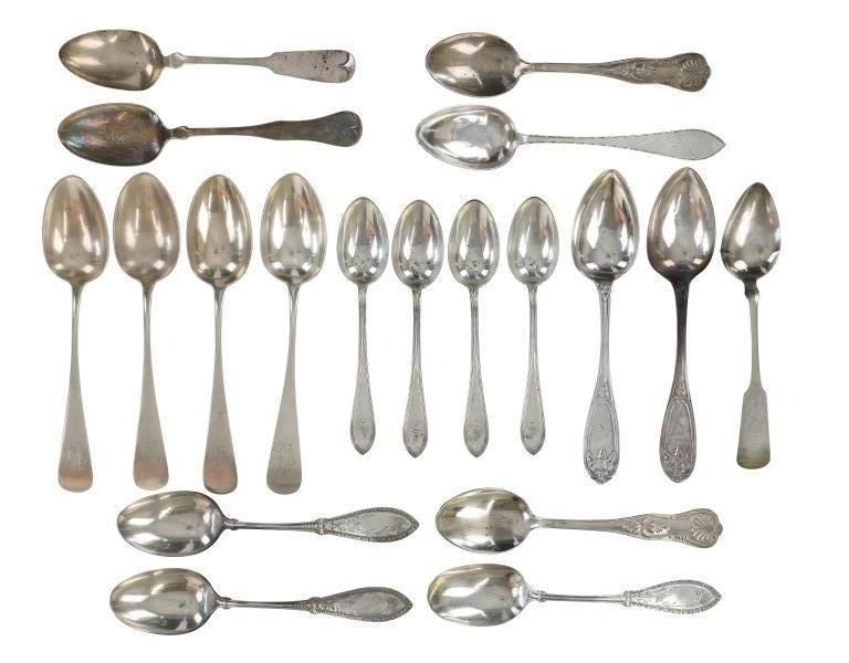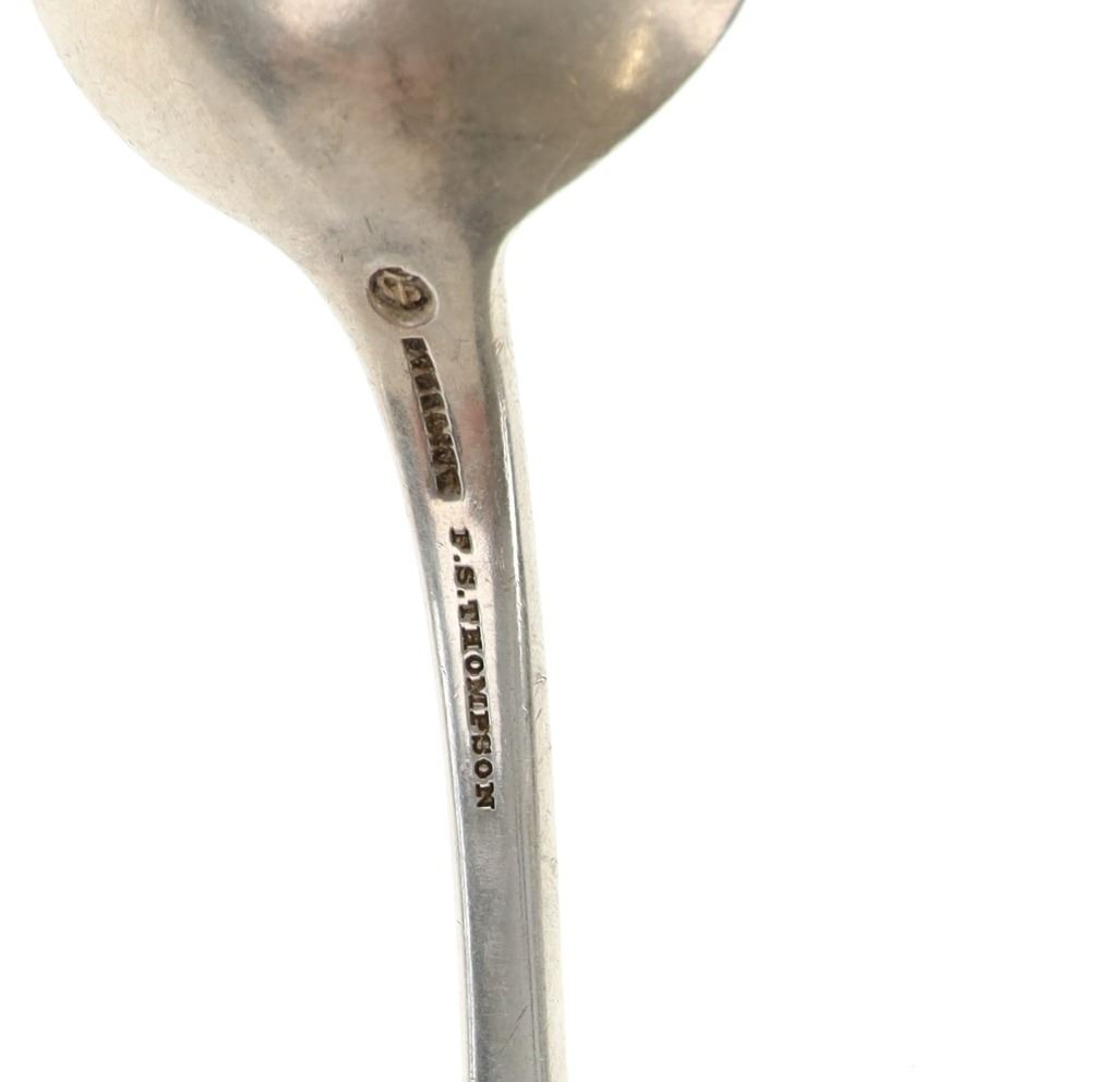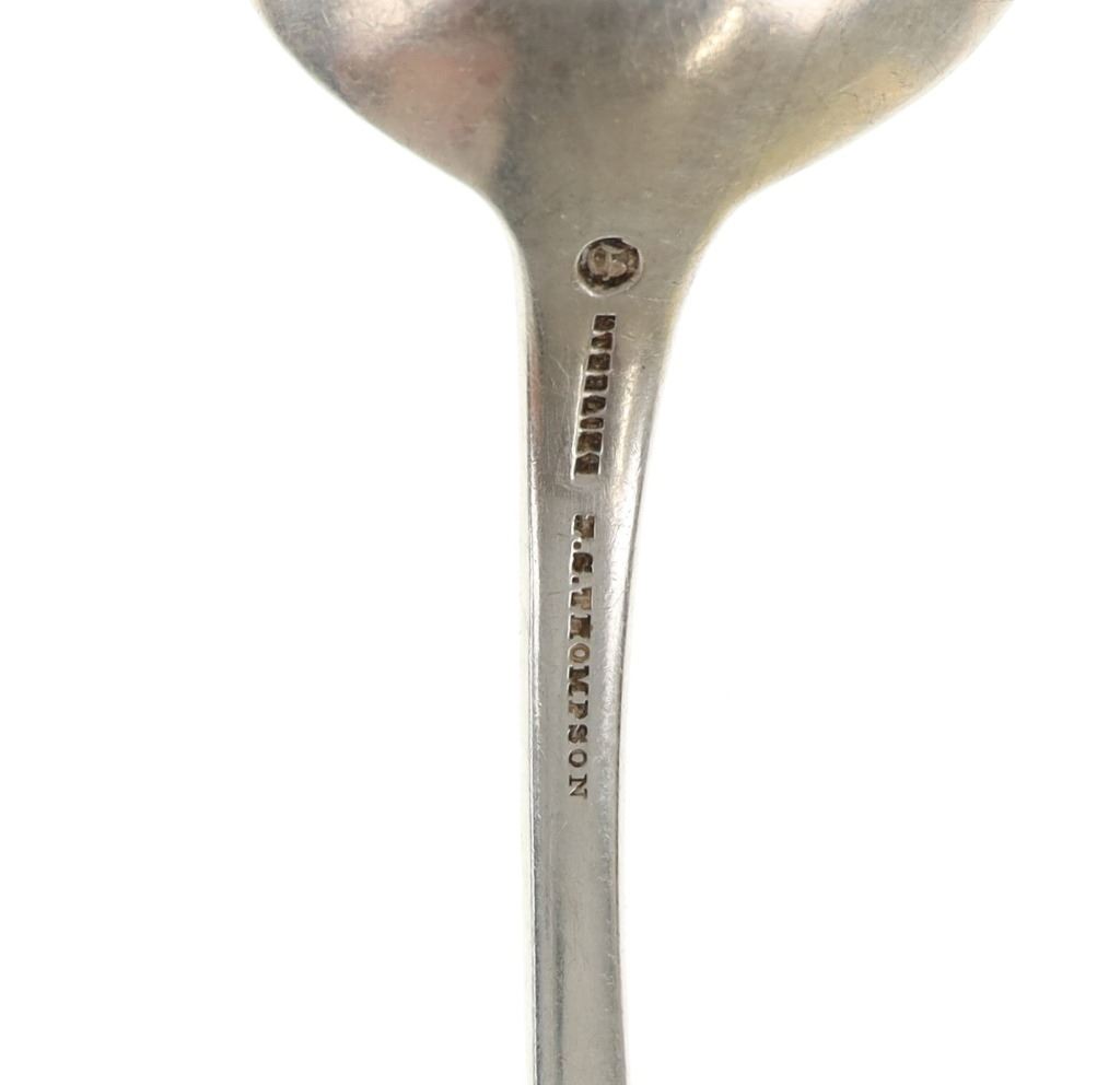 For your consideration are nineteen large, sterling spoons from various makers circa 1840-1970s. The first set of spoons in this collection were made by F. S. Thompson circa 1870-1890s in Belgium. The spoons show a polished sterling construction with engravings on the top of the handles. The bottom of the necks show a Belgium stamp as well as the makers stamp reading, "Sterling F. S. Thompson". The next set of spoons are two made by J. H. James circa 1910-1930s. The two spoons show a simple design on the neck of the spoon with initials on the top of the handle reading, "MF". The bottom of the neck also shows a simple design with leaves extruding onto the bottom of the bowl. On the neck it reads, "J. H. Thompson, Columbia". The next spoon in this lot was made by P. A. Lie Jewelers in 1904 and is .830 sterling. The spoon shows an embossed design on the outer edge of the handle white the top of the handle reads, "Augustine". The bottom of the handle reads, "P.A. Lie 83CS / 28-4-1904".The next set of three spoons were made in Holland circa 1900-1920s. The spoons shows ornate floral designs on the handles and a large bowl. The back of the necks show a simple design and feature Holland stamps and "Sterling" reading on the neck. The tips of the bowls show some slight wear. The next two spoons in this collection are also a set and were made by the Italian silversmith company, Alessio Cesa & Company circa 1960-1970s. The spoons show a simple, yet elegant design on the top of the handle with stampings seen on the bottom of the neck. The stampings read, "ARG 800 X". The next set of four spoons show no makers mark but are stamped sterling on the back of the necks. The spoons shows a simple line design on the outer edge of the the neck with initials or a design on the top of the handle. The seventeenth spoon in this collection was made by Walter Pitkin in Hartford, Connecticut circa 1840-60s. He was a partner from 1830 to 1840 with John Pitkin, his brother, in East Hartford CT as J. O. & W. PITKIN. In 1840 John retired and Walter worked from 1840 to 1860 as a silversmith and jeweler in East Hartford CT after his brother's retirement, continuing the company until the factory was destroyed by fire. Walter passed away on September 12th, 1885 in Hartford, CT. The spoon shows a polished coin silver construction with no designs present. The top of the handle shows initials reading, "AD", while the bottom of the neck is stamped reading, "W. Pitkin / Root x Chaffee". The eighteenth spoon in this lot features a sterling construction but shows no makers marks. The spoon shows a small, simple stamped design on the top of the handle and the letter "F". The bottom of the neck shows a small stamp and reads, "Sterling". The final spoon in this collection was made by William A. Rogers circa 1910-1930s. The spoon features a silver plate construction and shows no designs on the spoon. the back of the neck shows stampings reading, "Wm. A. Rogers A1". The spoons in this collection show good condition overall with wear from their age and use over the years. The spoons show varying degrees of patinas but no signs of obvious damage are present. The spoons measure from 8 5/8" L x 1 13/16" W to 7 1/16" L x 1 7/16" W. The collective weight of the spoons is 1020.7 grams (1.02 kilograms).