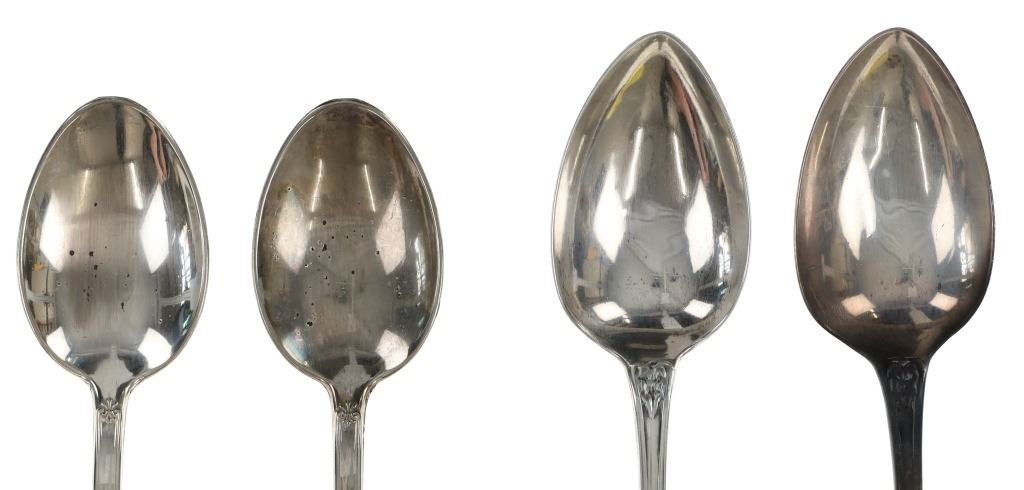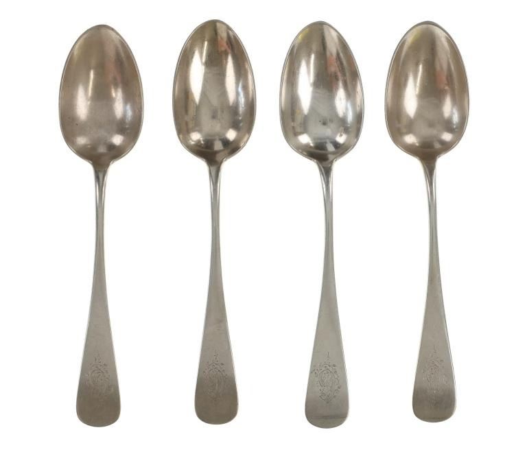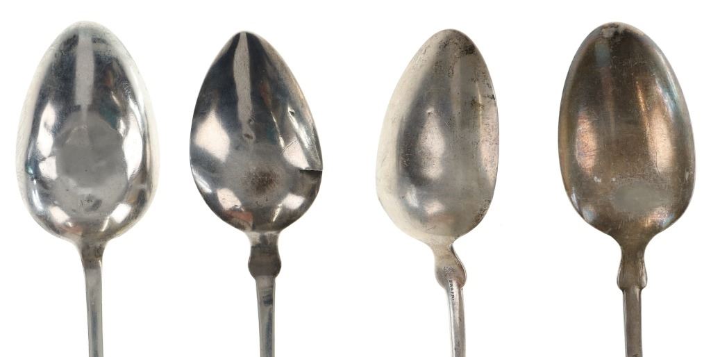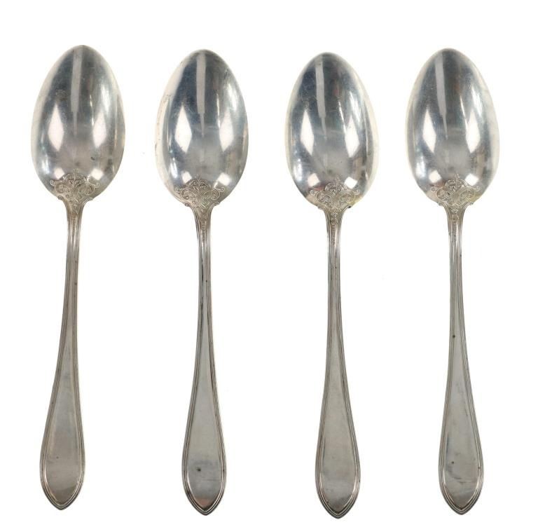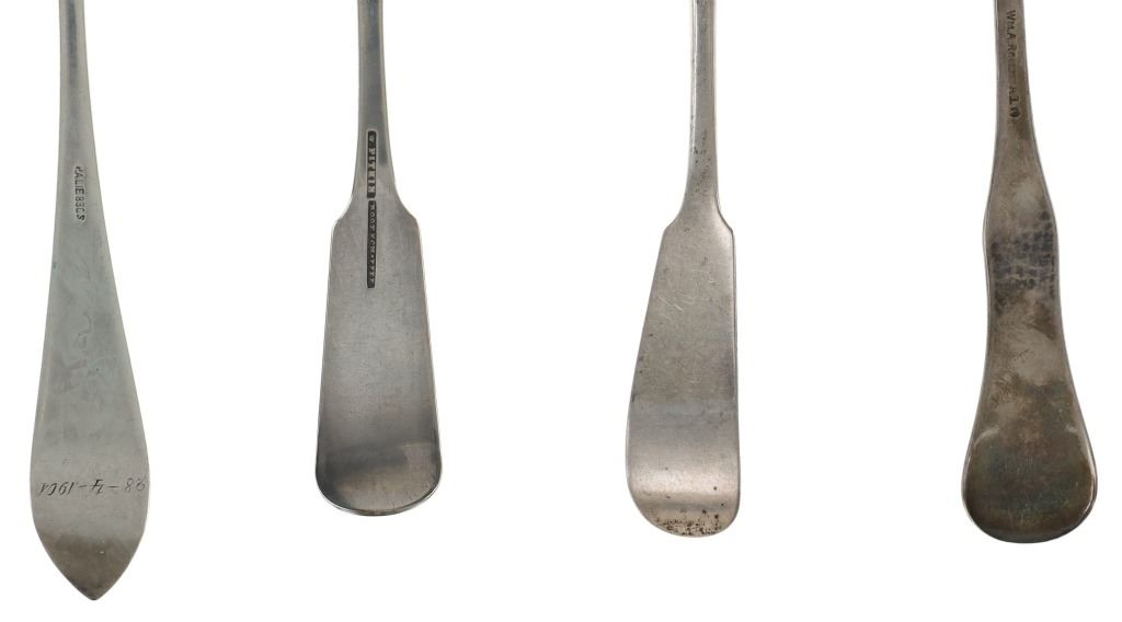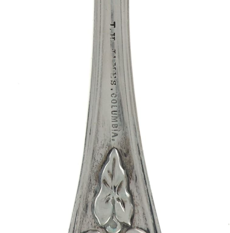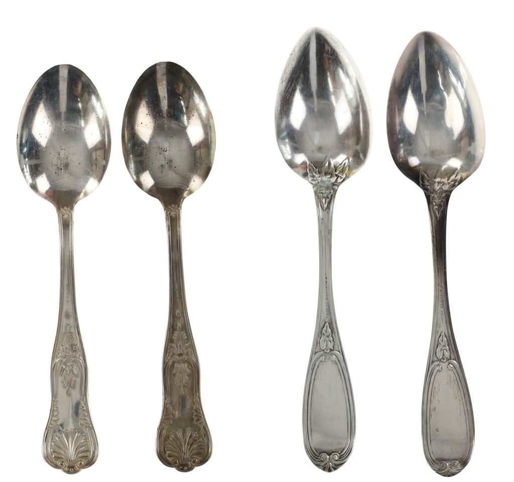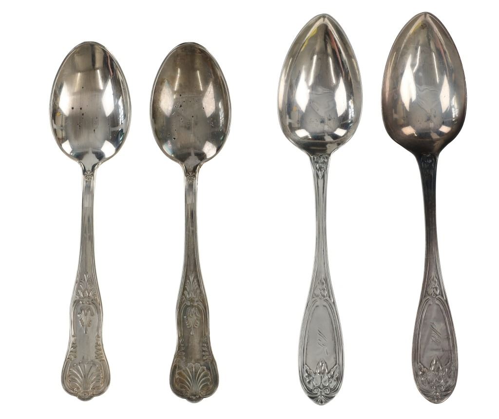 For your consideration are nineteen large, sterling spoons from various makers circa 1840-1970s. The first set of spoons in this collection were made by F. S. Thompson circa 1870-1890s in Belgium. The spoons show a polished sterling construction with engravings on the top of the handles. The bottom of the necks show a Belgium stamp as well as the makers stamp reading, "Sterling F. S. Thompson". The next set of spoons are two made by J. H. James circa 1910-1930s. The two spoons show a simple design on the neck of the spoon with initials on the top of the handle reading, "MF". The bottom of the neck also shows a simple design with leaves extruding onto the bottom of the bowl. On the neck it reads, "J. H. Thompson, Columbia". The next spoon in this lot was made by P. A. Lie Jewelers in 1904 and is .830 sterling. The spoon shows an embossed design on the outer edge of the handle white the top of the handle reads, "Augustine". The bottom of the handle reads, "P.A. Lie 83CS / 28-4-1904".The next set of three spoons were made in Holland circa 1900-1920s. The spoons shows ornate floral designs on the handles and a large bowl. The back of the necks show a simple design and feature Holland stamps and "Sterling" reading on the neck. The tips of the bowls show some slight wear. The next two spoons in this collection are also a set and were made by the Italian silversmith company, Alessio Cesa & Company circa 1960-1970s. The spoons show a simple, yet elegant design on the top of the handle with stampings seen on the bottom of the neck. The stampings read, "ARG 800 X". The next set of four spoons show no makers mark but are stamped sterling on the back of the necks. The spoons shows a simple line design on the outer edge of the the neck with initials or a design on the top of the handle. The seventeenth spoon in this collection was made by Walter Pitkin in Hartford, Connecticut circa 1840-60s. He was a partner from 1830 to 1840 with John Pitkin, his brother, in East Hartford CT as J. O. & W. PITKIN. In 1840 John retired and Walter worked from 1840 to 1860 as a silversmith and jeweler in East Hartford CT after his brother's retirement, continuing the company until the factory was destroyed by fire. Walter passed away on September 12th, 1885 in Hartford, CT. The spoon shows a polished coin silver construction with no designs present. The top of the handle shows initials reading, "AD", while the bottom of the neck is stamped reading, "W. Pitkin / Root x Chaffee". The eighteenth spoon in this lot features a sterling construction but shows no makers marks. The spoon shows a small, simple stamped design on the top of the handle and the letter "F". The bottom of the neck shows a small stamp and reads, "Sterling". The final spoon in this collection was made by William A. Rogers circa 1910-1930s. The spoon features a silver plate construction and shows no designs on the spoon. the back of the neck shows stampings reading, "Wm. A. Rogers A1". The spoons in this collection show good condition overall with wear from their age and use over the years. The spoons show varying degrees of patinas but no signs of obvious damage are present. The spoons measure from 8 5/8" L x 1 13/16" W to 7 1/16" L x 1 7/16" W. The collective weight of the spoons is 1020.7 grams (1.02 kilograms).