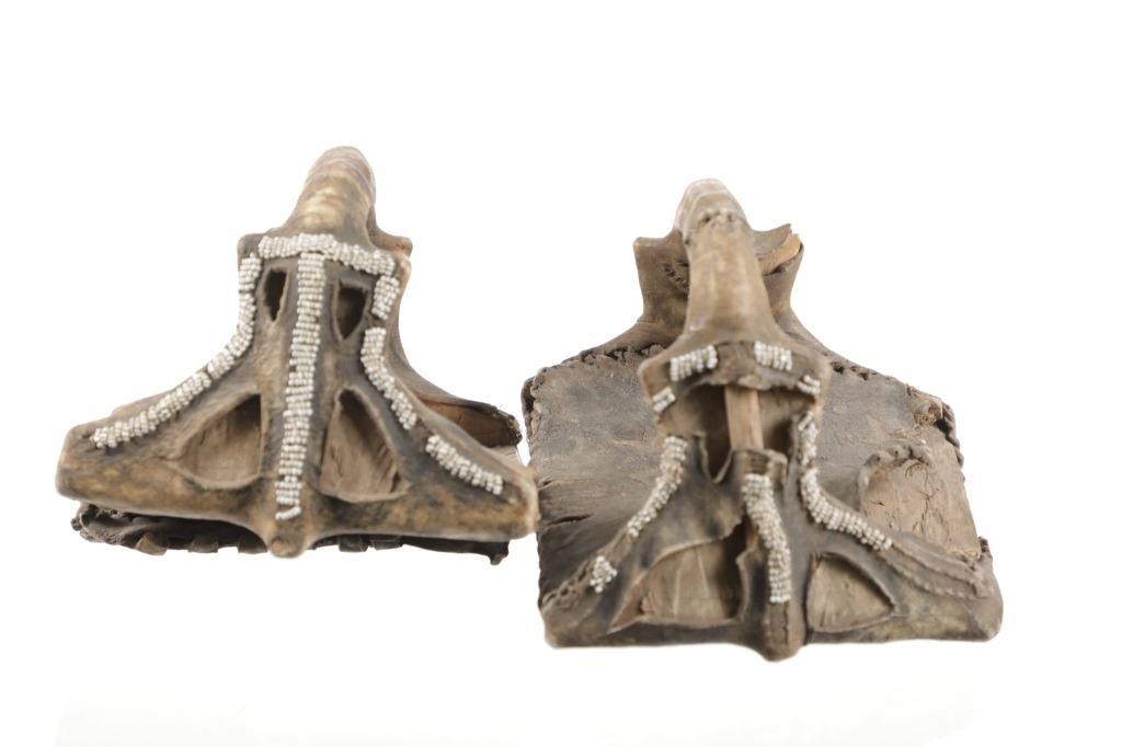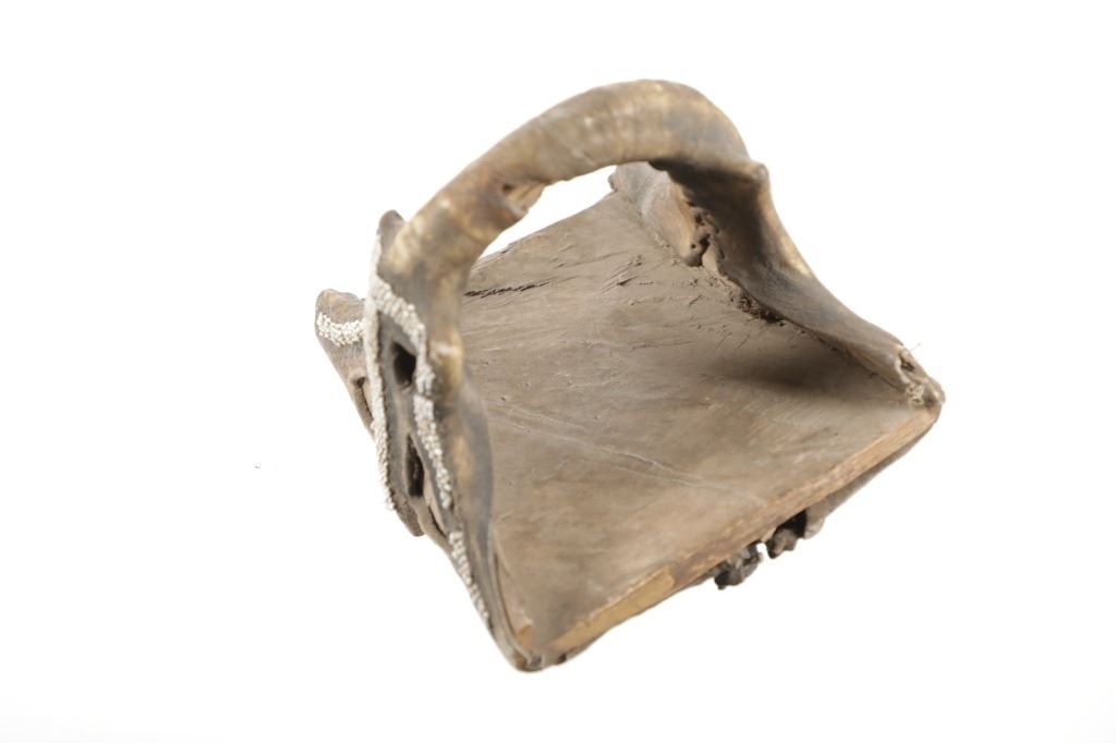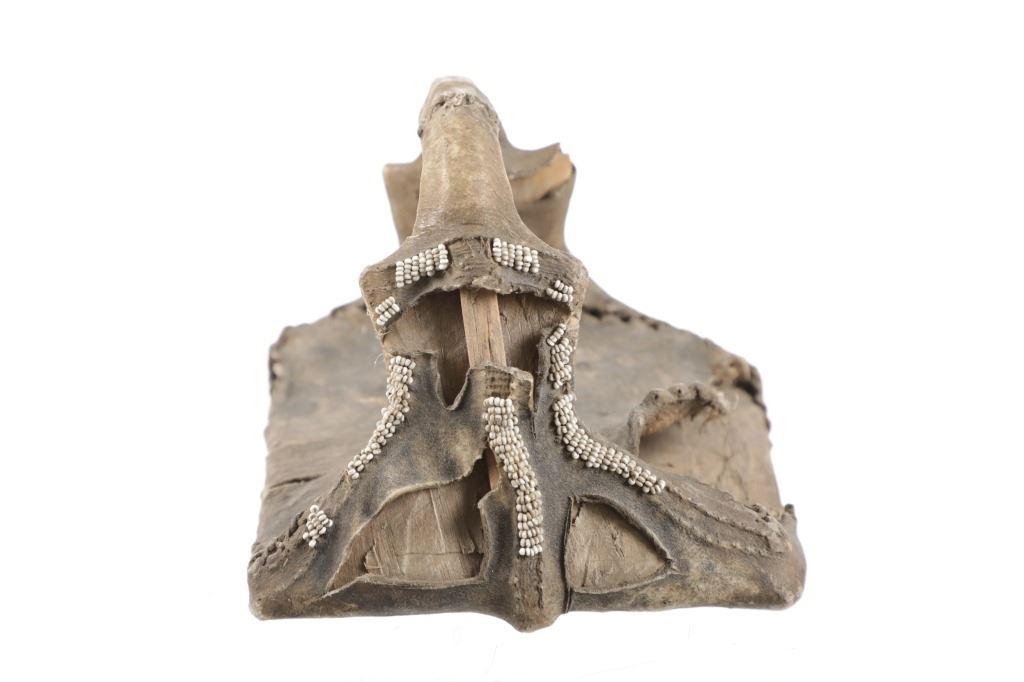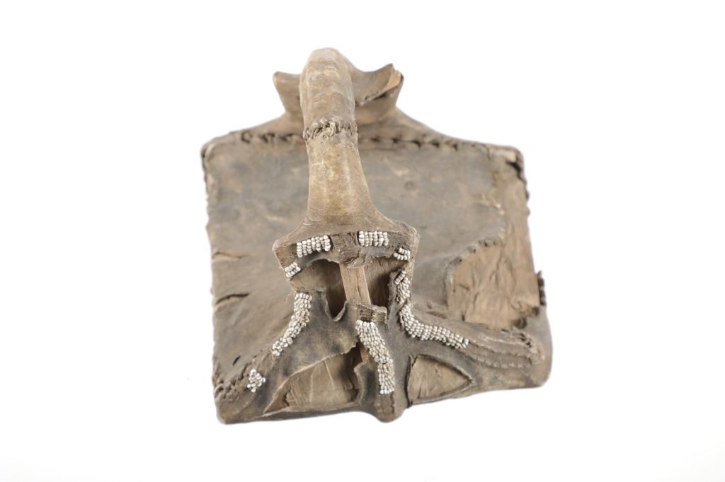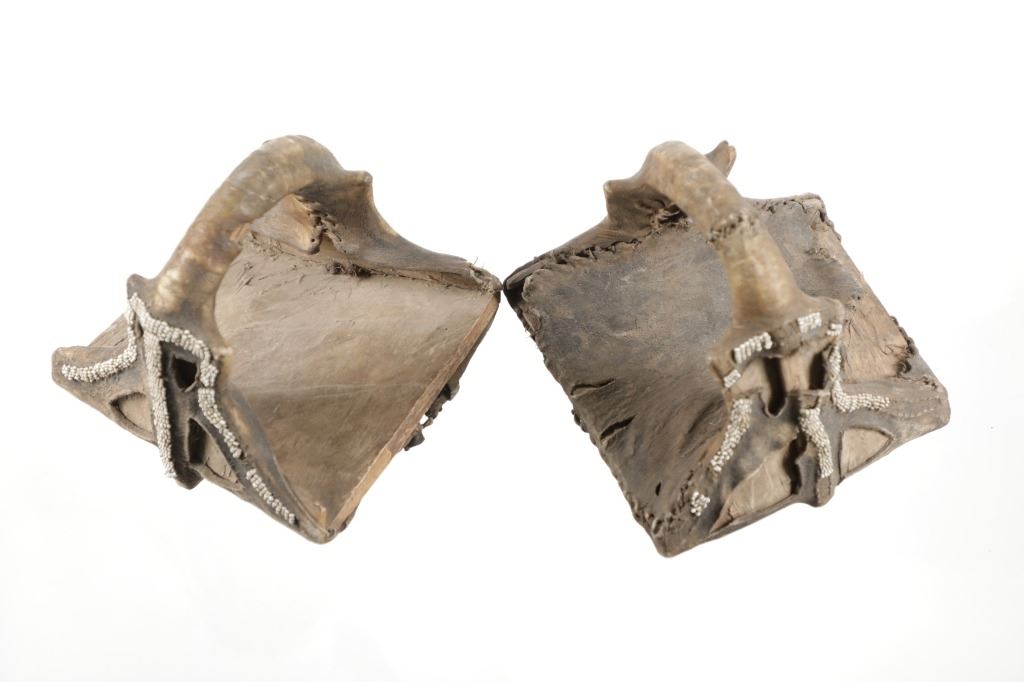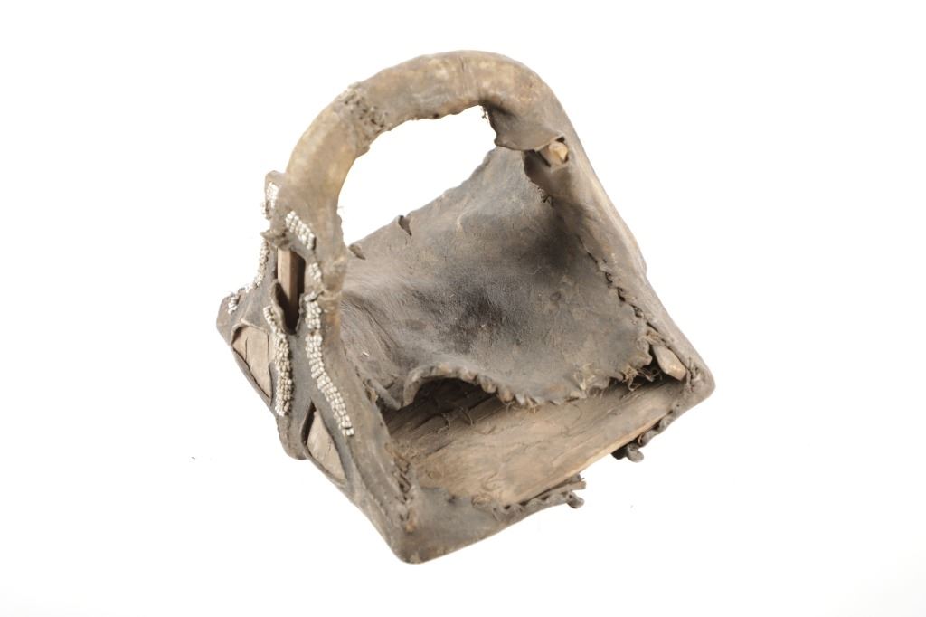 The lot includes a beautiful set of circa 1860's Southern Plains rawhide wrapped wood saddle stirrups with beadwork from the Apache. The set shows a carved wood construction which are completely wrapped in rawhide parfleche which are sinew and rawhide lacing sewn. The outside edges of the stirrups shows a cut out or incised design, which has been documented as being a pattern used in saddle blankets and saddle bags from the Apache of the Indian Wars era. The set also shows sinew sewn beadwork showing bands of chalk white glass trade seed beads, of the 19th-century early age. The set shows a nice patina and dark coloring. There is some separation and wear from its very early age and well used condition, but these are truly historic and rare which very few of these being in museum or private collections. For example of a similar pattern of stirrups see the set in the Penn Museum marked as being Apache from Oklahoma near Rio Grande. These are one of the only example of early Apache stirrups with incised cutouts and beadwork that have been offered to the public. Each measures 6-inches wide by 5.5-inches high by 6-inches wide. From a Bozeman, Montana collection and recovered at the same time as the Comanche saddle.