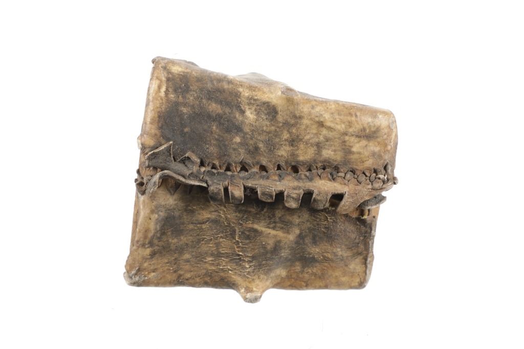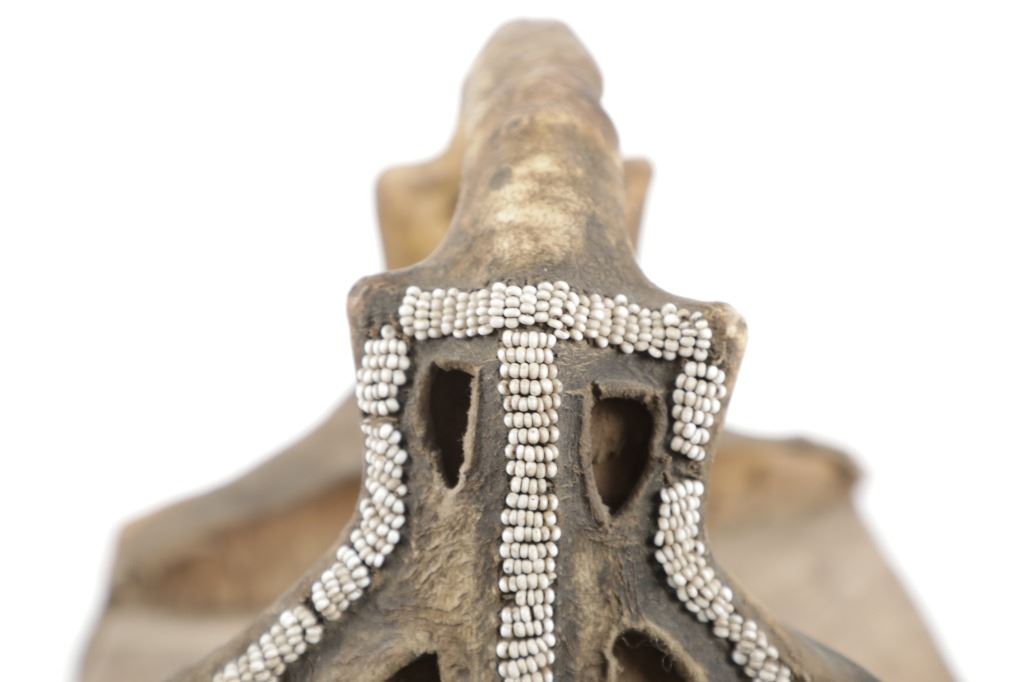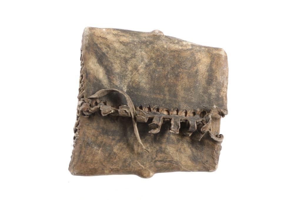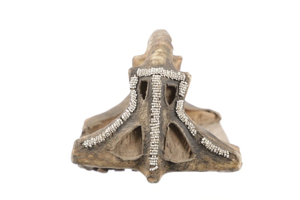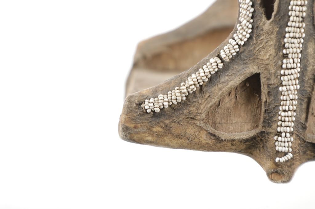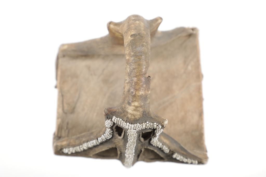 The lot includes a beautiful set of circa 1860's Southern Plains rawhide wrapped wood saddle stirrups with beadwork from the Apache. The set shows a carved wood construction which are completely wrapped in rawhide parfleche which are sinew and rawhide lacing sewn. The outside edges of the stirrups shows a cut out or incised design, which has been documented as being a pattern used in saddle blankets and saddle bags from the Apache of the Indian Wars era. The set also shows sinew sewn beadwork showing bands of chalk white glass trade seed beads, of the 19th-century early age. The set shows a nice patina and dark coloring. There is some separation and wear from its very early age and well used condition, but these are truly historic and rare which very few of these being in museum or private collections. For example of a similar pattern of stirrups see the set in the Penn Museum marked as being Apache from Oklahoma near Rio Grande. These are one of the only example of early Apache stirrups with incised cutouts and beadwork that have been offered to the public. Each measures 6-inches wide by 5.5-inches high by 6-inches wide. From a Bozeman, Montana collection and recovered at the same time as the Comanche saddle.