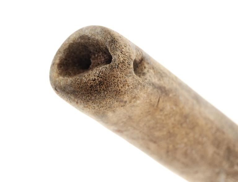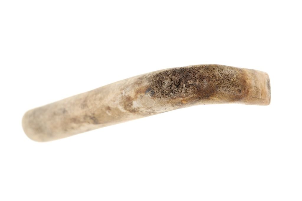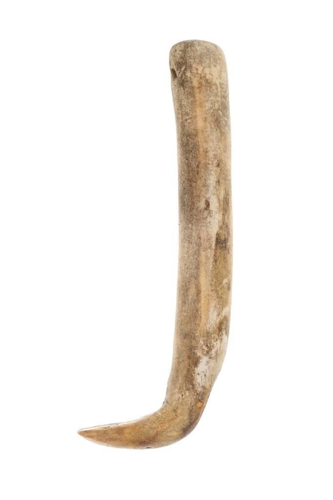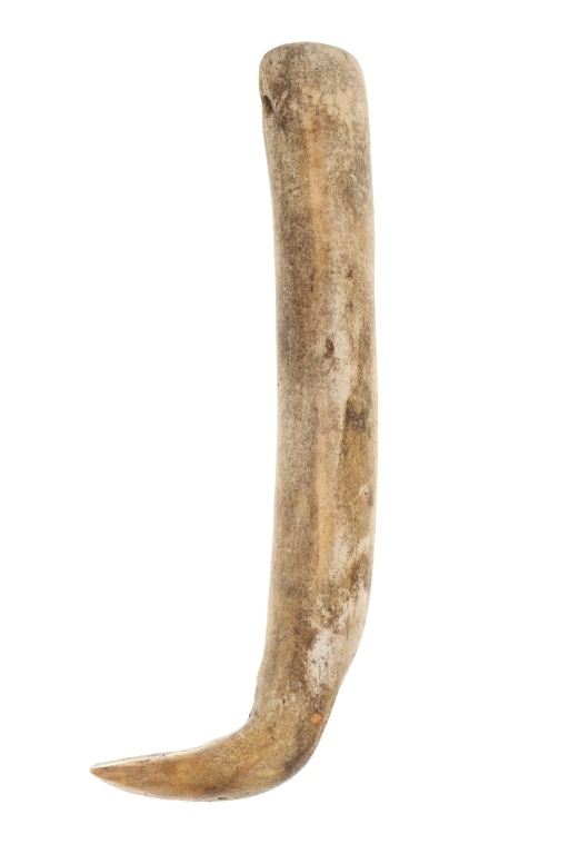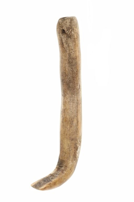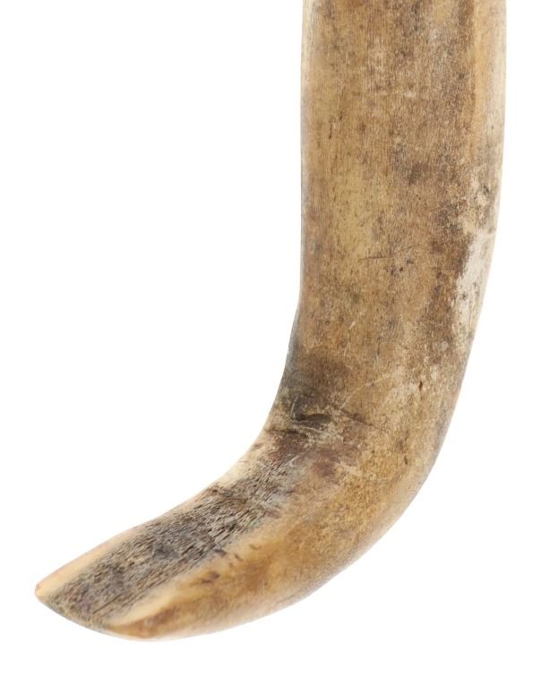 The lot features an excellent Buffalo bone hide scraper from the Northern Plains dating to circa 1860’s. The piece is constructed from a large Great American Bison / Buffalo bone and shows fantastic original dark to yellow patina from honest age and use in the traditional angled pattern. The piece shows various marks across it and a pierced hole at the bottom which would have held an Indian hide wrist throng. The end would have held a scraper or adze which were commonly made from stone, such as a scarper that was knapped, forged from a gun barrel or bone. This is a wonderful example with rich original patina and nice large size. Measures overall 13-inches long by 3.75-inches wide by 2-inches deep.
