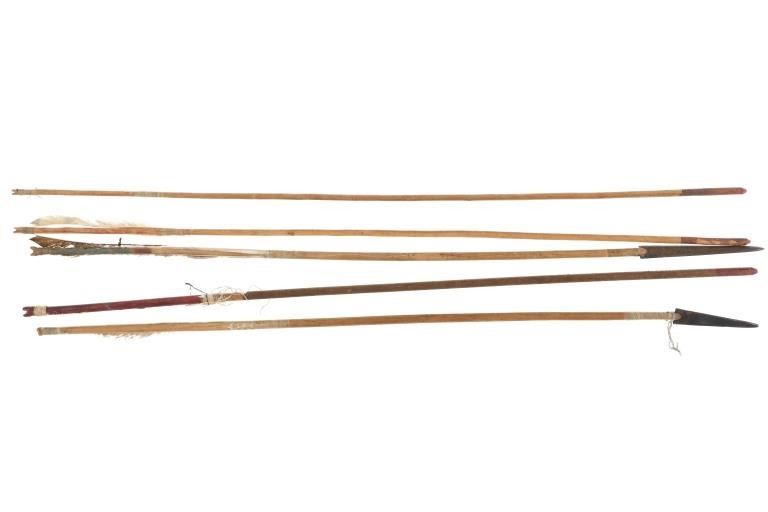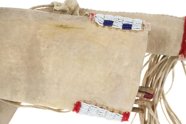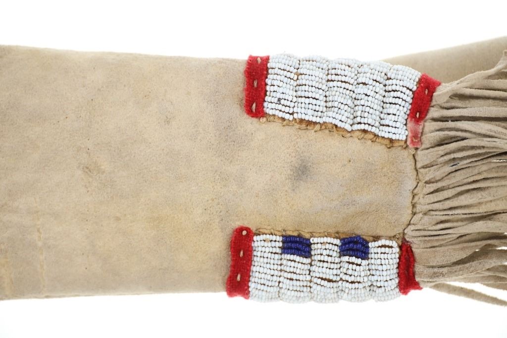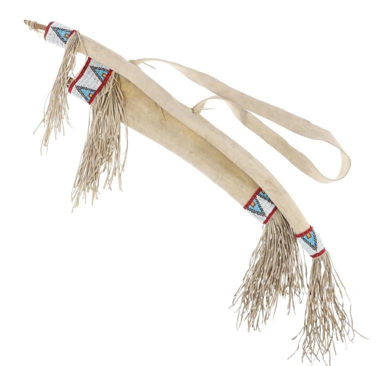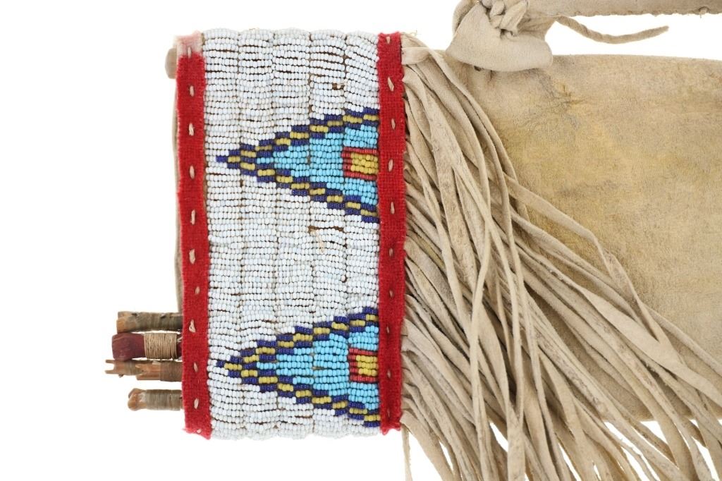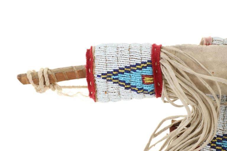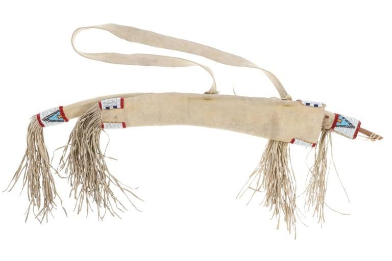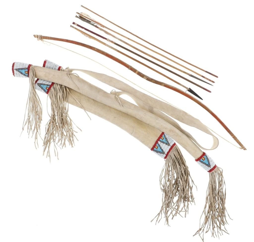 Provenance: From a prominent and noted David Pickelner and Steven Pickelner, one of the finest early beadwork collections. The bowcase and quiver are extraordinarily well preserved with nice supple hides having good coloring and little to no bead loss with stunning fringes. The bow and arrows show normal wear indicative of being well used, and likely dated to slightly before the case, circa 1860-1870’s, with the case being made for the set. Overall the set measures 58-inches long by 50-inches wide including fringes. The bow by itself measures 39.5-inches long and the arrows are about 25.5-inches.