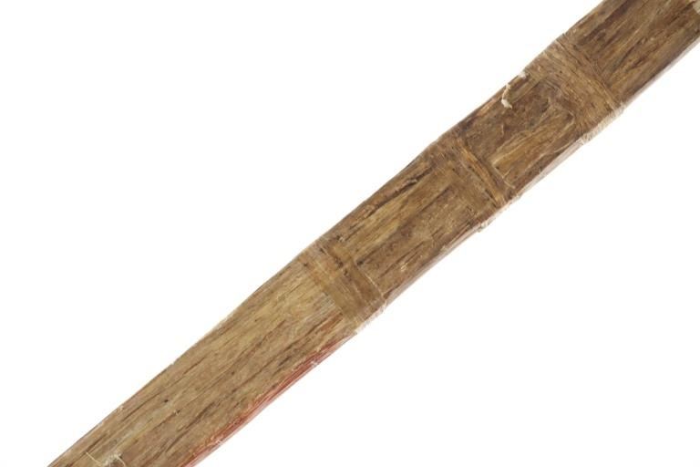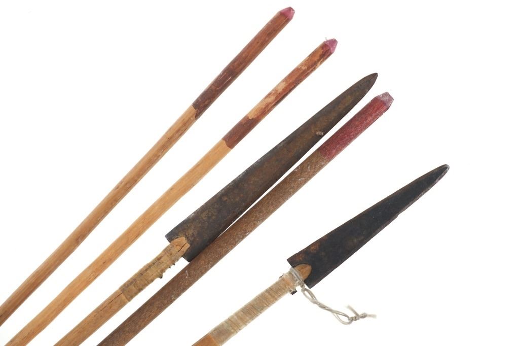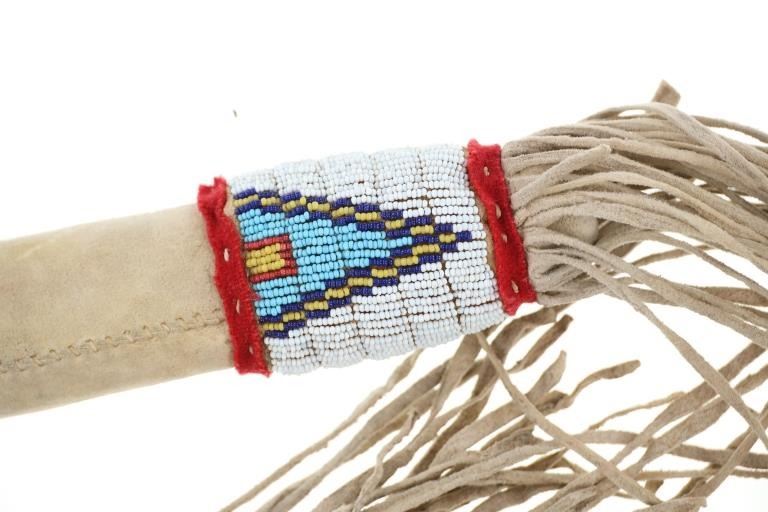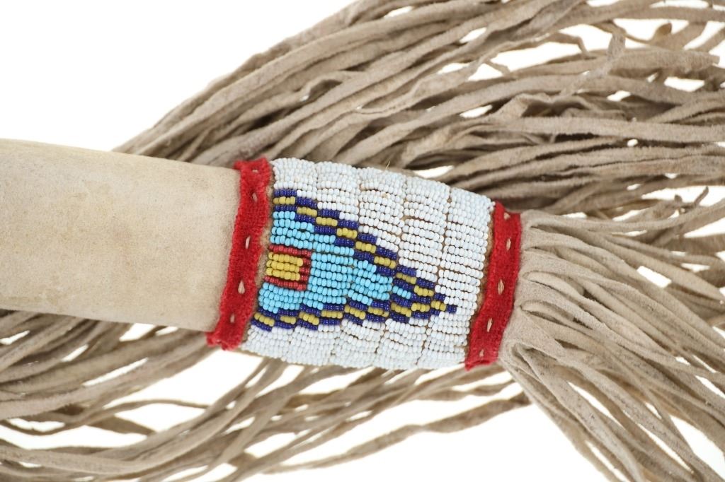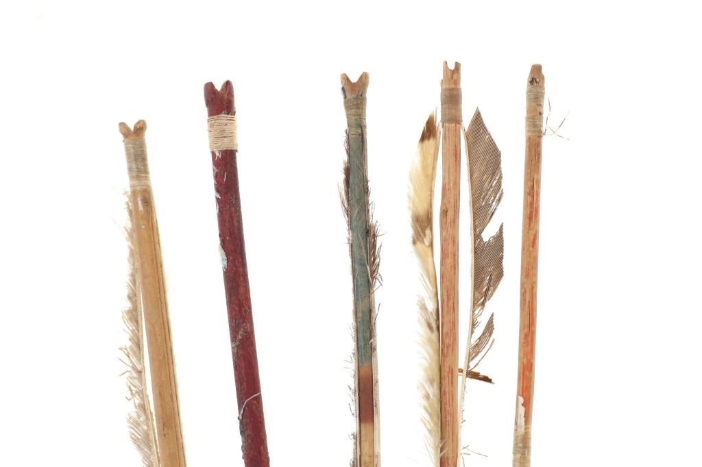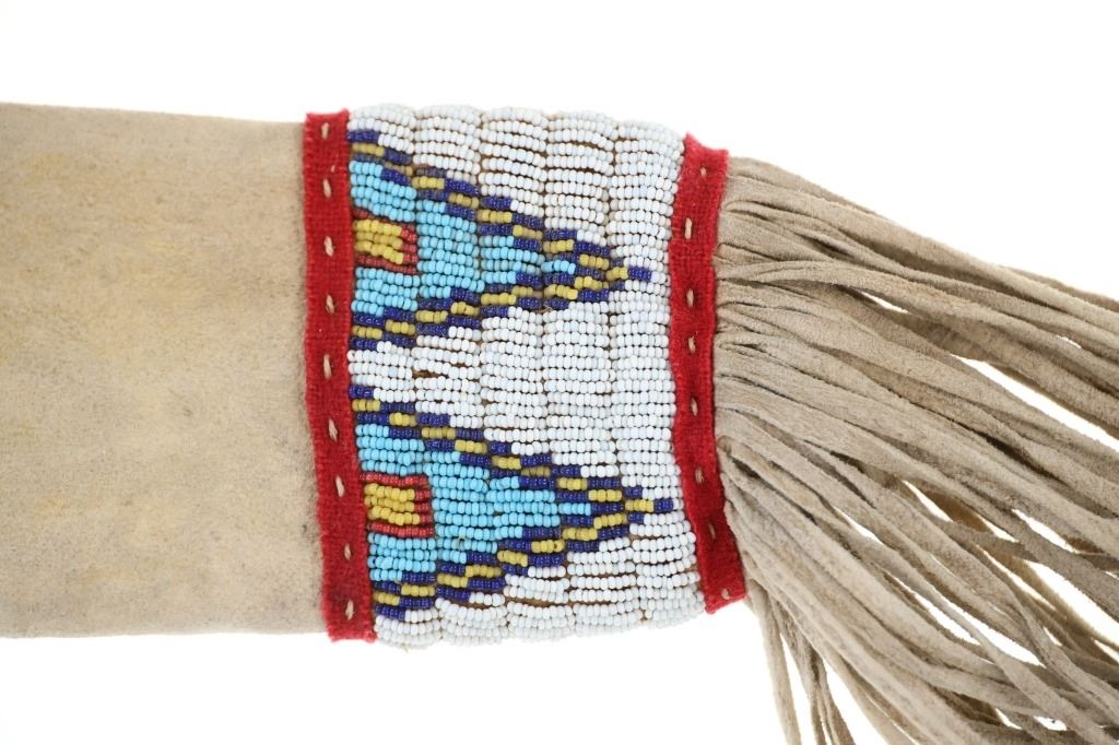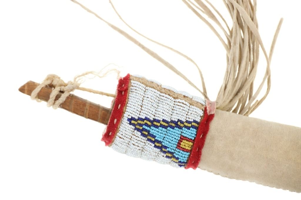 This is an exceptional circa 1870-1880’s buffalo Indian hide beaded bowcase and quiver from the Arapaho from the ex-collection of Steven and David Pickelner. The lot features a bowcase, quiver that are paired with original arrows and a bow. The bowcase and quiver is comprised of Indian tanned Buffalo / Bison hide with four prominent fully beaded sections on the ends and openings of both bowcase and quiver. The bag is sinew sewn and the beadwork shows classic Indian Wars era Arapaho / Arapahoe bead geometric beadwork with a prominent triangle pattern on a white background all done in 19th-century period correct glass trade seed beads. The beadwork shows colors of greasy yellow, cobalt, red white heart, light sky blue and chalk white. The beadwork sections are framed in red stroud trade clothe and both cases have amazing long frilly, impressive Indian hide fringes, as well as the original shoulder strap still intact. There are five original Arapaho 19th-century arrows included, two of which show the original iron arrowhead held into place with sinew sewing; these also shows red mineral pigment dye paint, arrow fletching that are sinew sewn and expertly carved nocks. The bow is also an original Arapaho 19th-century example, carved from hardwood with a sinew backed front an the body painted with red, yellow and black mineral pigment dye colors. The bow shows sinew wrappings and the original sinew bow string.