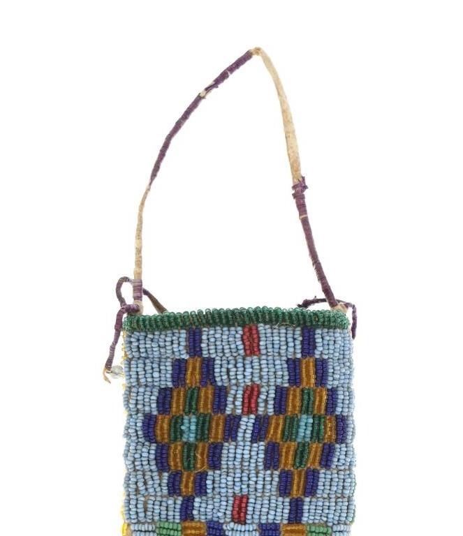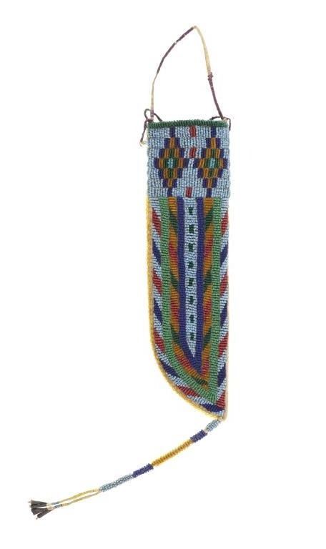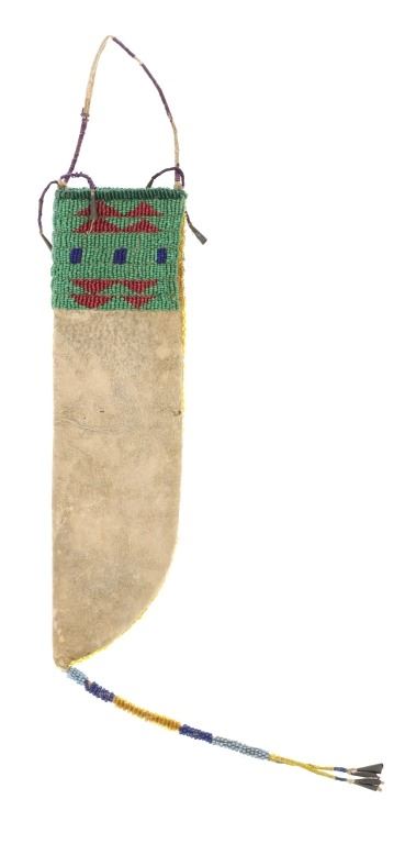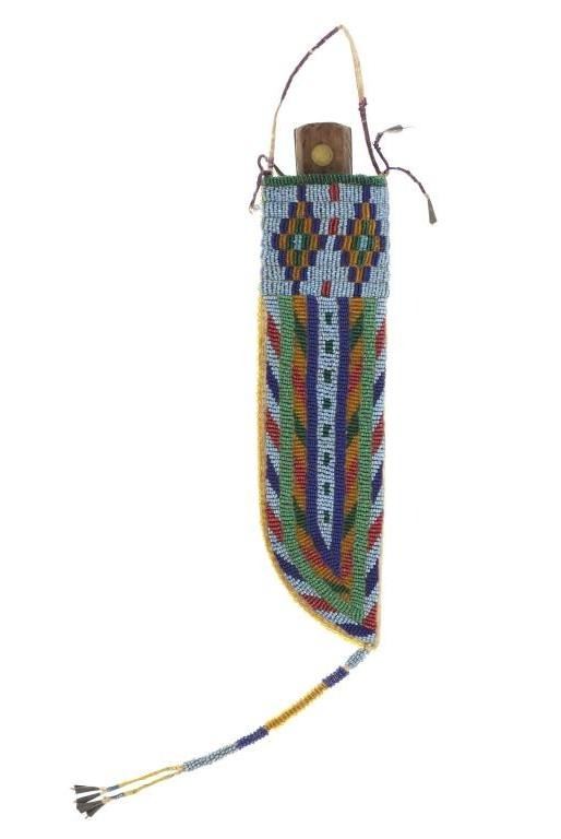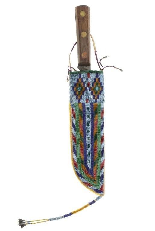 This is an outstanding Assiniboine, circa 1870s, Indian buffalo hide over a parfleche beaded sheath with original trade knife. The sheath is comprised of buffalo hide over parfleche rawhide being sinew sewn. It is covered on the front and the top portion of the back in classic Northern Plains Assiniboine of Montana geometric beadwork with period correct 19th Century glass trade seed cen beads. The beads include greasy blue, amber, red white heart, medium blue, cobalt, semi-transparent dark green. The bottom Indian hide fringe is covered in beadwork and at the end bifurcates / splits into two smaller fringes that are wrapped in porcupine quil quillwork with a natrual mineral pigment dyed yellow and blue color. At the very end are four rolled tin jingle dangle cones. The top belt strap also is wrapped in porcupine quill quillwork with two additional small fringes at each connection point also wrapped and all with natural mineral pigment purple coloring. The beadwork extends along the outside edge and back as well as the bottom fringe. The sheath is paired with a classic trade knife in skinner, sometimes referred to as a scalping knife by some collectors, with a two piece coffin style walnut hardwood handle with large brass adornments. Assiniboine sheaths are incredibly rare with this being a phenomenal example. For other similar Assiniboine sheaths, see 1870 Assiniboine Sheath with similar beadwork sold by Bonhams Skinner in May 2016 with a $2,000-$2,500 value. Also consider the 1890 Assiniboine beaded sheath by Heritage in November 2020 for $3,750. Well kept with little bead loss and slight quill loss but otherwise no major damages. Provenance: From the ex-Sarah Huber Montana collection and a private Wisconsin collection. Sheath measures overall 19"L x 3"W. Knife is 9 7/8"L.*