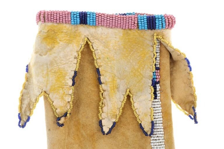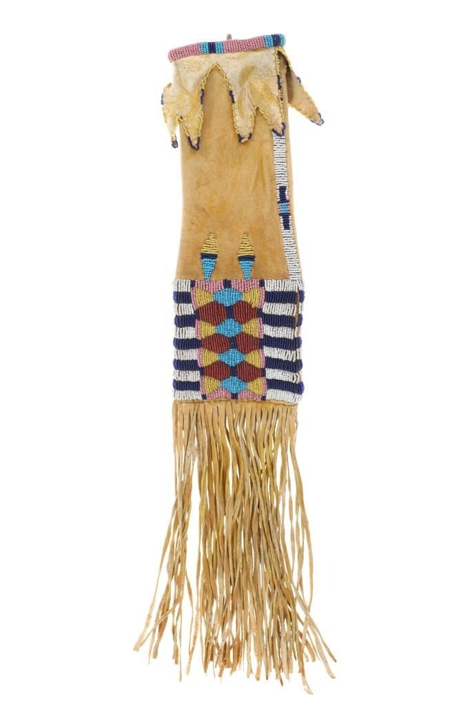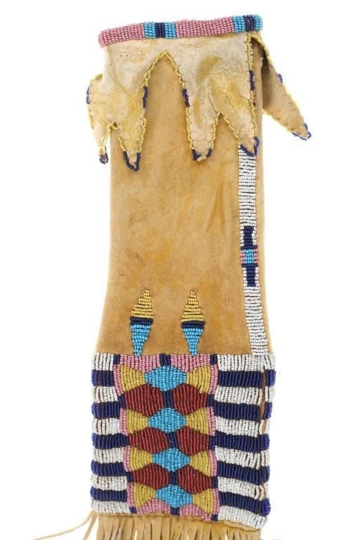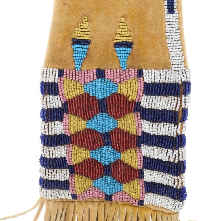 A true sale highlight, an authentic circa 1870’s Cheyenne four tab bar beaded hide pipe bag in exquisite condition and design. This is quite possibly the finest Cheyenne four tab bags ever offered for sale. The piece is comprised of Indian tanned antelope hide that is sinew sewn in a classic “Four Tab” pipe bag pattern, documented amongst the Cheyenne of the Southern Plains (Tsis tsis'tas) with a classic Cheyenne bar design. The beadwork is all period correct 1800’s glass trade seed cen beads showing colors of cobalt, chalk white, greasy white, Cheyenne pink, greasy yellow, light blue (sky padre blue), and semi-translucent rose. The bag has an original, nice yellow ocher / ochre mineral pigment coloring on the hide and fringes. The fringes are sewn with sinew on the bottom and are also Indian tanned antelope hide. The bag and fringes are well kept being mostly supple soft hide, the four tabs are also soft and shows the underside of the Indian scraped hide with a fancy sinew sewn beaded edge. The beadwork extends around the entire bag on both sides as well as up the central portion of the bag, along the tabs and a beaded rim at the opening. The bag is presented on a museum metal wall mount stand and is in nearly excellent condition. Provenance: From a prominent Northwestern collection of high end Native American antiquities. The only similar bag to this example was the Cheyenne Four Tab bag of a later 1880’s age which sold at our company for $8,572.50 (w/ bp). This example is in exquisite condition, early Indian Wars circa 1870’s age, truly astounding beadwork and unusual medium size. Overall the bag measures 21”L by 5”W.