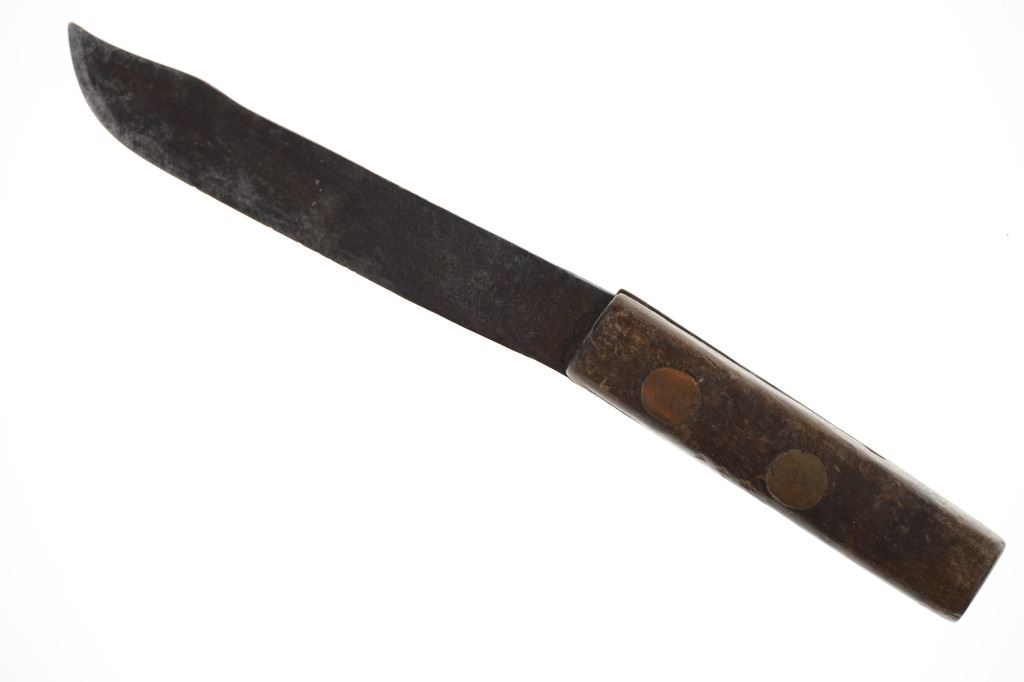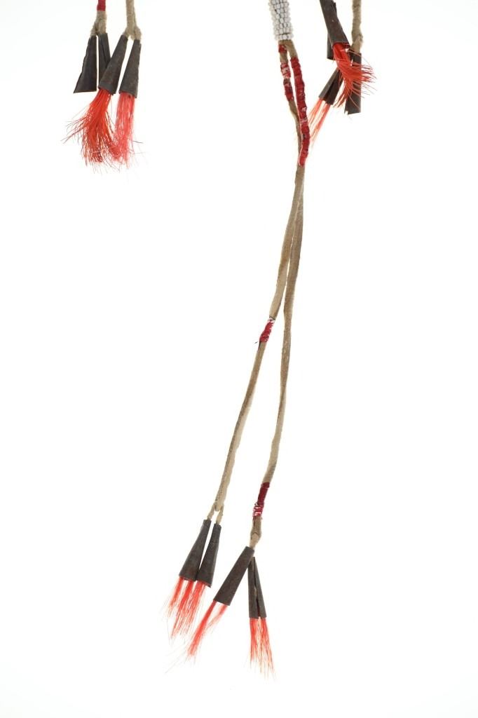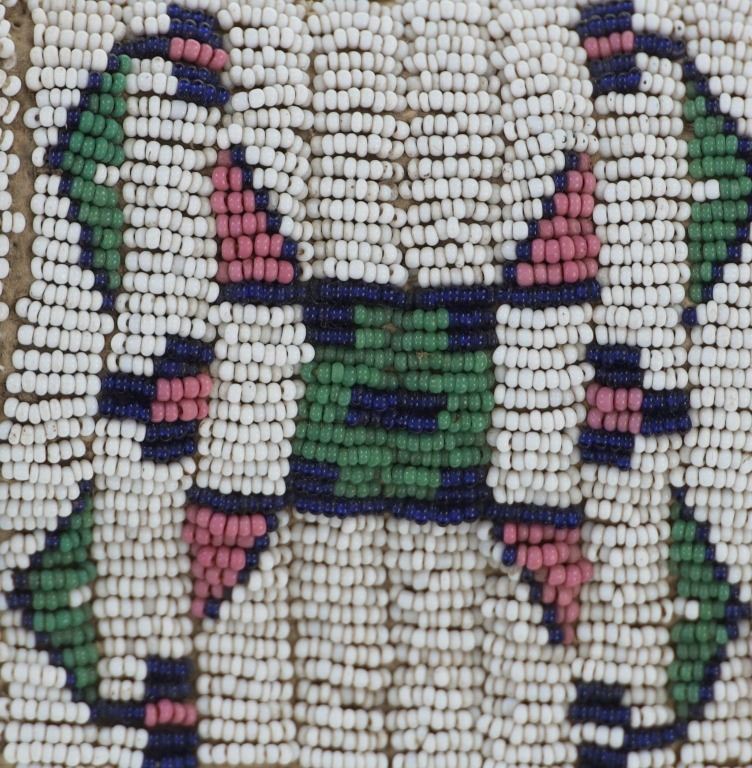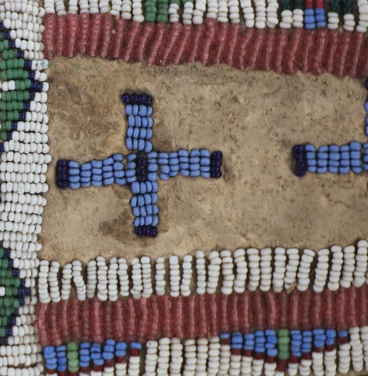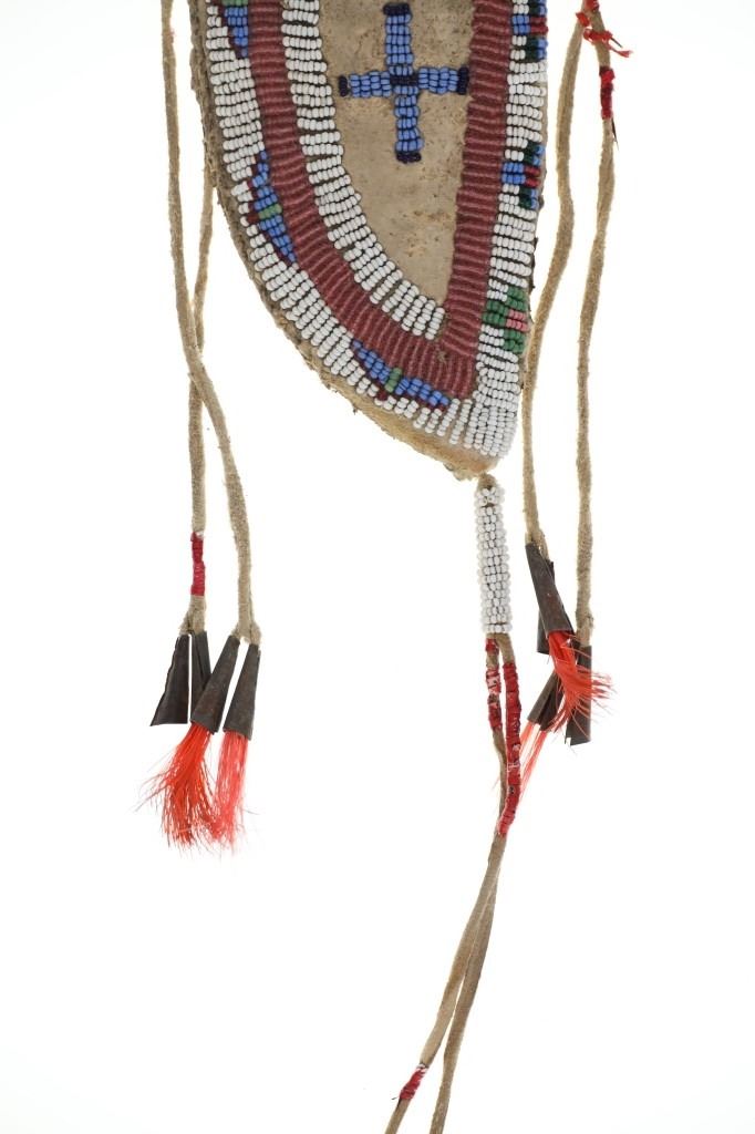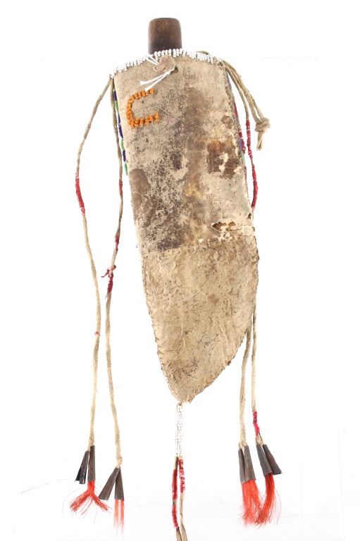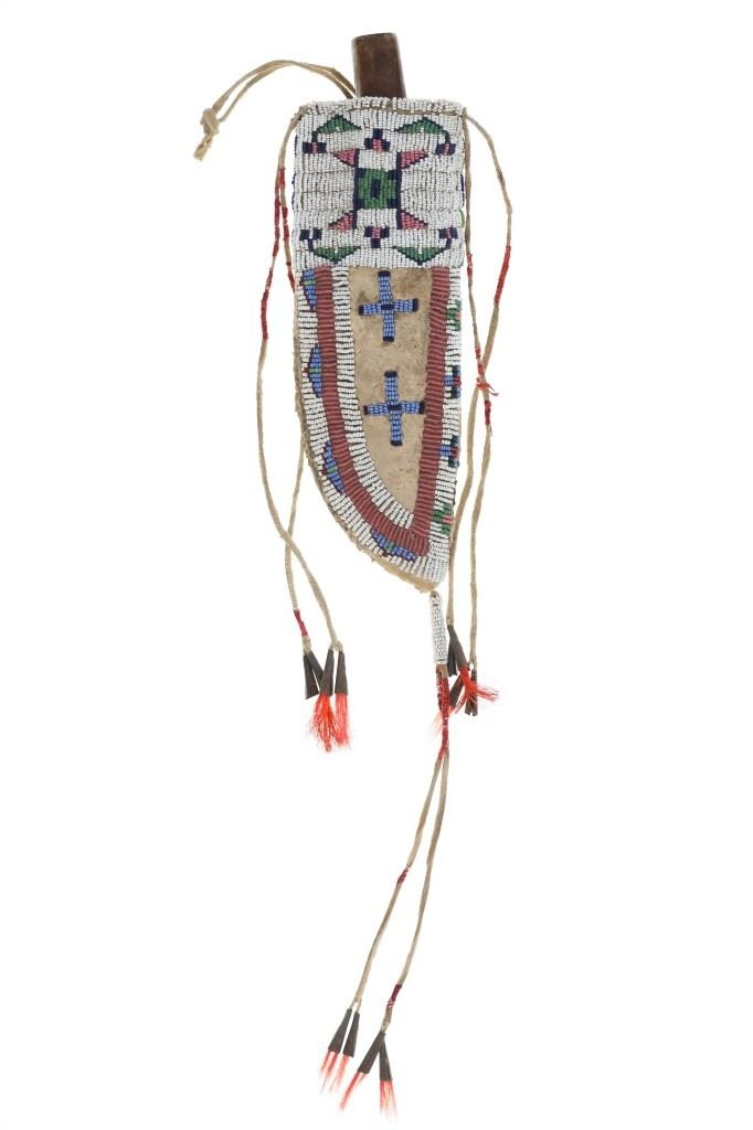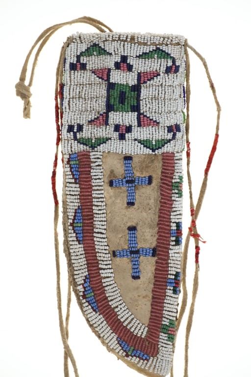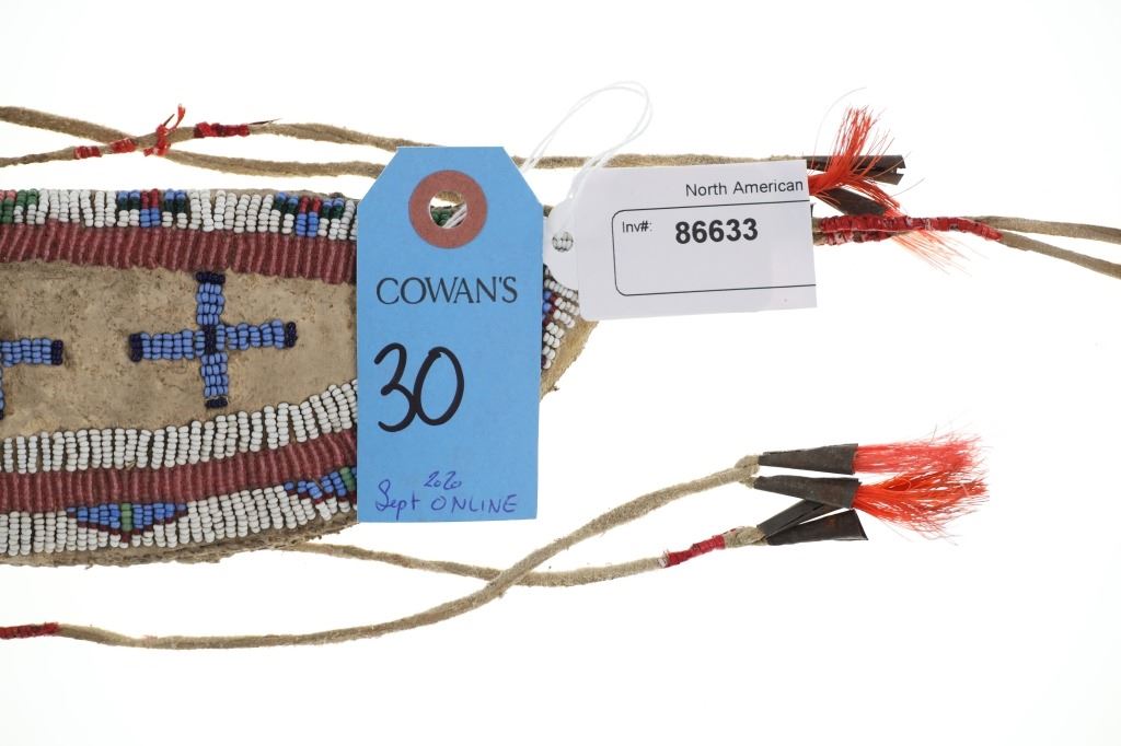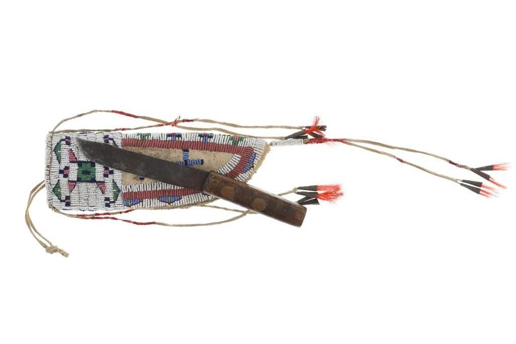 This lot features a circa 1870 Northern Cheyenne sheath with beautiful beadwork and quillwork from an ex-Cowan's sale. The sheath exhibits a parfleche rawhide lining covered in Indian tanned hide which is sinew sewn and adorned along both sides with glass trade seed beads, all of which are period correct examples showing colors of cobalt, Cheyenne pink, greasy green, chalk white, medium blue, greasy butterscrotch yellow, and red white hearts showing geometric designs along with crosses and a buffalo / bison or horse track on the back. The belt knife sheath shows four long Indian hide fringes at the top corners with a two Indian hide fringes at the base showing beadwork and porcupine quill quillwork in red mineral pigment coloring. The sheath is paired with a classic 19th-century trade knife showing a two piece hardwood grip handles secured with copper rivets onto a skinning belt knife with nice age. The sinew sewn sheath is well kept and the fringes also shows rolled tin jingle dangle cones with red dyed horse tail hair. The piece is well kept for its age with little to no bead loss, slight quill loss, a small worn through section on the back of the hide, but overall a fantastic authentic patina from honest age and use. Sheath with ties and fringes is 21-inches long, and the body without fringes is 8.25-inches long by 3-inches wide. The knife overall is 8.75-inches long. Provenance: Found to be authentic and sold by the experts at Cowan's Auction with the original auction tag present.*