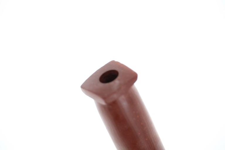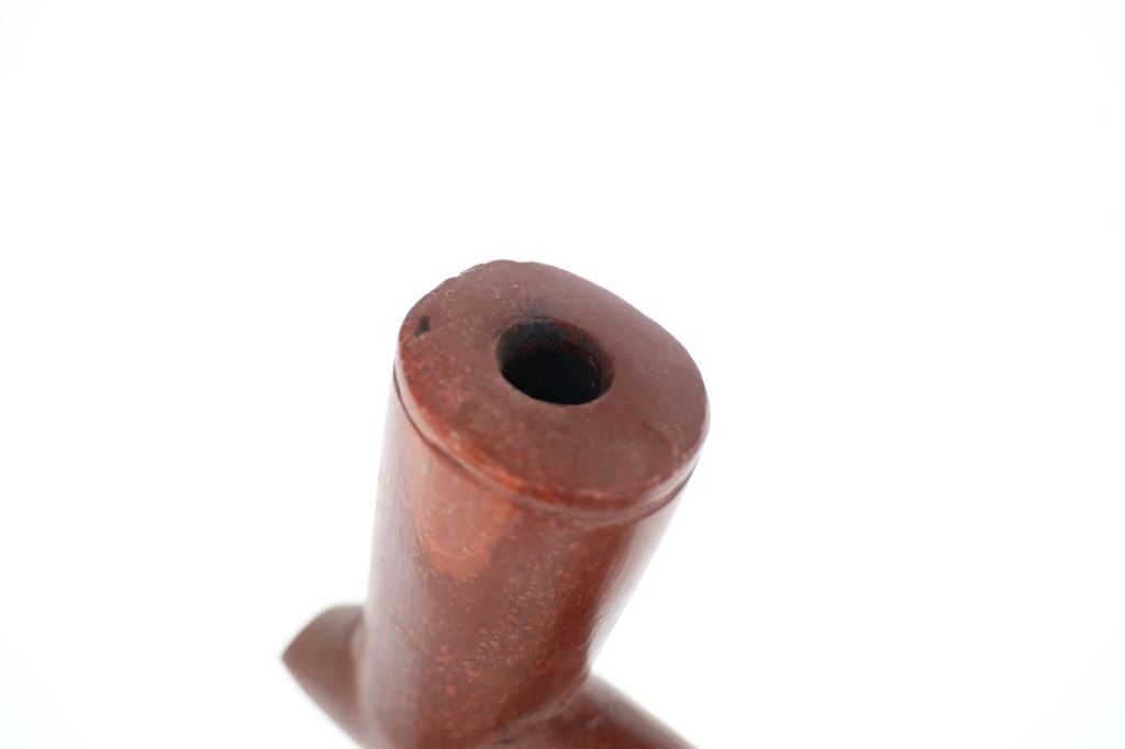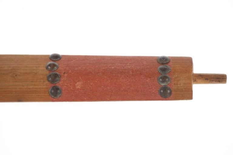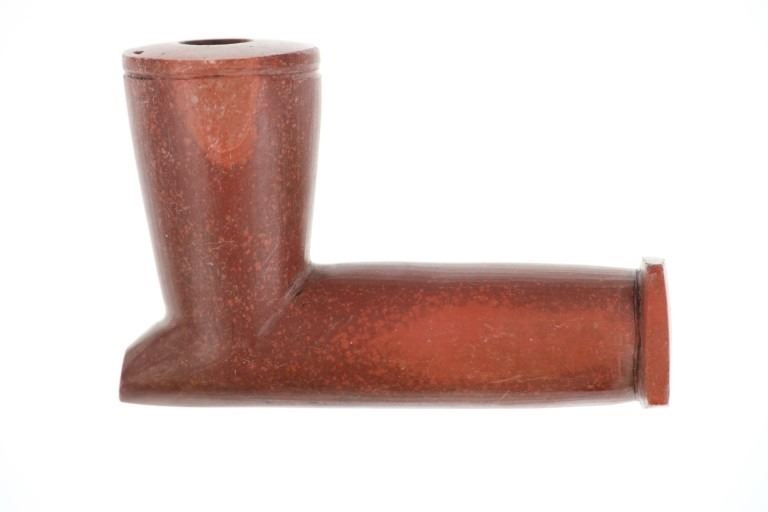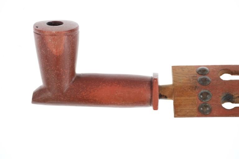 This is a stunning circa 1870’s Sioux calumet puzzle stem painted and tacked with a catlinite pipe stem bowl from a private French collection. The stem shows a carved wood puzzle stem with double cutout, typical of Santee Sioux examples, having a wide curved body having bands of red-ocher / ochre mineral pigment painted bands further accented by bands of old solid brass square shank trade tacks. The bowl is a T-shape carved from pipestone catlinite with a square stepped pipe stem connection and tapering tall bowl with small ridge at the top. The bowl has dark red to speckled pink coloring, and a well smoked bowl. The set has a nice coloring from age and is a nice Indian Wars era example. Provenance: From an ex-private collector in Aix-en-Provence, France and ex-private collection out of Paris, France. Overall measures 27.25-inches long; bowl is 3 7/8-inches by 2 5/8-inches by 1 3/8-inches; stem is 24 5/8-inches long by 2-inches wide.
