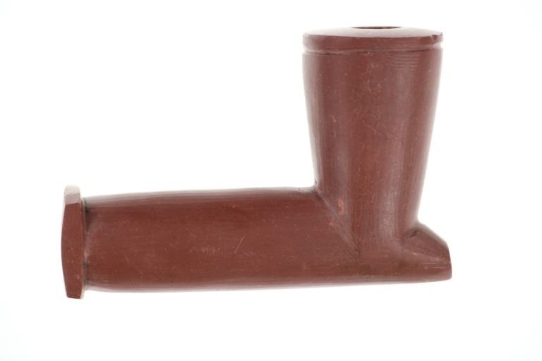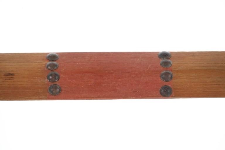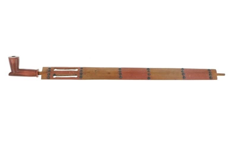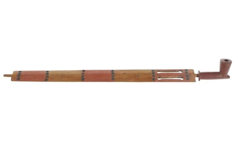 This is a stunning circa 1870’s Sioux calumet puzzle stem painted and tacked with a catlinite pipe stem bowl from a private French collection. The stem shows a carved wood puzzle stem with double cutout, typical of Santee Sioux examples, having a wide curved body having bands of red-ocher / ochre mineral pigment painted bands further accented by bands of old solid brass square shank trade tacks. The bowl is a T-shape carved from pipestone catlinite with a square stepped pipe stem connection and tapering tall bowl with small ridge at the top. The bowl has dark red to speckled pink coloring, and a well smoked bowl. The set has a nice coloring from age and is a nice Indian Wars era example. Provenance: From an ex-private collector in Aix-en-Provence, France and ex-private collection out of Paris, France. Overall measures 27.25-inches long; bowl is 3 7/8-inches by 2 5/8-inches by 1 3/8-inches; stem is 24 5/8-inches long by 2-inches wide.