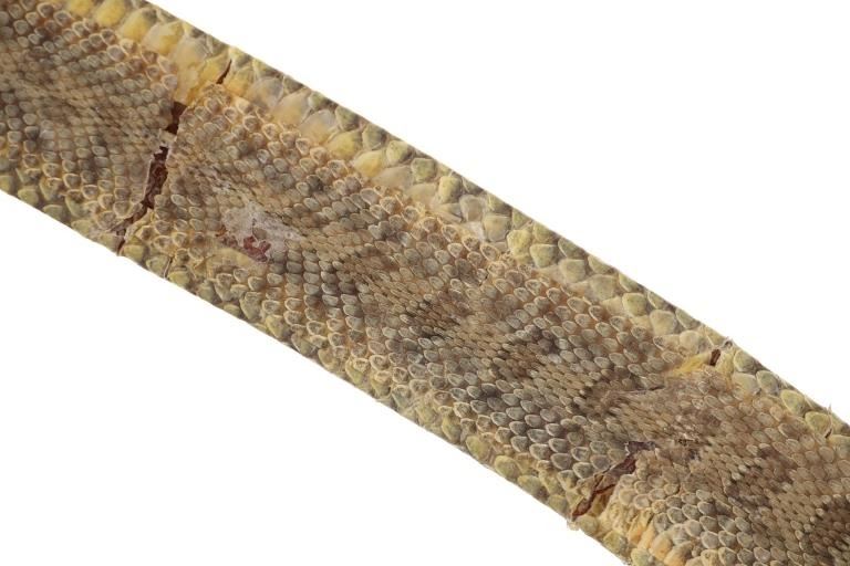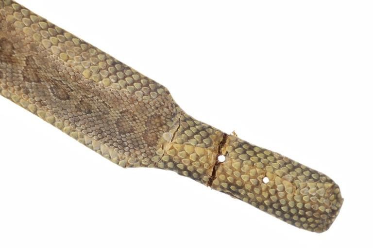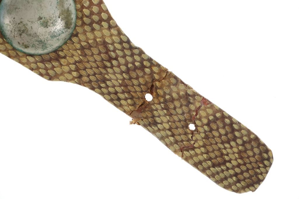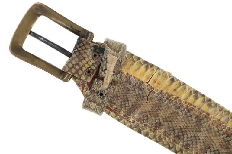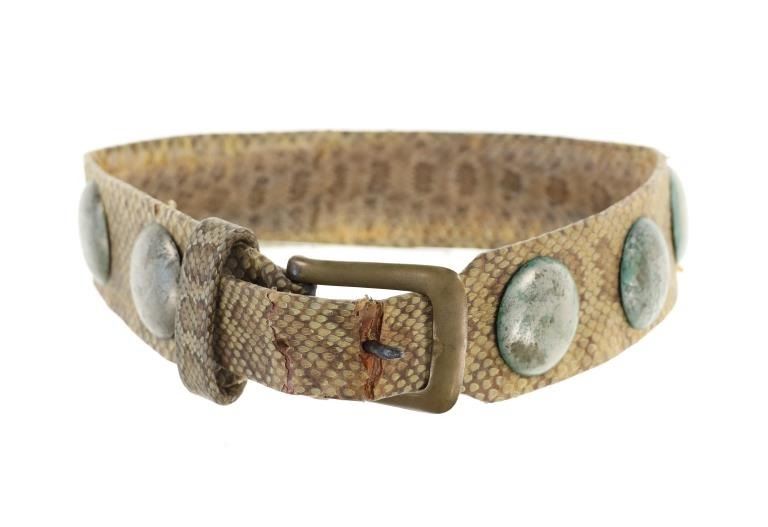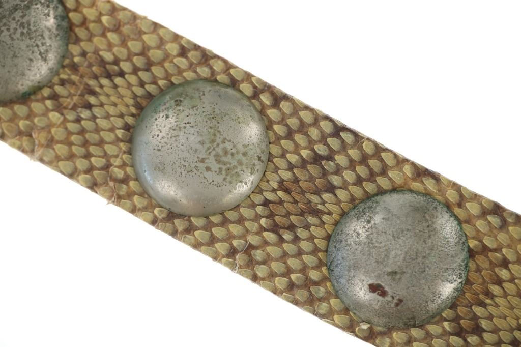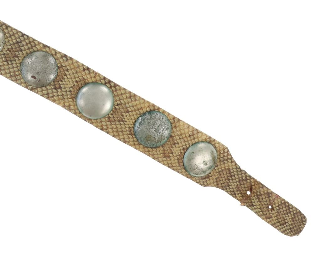 This is a fabulous circa 19th-century Comanche rattlesnake concho men’s belt. The belt exhibits a harness trade saddle leather belt wrapped in rattlesnake skin with a green mineral pigment ocher / ochre painted or dyed finish showing nine large German nickel silver conchos. The nine concho / conchas are all German nickel silver with a domed design with soldered ring on the inside tied with Indian hide to the leather belt. The conchos have a nice patina. The belt has a large heavy white brass buckle and the belt slide is covered in rattle snake skin as well. The belt likely dates to the mid-19th-century. This is a classic, documented early Comanche pattern of men’s belt; see the circa 1865 Comanche Cartridge Belt with commercial leather and large German silver conchos sold June 2024 by Heritage Auctions for $4,550 (w/ bp) and the Comanche 19th century Concho Belt with trade harness leather and large conchos sold February 2019 by NAAC for over $3,000 (w/ bp) both in the same shape and manufacture of this example. Provenance: The belt is from the ex- 2004-2005 Allard sale where it was found to be an authentic 19th-century Comanche example; and from a Northern Montana collection. The rattlesnake skin and belt have stiffened with the end of the belt where it connects to the buckle has a crack. Measures overall 39-inches long overall by 2 5/8-inches wide at the middle. Each concho is about 2-inches in diameter. Buckle is 3-inches by 2 3/8-inches.