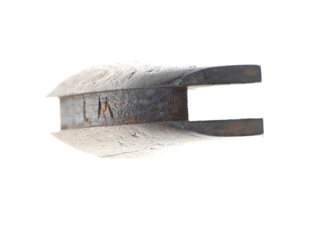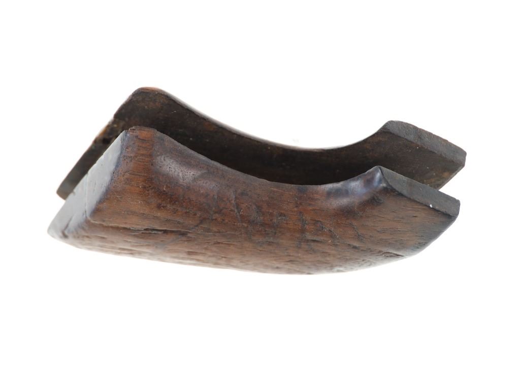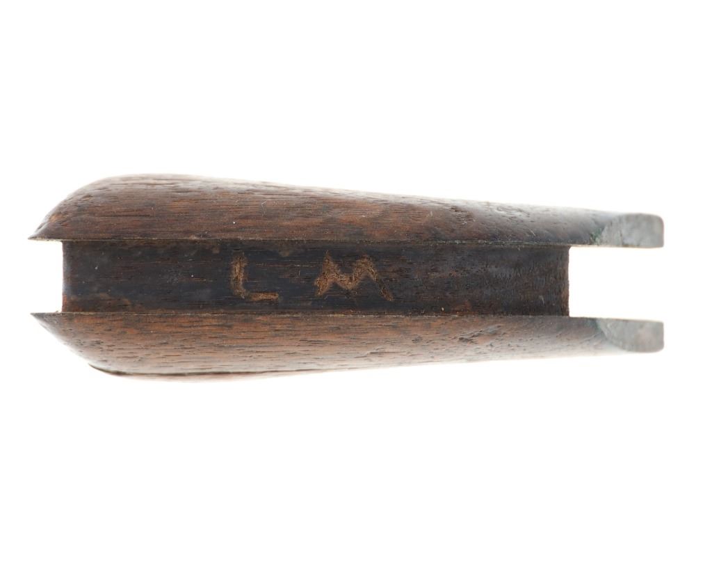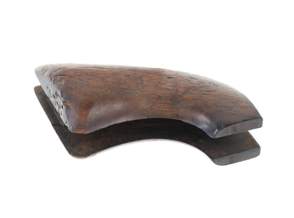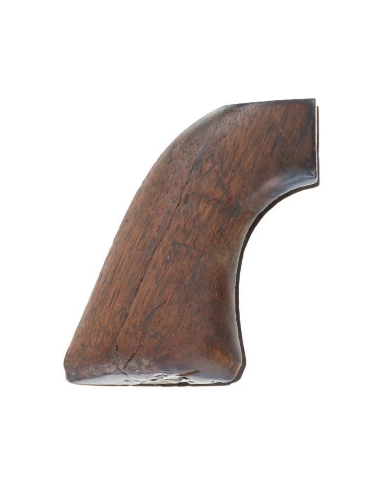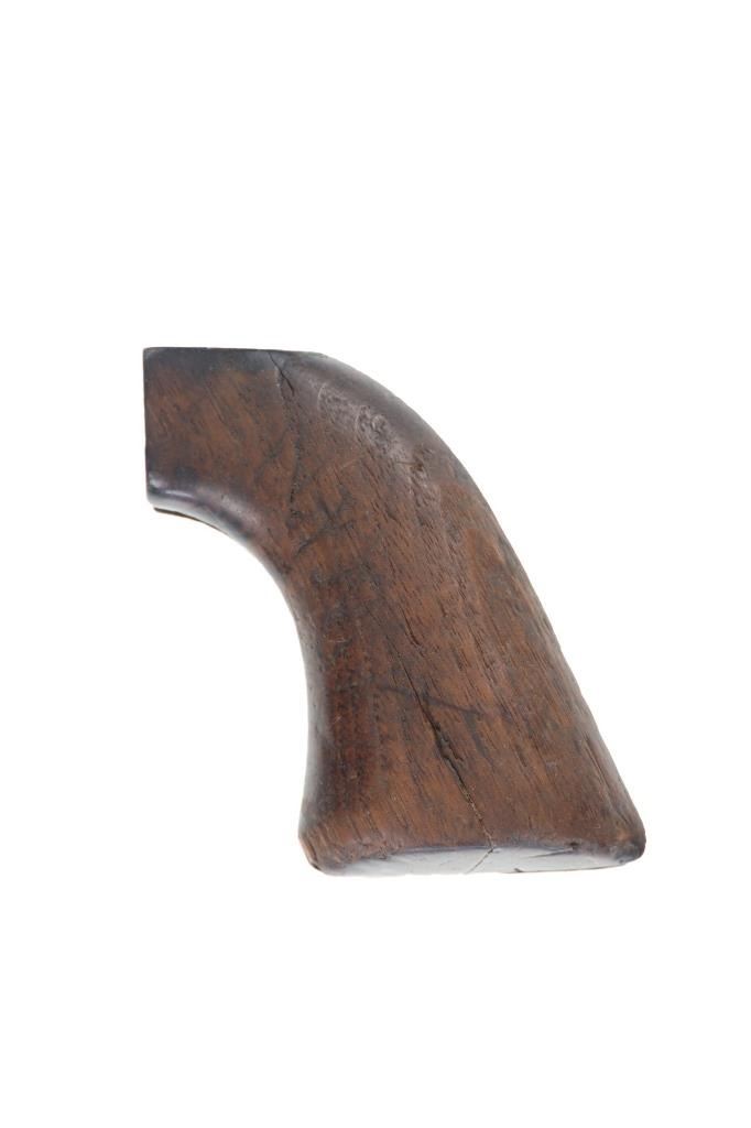 The lot features an original factory issue set of one-piece wood grips from the Colt Model 1873 Single Action Army revolver. The grips complete and were well used. These were issued on U.S. issue and civilian early examples. In 1880 Colt moved towards hard rubber grips making civilian wood grips obsolete. Carved "LM" in the back strap area with other carvings in the wood grip area that are indiscernible. There is a small crack which starts at the butt that can be seen. Measures overall 3 1/8-inches by 2 7/8-inches by 1.5-inches.