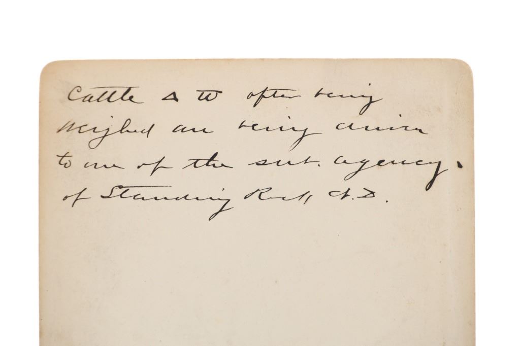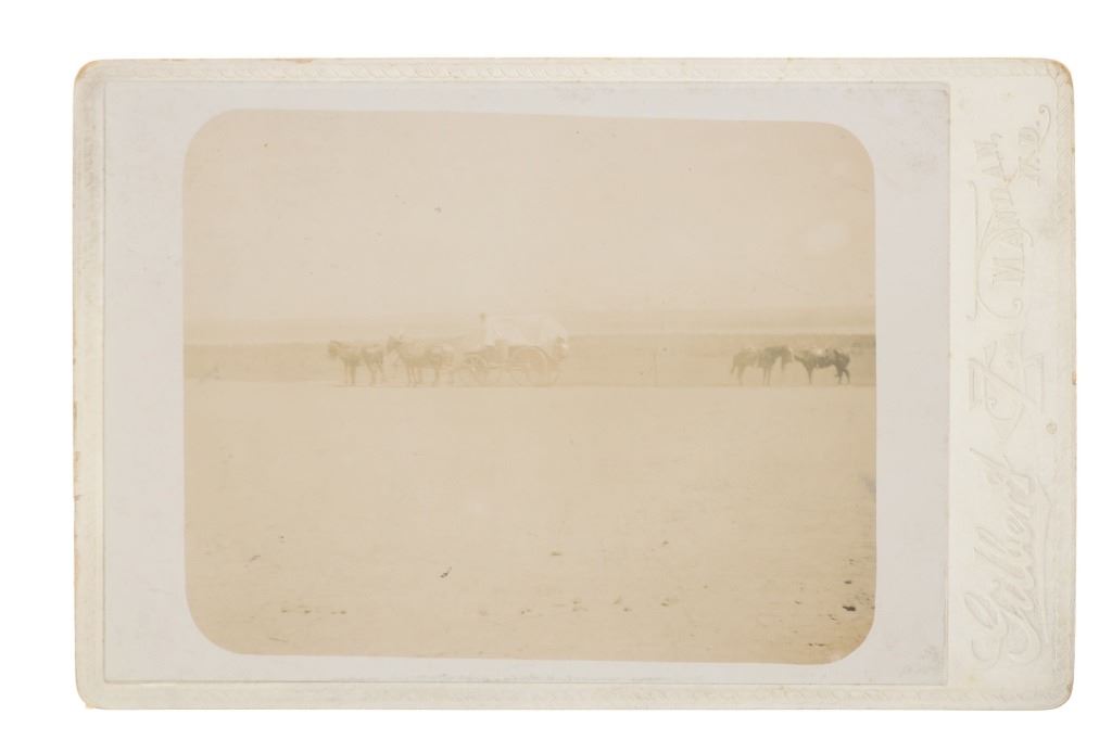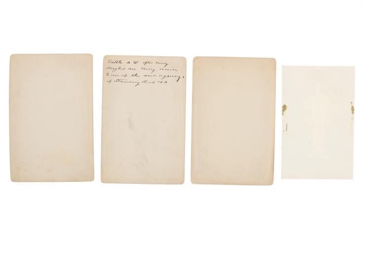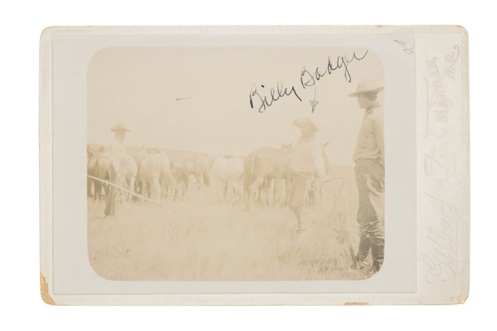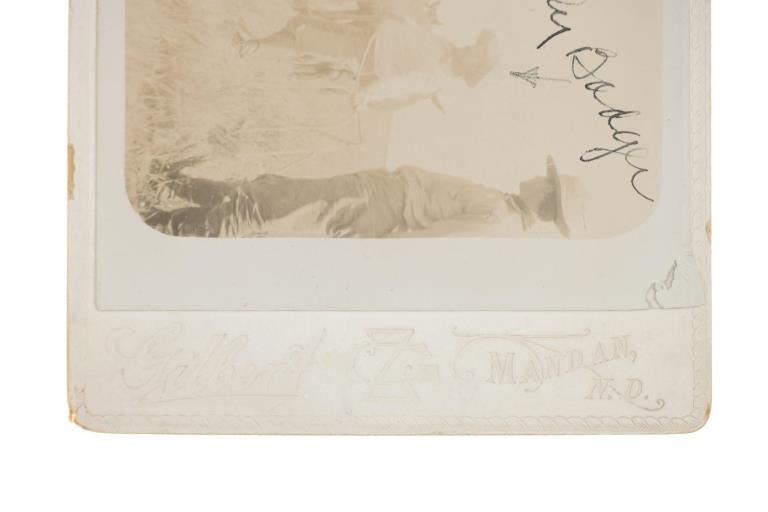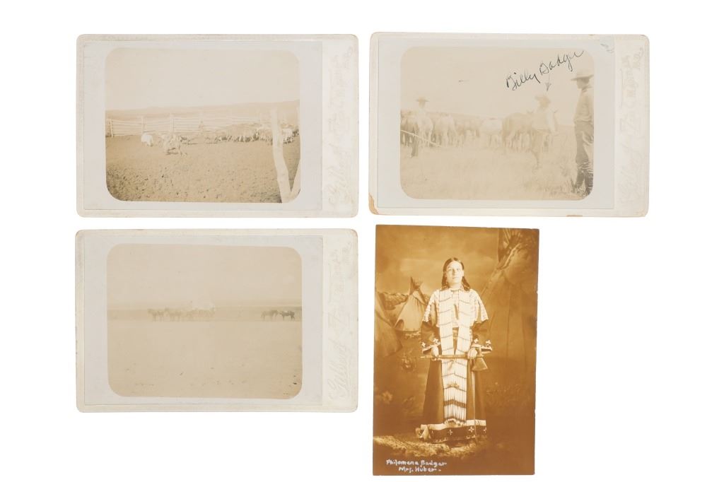 Featured in this lot are Rare Albumen Cabinet Cards by Zalmon Gilbert (Z. Gilbert), circa 1873-1889, Mandan, North Dakota. Provenance: From the John Kleinschmidt collection which was on loan to the C.M. Russell Museum from 1987 to 1993 and included in the "The Cowboy West: 100 Years of Photography 1992-1993 exhibit. Gilbert (1841-1897) was known for the "cabinet cards" and "carte de viste" photographs of Native Americans taken in his studio. Dependant on content and condition, today these snapshots of history routinely sell at ephemera auctions, sometimes from hundreds to thousand of dollars. One of the cabinet cards is of cattle being branded at the Standing Rock Indian Reservation, the second card shows a covered wagon, the primary mode of transportation in the United States until the late 19th century. The third cabinet card features cowboys with horses, one of the cowboys is identified as "Billy Badger". Captain W. C. Badger (Billy) was Quartermaster at Fort Lincoln, Dakota Territory when Custer's 7th Cavalry was stationed there, and personally associated with Gen. Custer. Badger is mentioned as photographer and subject matter expert extensively throughout the Welch Dakota Papers by Col. A. B. Welch. Welch had joined with John Kleinschmidt in 1926 to have these photographs reproduced from steroptican slides. Along with the cabinet cards is an albumen photograph of Philomena Badger (Mrs. Huber), presumably Billy's daughter, dressed in traditional ceremonial dress and hairpipe bone breastplate while holding a tomahawk pipe, circa 1900-1909. Photograph appears to have been taken at the Frank Fiske studio at Fort Yates, North Dakota. Fiske was an early-20th-century photographer primarily active among the Lakota (Sioux) on Standing Rock Indian Reservation in North and South Dakota. The cabinet cards and albumen photograph are in nicely preserved condition, exhibit normal wear, cabinet cards have the "Gilbert Z Mandan, N. D." hallmark stamped on the front bottom, scuffing noted on edges. Photograph has residue on reverse from previous mounting. Cards measure 4.25"W x 6.5"L, photograph is 3.75"W x 5.75"L.