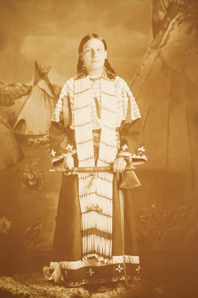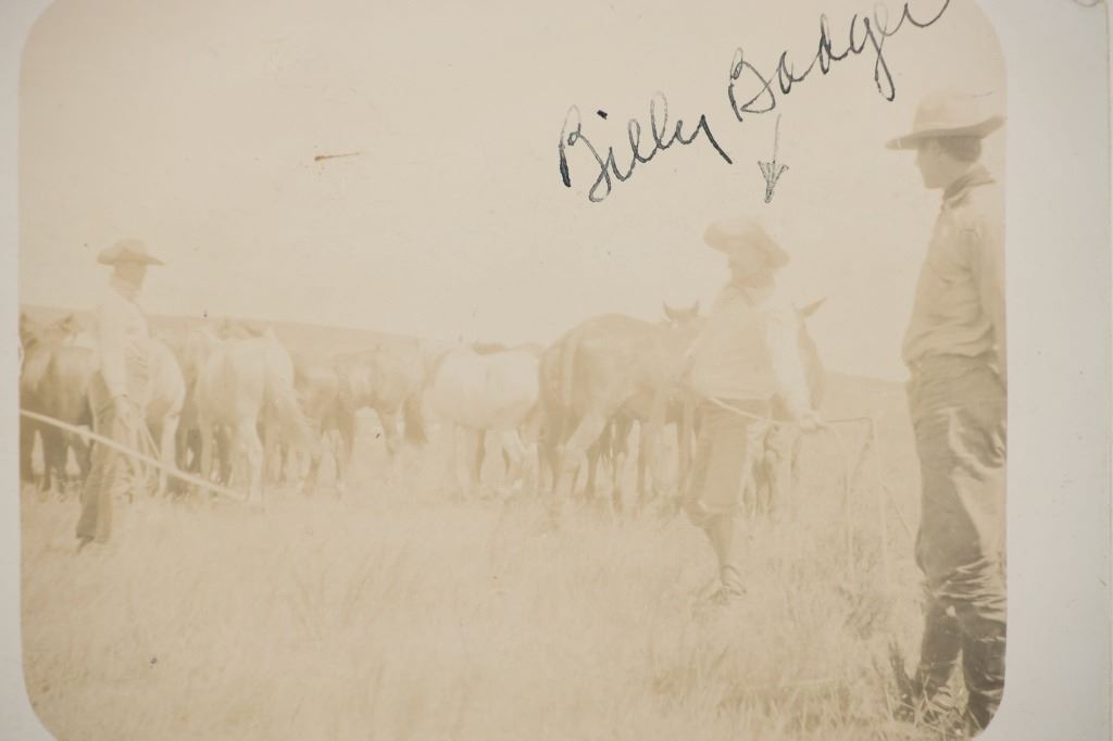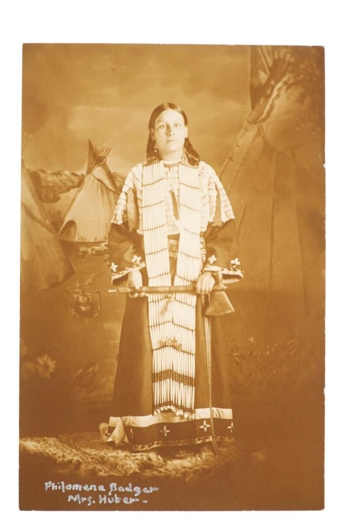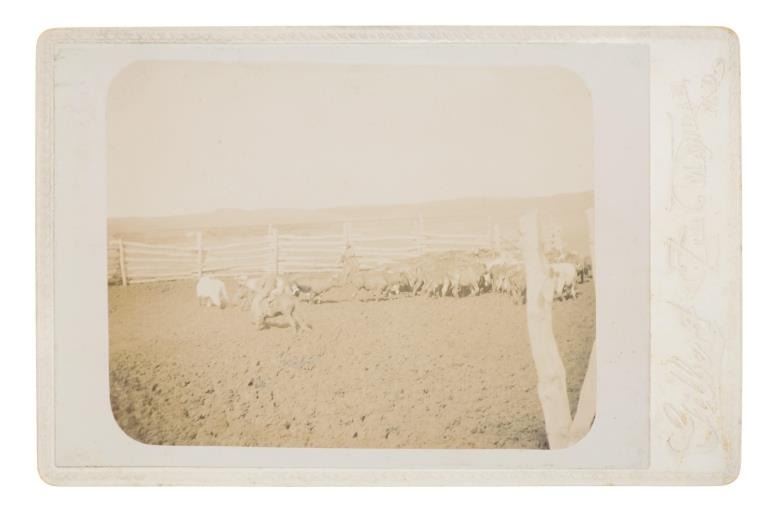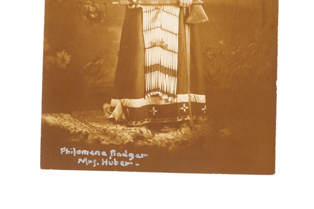 Featured in this lot are Rare Albumen Cabinet Cards by Zalmon Gilbert (Z. Gilbert), circa 1873-1889, Mandan, North Dakota. Provenance: From the John Kleinschmidt collection which was on loan to the C.M. Russell Museum from 1987 to 1993 and included in the "The Cowboy West: 100 Years of Photography 1992-1993 exhibit. Gilbert (1841-1897) was known for the "cabinet cards" and "carte de viste" photographs of Native Americans taken in his studio. Dependant on content and condition, today these snapshots of history routinely sell at ephemera auctions, sometimes from hundreds to thousand of dollars. One of the cabinet cards is of cattle being branded at the Standing Rock Indian Reservation, the second card shows a covered wagon, the primary mode of transportation in the United States until the late 19th century. The third cabinet card features cowboys with horses, one of the cowboys is identified as "Billy Badger". Captain W. C. Badger (Billy) was Quartermaster at Fort Lincoln, Dakota Territory when Custer's 7th Cavalry was stationed there, and personally associated with Gen. Custer. Badger is mentioned as photographer and subject matter expert extensively throughout the Welch Dakota Papers by Col. A. B. Welch. Welch had joined with John Kleinschmidt in 1926 to have these photographs reproduced from steroptican slides. Along with the cabinet cards is an albumen photograph of Philomena Badger (Mrs. Huber), presumably Billy's daughter, dressed in traditional ceremonial dress and hairpipe bone breastplate while holding a tomahawk pipe, circa 1900-1909. Photograph appears to have been taken at the Frank Fiske studio at Fort Yates, North Dakota. Fiske was an early-20th-century photographer primarily active among the Lakota (Sioux) on Standing Rock Indian Reservation in North and South Dakota. The cabinet cards and albumen photograph are in nicely preserved condition, exhibit normal wear, cabinet cards have the "Gilbert Z Mandan, N. D." hallmark stamped on the front bottom, scuffing noted on edges. Photograph has residue on reverse from previous mounting. Cards measure 4.25"W x 6.5"L, photograph is 3.75"W x 5.75"L.