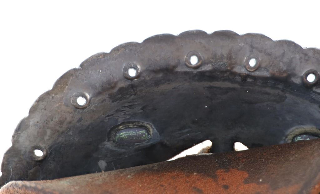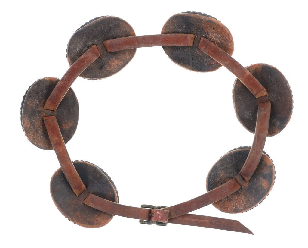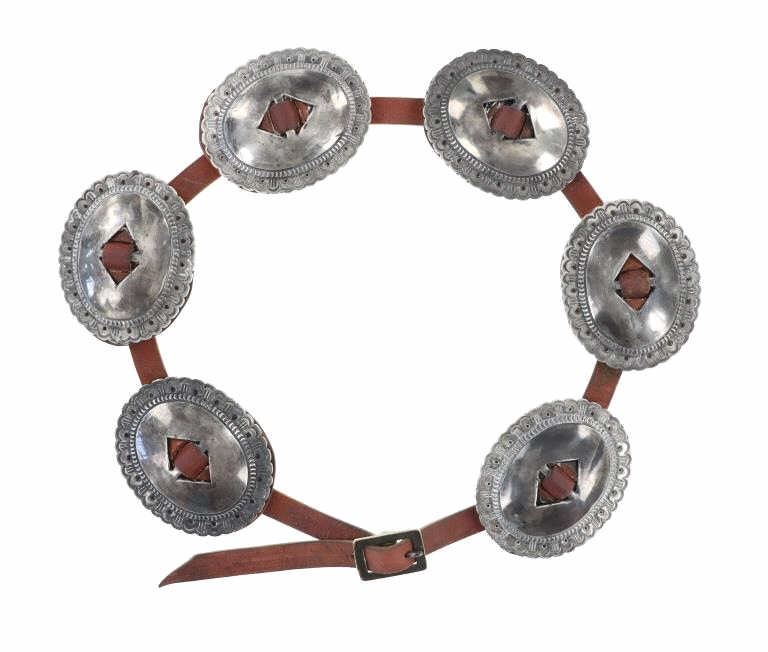 An exquisite circa 1880 Navajo First Phase Concho belt. The piece shows six large conchas (also referred to as conchos) with the correct oval shape, scalloped edge, stampings, domed shape, diamond cutouts at the center and around the outer edge pierced holes. These holes were pierced by an awl tool (see the photo of the back), an early feature, unlike other later examples that were drilled. Has a period 1880’s military pattern rectangular commercial buckle with a leather belt, commonly seen on other First Phase belts. Behind each concha is a conforming pad of leather.