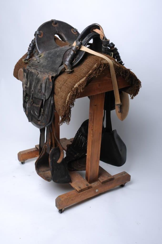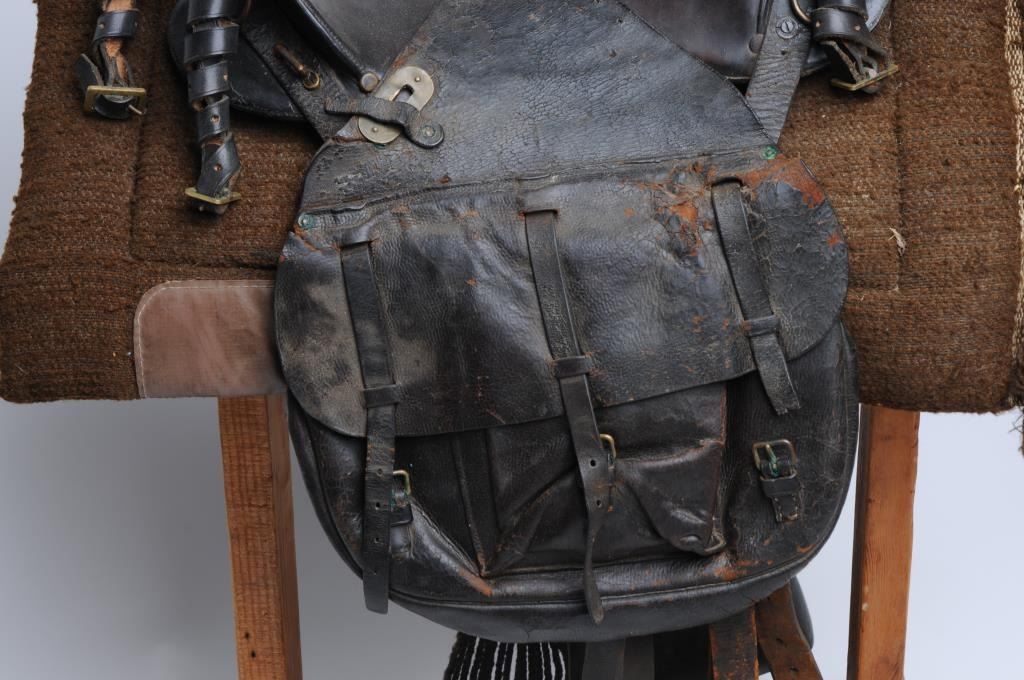Ca. 1885 McClellan saddle, fully rigged; accompanied by a pair of 1885 saddlebags in well-used condition with fraying and tearing in certain areas; stitching on saddlebag also coming loose in certain areas; 6reproduction coat straps; the original hooded stirrups show faint US; the hair cinch is marked Rock Island Arsenal; the saddle has open stitching on both sides of the middle. Est.: $1,000-$2,000.