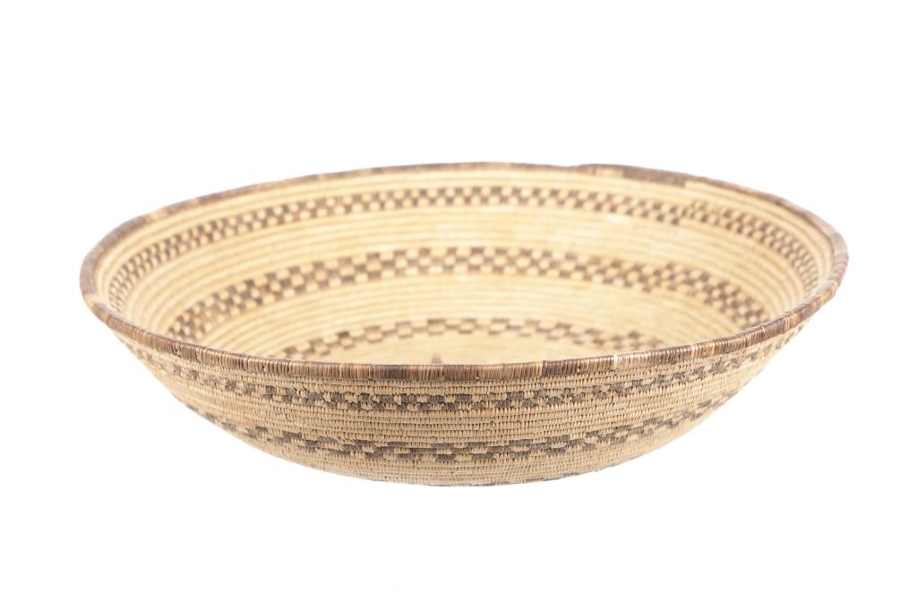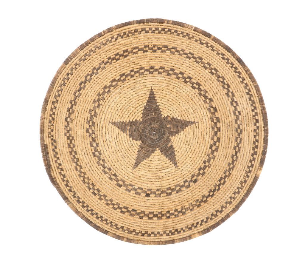 This is a rare circa 1890-1910 Apache large woven coiled basketry tray from the ex-collection of Sundog and Bruce VanLandingham. The basket shows a large size with five-point flower (similar to a star) with three prominent checkered bands. The basket is woven in willow and devils claw. The coiled woven original condition with very little to no damage for its early age. The basket is likely San Carlos Apache or Yavapai Apache.