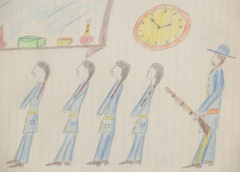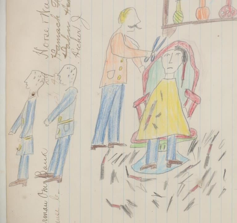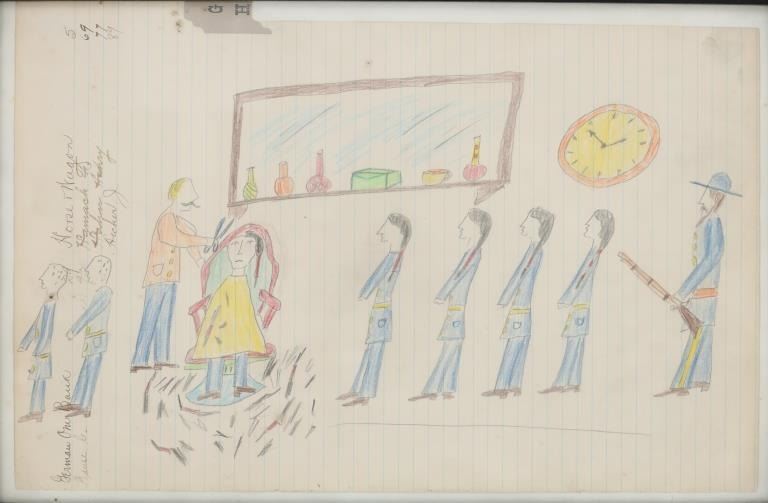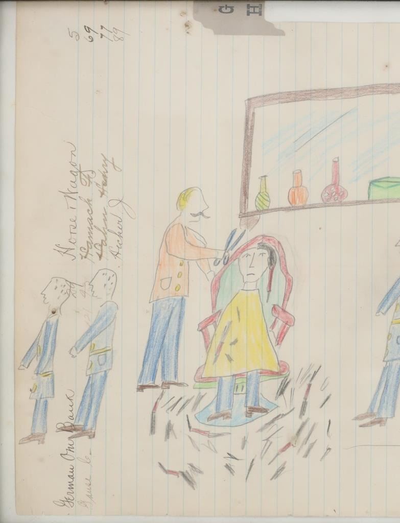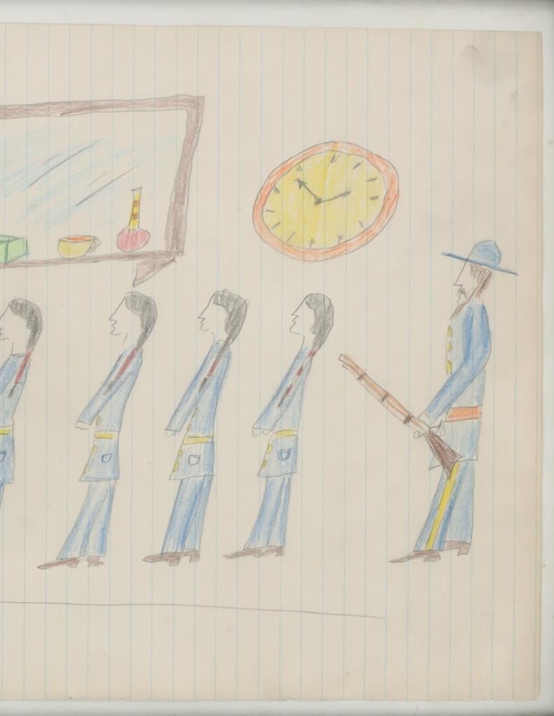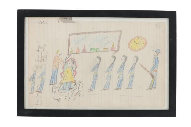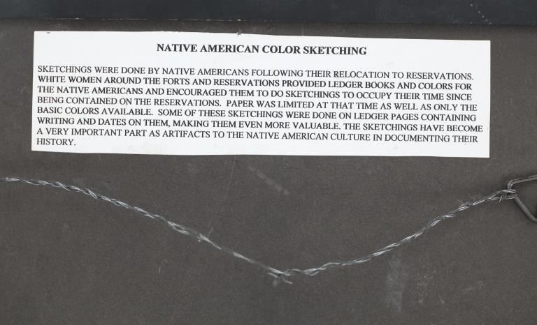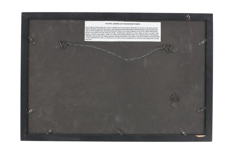 The lot features a large original ledger drawings from the Northern Sioux dating to circa 1890-1940’s from the Robert Dickens Little Blue Hand collection showing the Carlisle Indian School and Sioux Warrior images. These ledger drawings are from the same ledger book collection offered and sold from our company back in 2013. The original ledger book would have been traded to the Northern Sioux and was said to be handed down from their ancestor’s at the Sioux Pine Ridge Indian Reservation and later traded to the collector many years ago back in the 1970-1980s. The set ranging in age from circa 1890 on and is mostly believed to be drawn in circa 1920-1940s. The ledger drawing shows an original late 19th Century Ledger book page which is marked “German One Bank” and “Horse Wagon / Hamack F. / Hahn Heavy / Hecker J.”. The image shows a row of Sioux young men being forced to line up by a U.S. blue coat soldier with the Carlisle or U.S. Soldier barber cutting away one boys hair and two more leaving with their hair gone, stripping the boys of any Native American culture they have remaining. The Carlisle Indian Industrial School in Carlisle, Pennsylvania was the main Indian boarding school in the United States founded in 1879 through 1918. Original condition well preserved and displays beautifully. Another smaller ledger drawing from this collection depicting the Carlisle Indian School recently sold at our auction for $1,890 (shown w/ bp) in 2024. The frame is 18.25” by 12.25” and the art is about 15.75” by 10.5”.