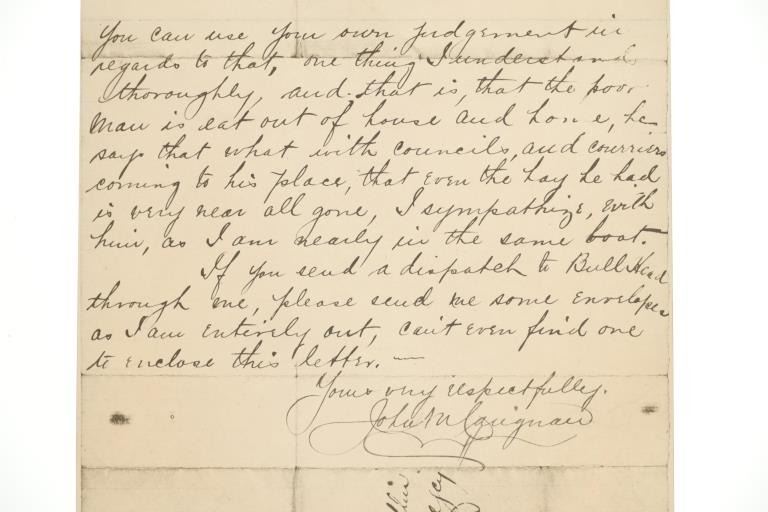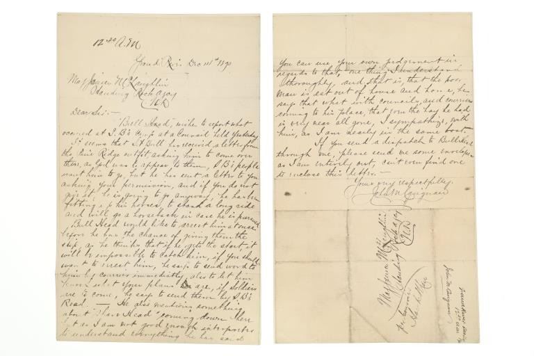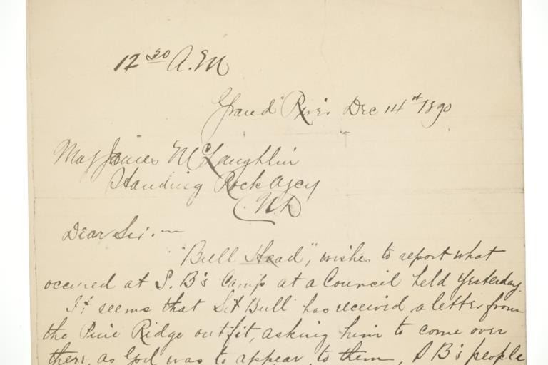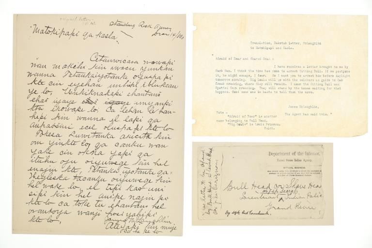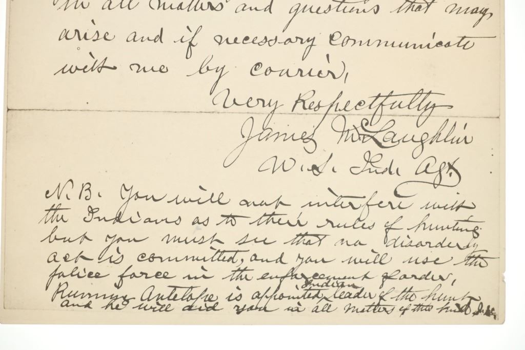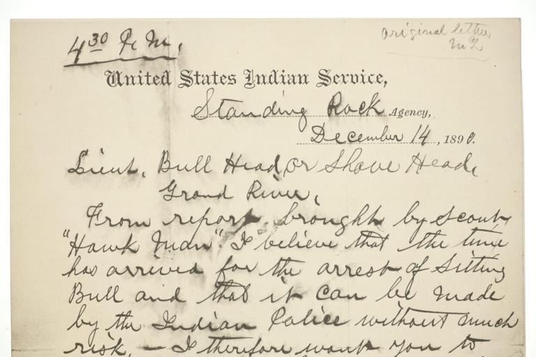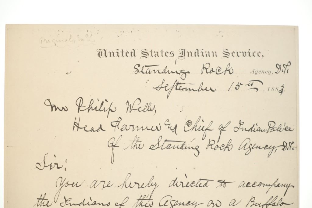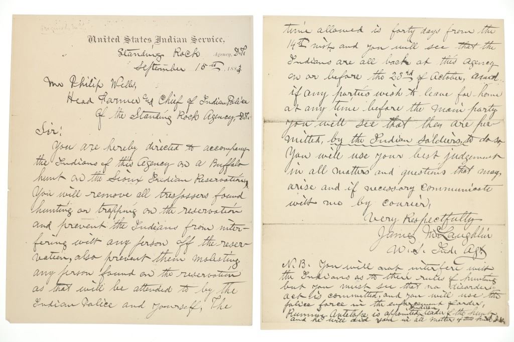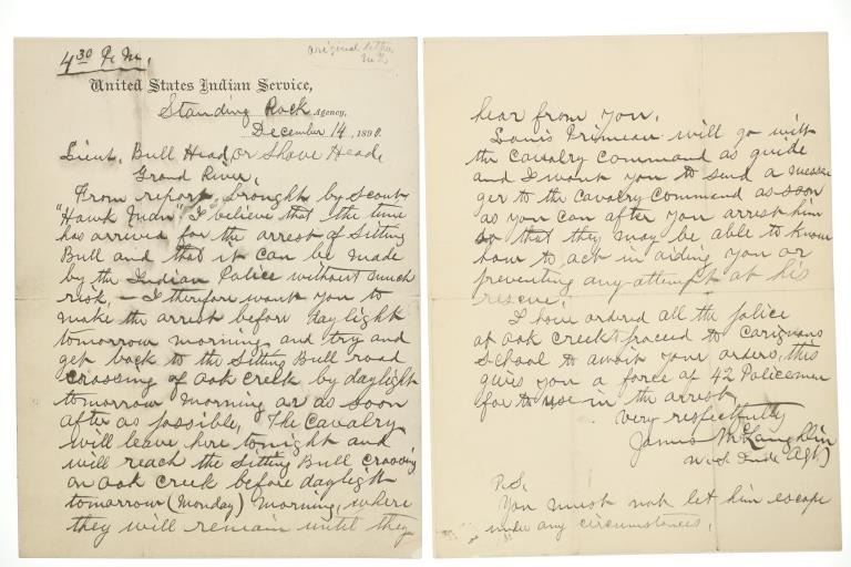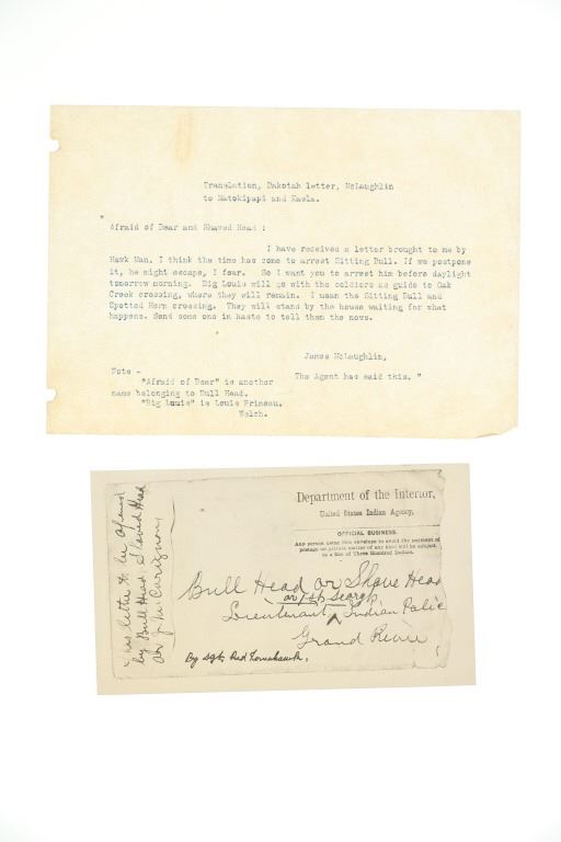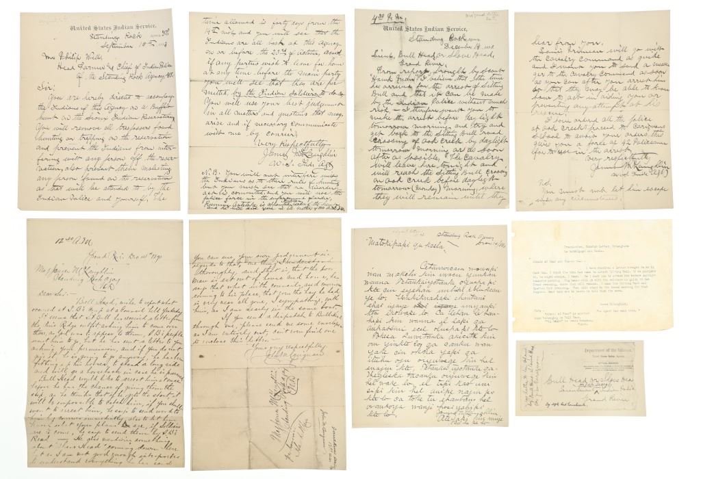 Presented in this lot is a collection of Letters from Standing Rock Indian Service Agent James McLaughlin, circa 1883 and 1890, authorization to arrest Sitting Bull. Provenance: From the John Kleinschmidt collection which was on loan to the C.M. Russell Museum from 1987 to 1993 and included in the "The Cowboy West: 100 Years of Photography 1992-1993 exhibit. These early examples of the letters are a powerful collection of history of the Great Sioux Nation at the end of the 19th century. These letters (which are old duplicates from the originals) are attributed to Colonel Alfred Burton Welch who was well known for his extensive artifact collection and lifelong association with the Sioux nations. The Welch Dakota Papers include thousands of pages of oral interviews, writings, newspaper articles and photographs of the Sioux, Arikara, Hidatsa and Mandan peoples. Welch is credited as the first white man adopted into the Yanktonai Sioux, a separate band from the Yankton Sioux; both are considered Western Dakota people. The first letter dated September 15, 1883 was addressed to Philip Wells, interpreter and chief of Indian police of the Standing Rock Agency, Dakota Territory and sent from James McLaughlin Indian Agent. This letter gave Wells instructions to accompany Sioux Indians on a buffalo hunt and prevent them from"molesting" any persons trespassing on the reservation. Wells supervised one of the last great buffalo hunts in which 2,800 Indians took part. Three letters (photocopies from the originals) are associated to Indian Agent James McLaughlin's ordering the arrest of Sitting Bull on December 14, 1890. One letter with a handwritten time of 12:30 A. M. December 14, 1890, is written in the Dakotah language and translated into English, from Indian police Lt. Bull Head who advised Sitting Bull was preparing to go to the Pine Ridge Reservation where the Ghost Dance movement was strong. McLaughlin's arrest authorization letter has a handwritten time of 4:40 P.M., December 14, 1890. The following day, Sitting Bull was shot and killed by Indian police during the arrest attempt. The letters each measure 8"W x 10"L approximately.