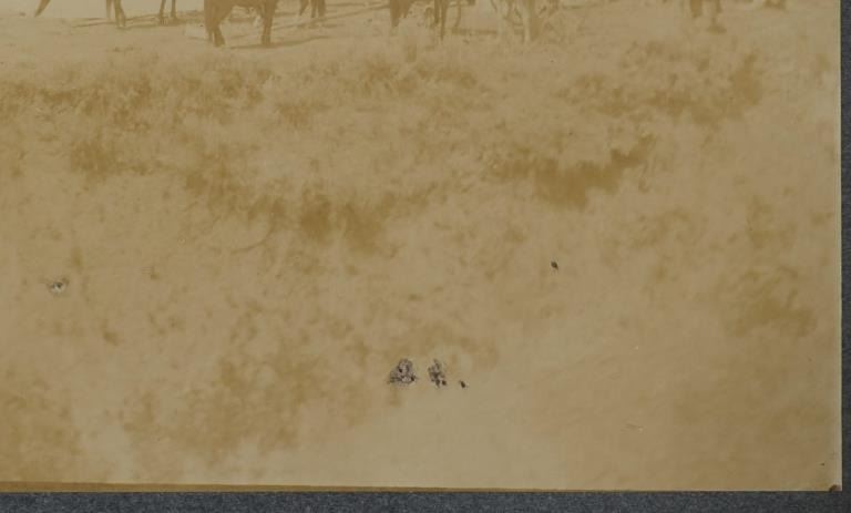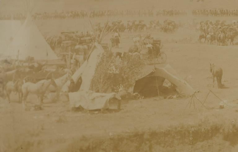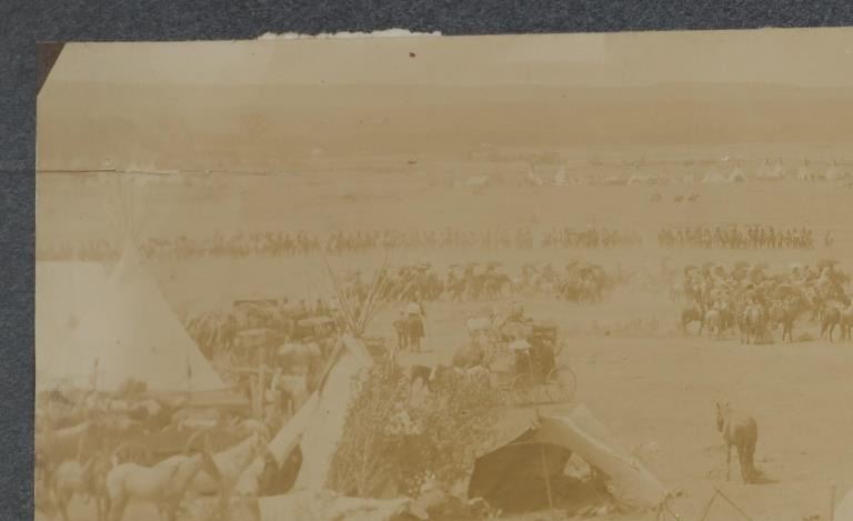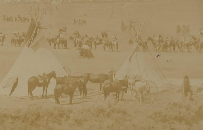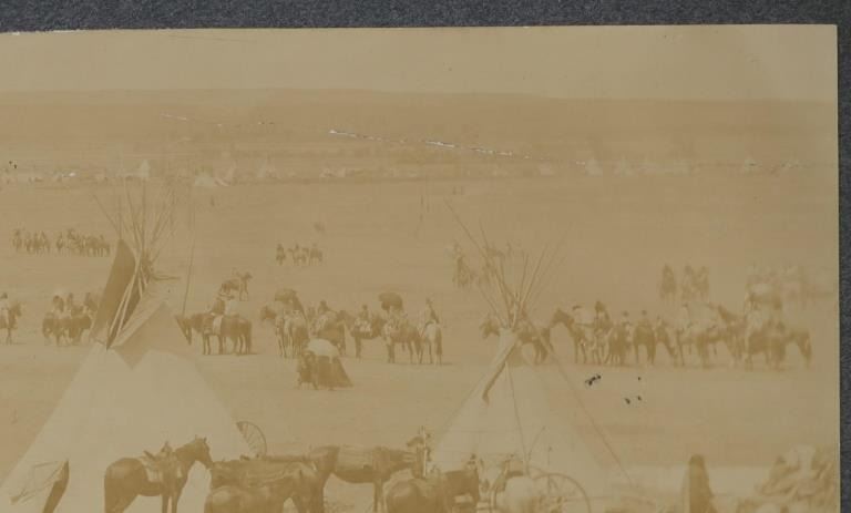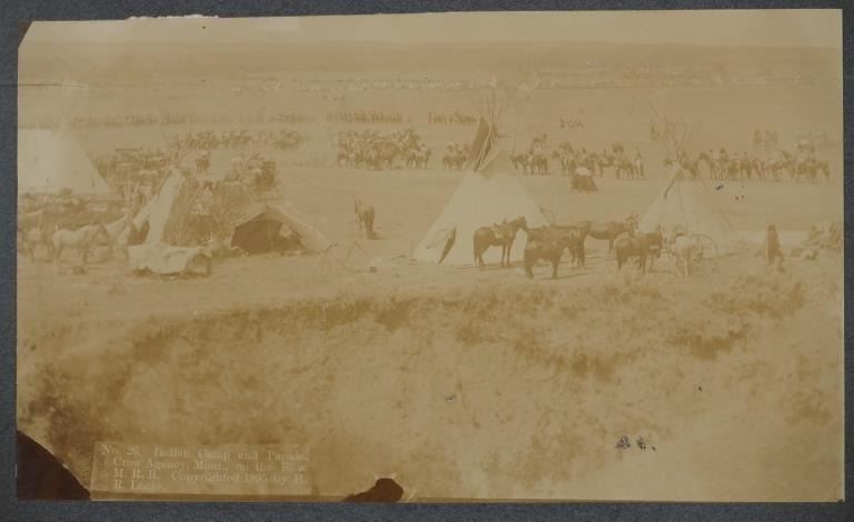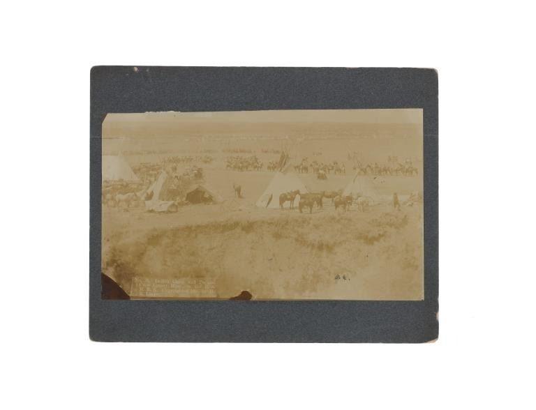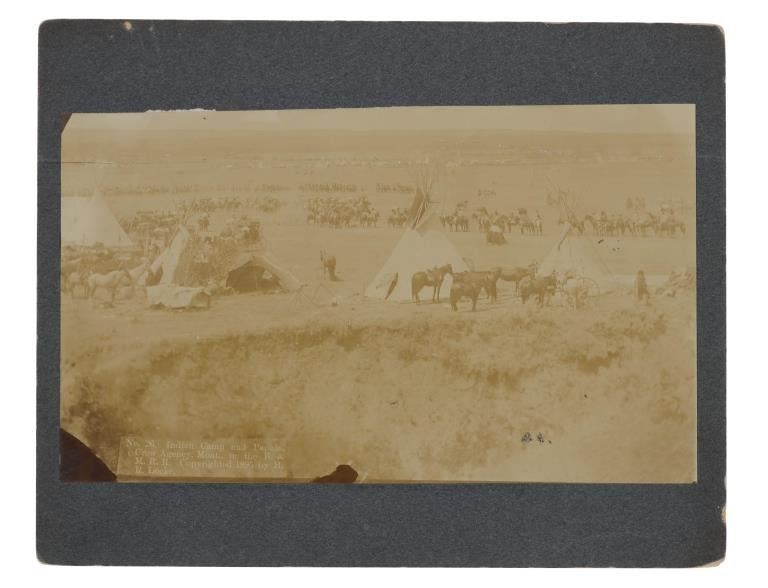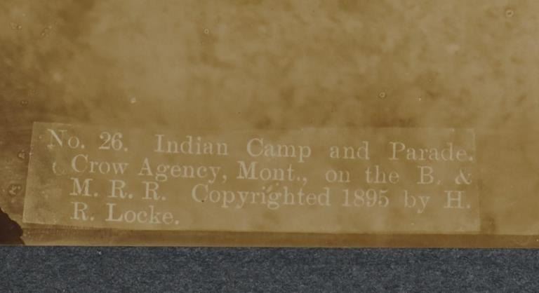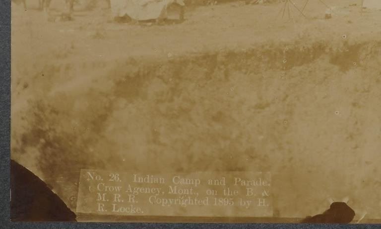 This is an original large format photograph, circa 1895 by H.R. Locke titled, “No. 26 Indian Camp and Parade. Crow Agency, Mont., on the B. & M. R. R. Copyrighted 1895 by H. R. Locke.” Henry Robinson Locke (1856 - 1927) was a noted American photographer who became notable photographing the Wild West in the 19th Century and early 20th Century. He ran a studio in Deadwood, South Dakota and photographed the Black Hills area, Deadwood, Crow Indians, as well as farmers, miners, railroads. He was noted for photographing Calamity Jane in 1885 and the Little Big Horn battlefield in 1894. This photograph is marked in the negative and shows a wonderful detailed image with several lodge / tipi’s surrounded by horses with a parade of Montana Crow on horseback in full regalia at the foreground, with a whole group with the traditional umbrella’s and beaded umbrella’s in the center and in the background rows of Crow lodges / tipi’s set in front of the Montana hills. Provenance: From the Jim Aplan Piedmont, South Dakota collection. Measures 10” by 8”. The image is clear and overall the image and card / boudoir card are in good condition. The top third of the image at one point had a slight fold. There is a mark in the image and a few spots.