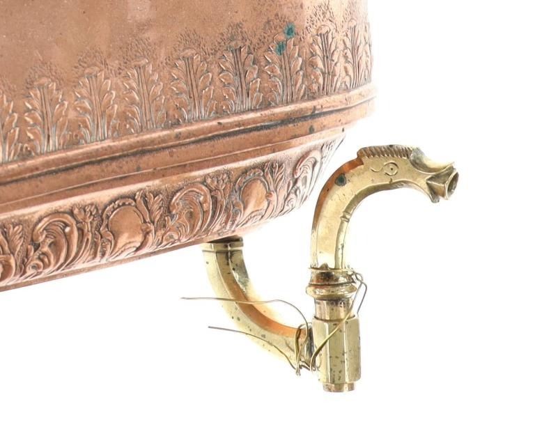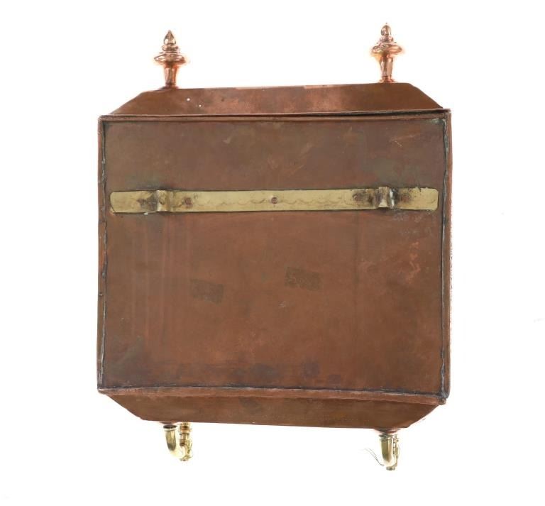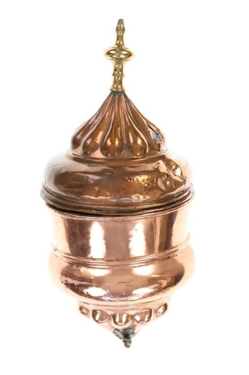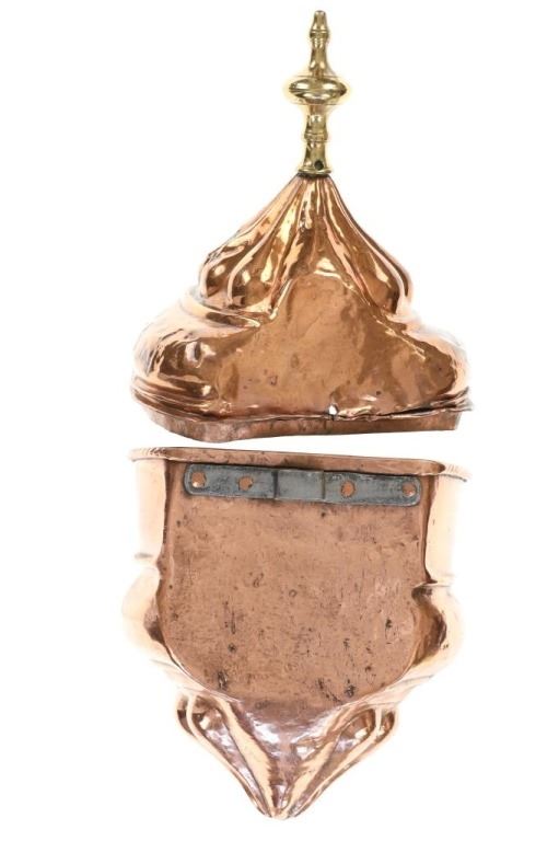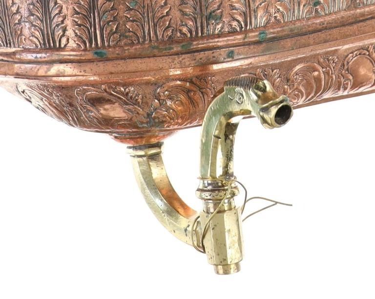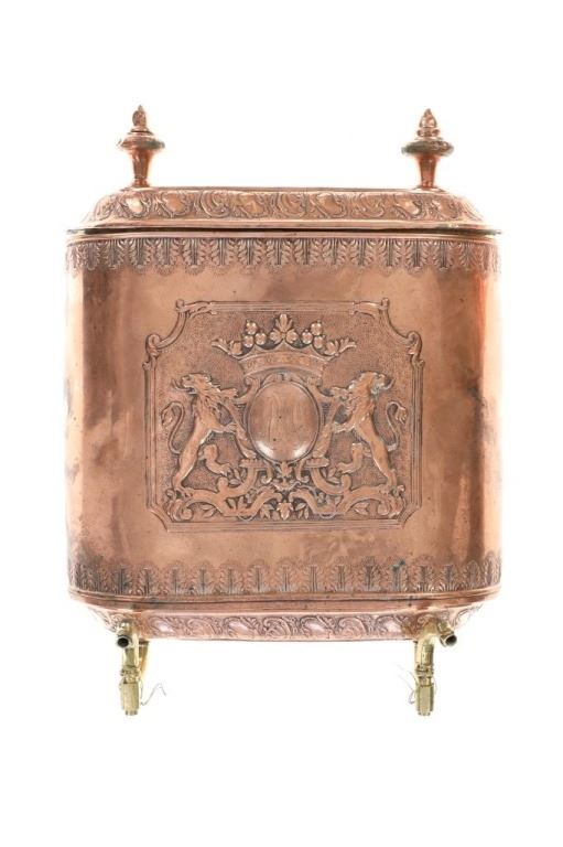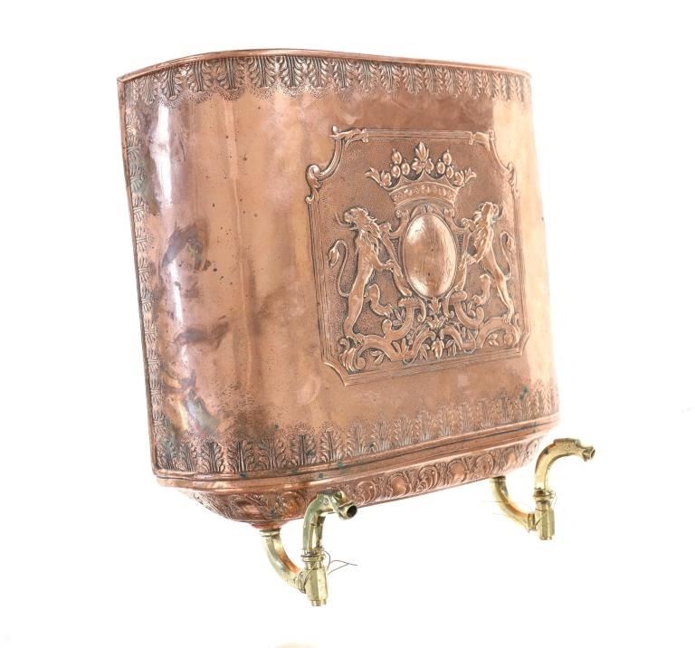 Featured in this lot is this Louis XV French Provincial copper lavabo pair circa 18th century. There are two lavabo basins in this collection. The first is the largest and most notable and collectable pattern to the face of a shield being held by two lions with period correct patina and two spouts the lid is similarly decorated with two protruding pylons. The second is smaller and is a more simple basin with a single spout male end (missing the brass spout) and shows a ornate lid with a brass pylon reaching for the sky. The condition of this pair of lavabo basins is preserved for their age with some wear tot he smaller basin showing a hole in the lid and the spout missing; the bigger one shows loose spouts and some patina to the body but otherwise is in preserved condition. The measurements of these two basin's is 17 3/4" x 13 1/2" x 5 3/4" and 17 1/2" x 7 1/4" x 7 1/2". The collective weight of this pair of lavabo basins are 9lb 14oz. Provenance: From a prominent ex-Bozeman private collection who purchased the majority of his collection from Cowan's, Skinner, Bonhams, Morphy's, Sotheby's, March in Montana, North American Auction and other well revered auction houses.