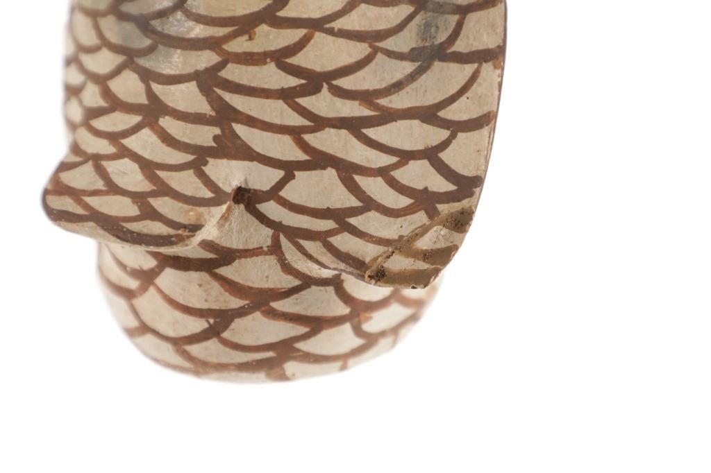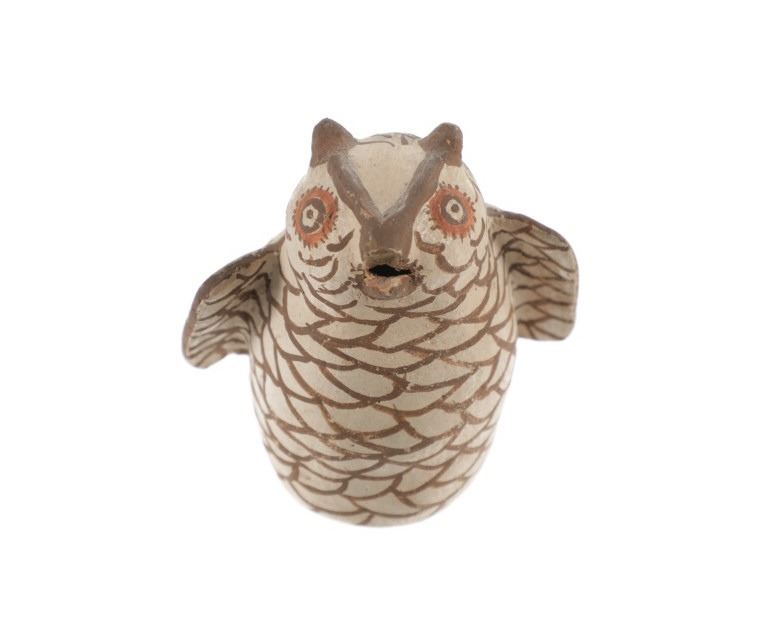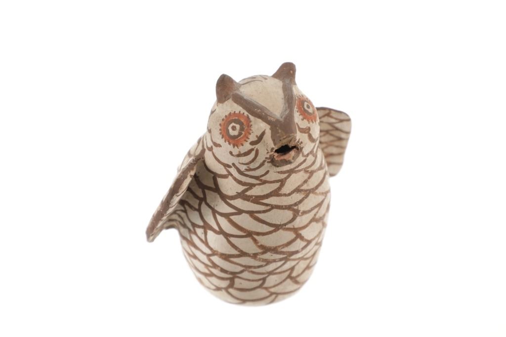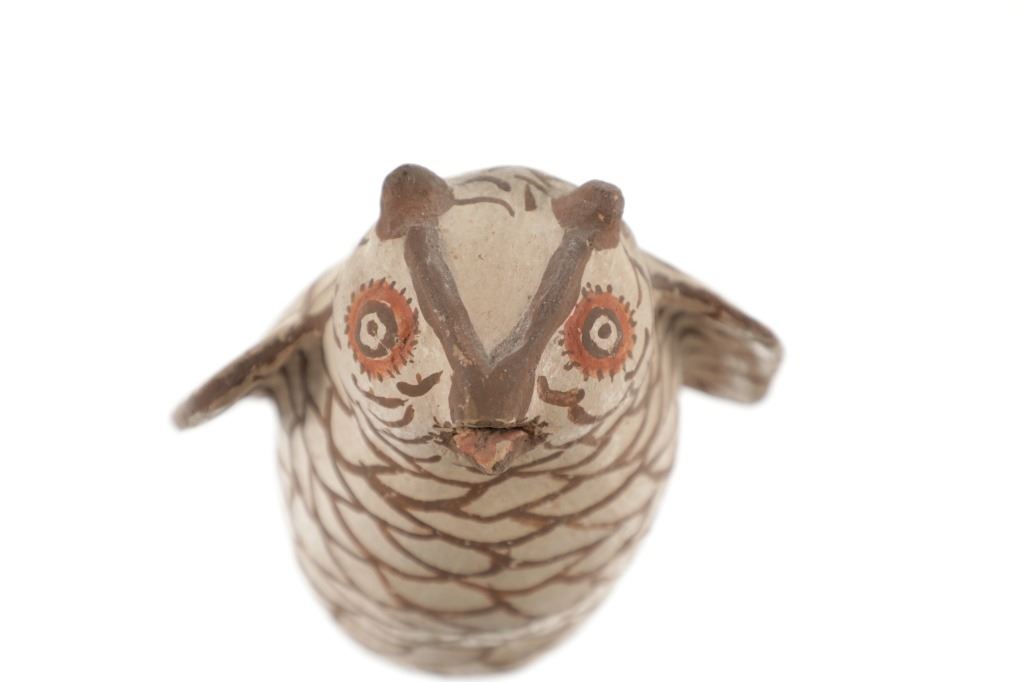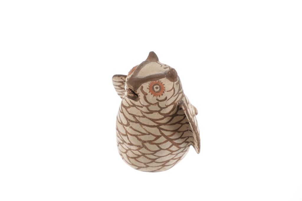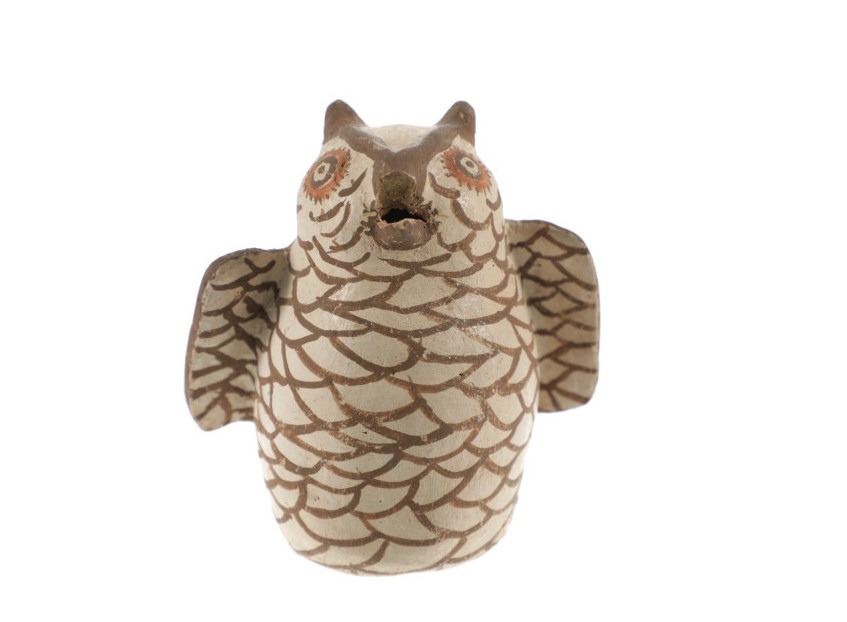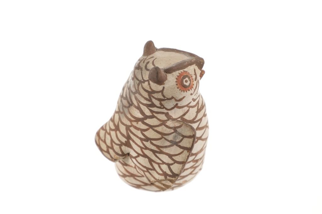 The lot features an original pottery polychrome painted owl effigy from the Zuni Pueblo Native American Indians dating to circa 1900-1930's. The piece shows an owl bird shape with dark brown on white paint having additional features in red / brown. The bird shows a beak with mouth opening to the hollow center, raised eyes, ears, wings and a tail. The piece shows some slight paint loss, with beak end being gone and fixed flat as well as chip on one wing which was painted over, but displays beautifully for its early age. Bottom is marked Zuni and 5.00. Measures 5.25"H by 5"W by 4"D. Provenance: A fine Bozeman, Montana collection.