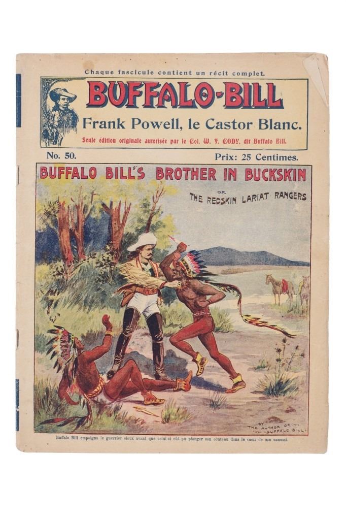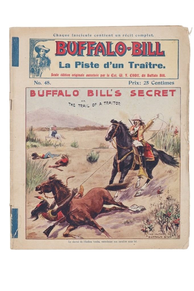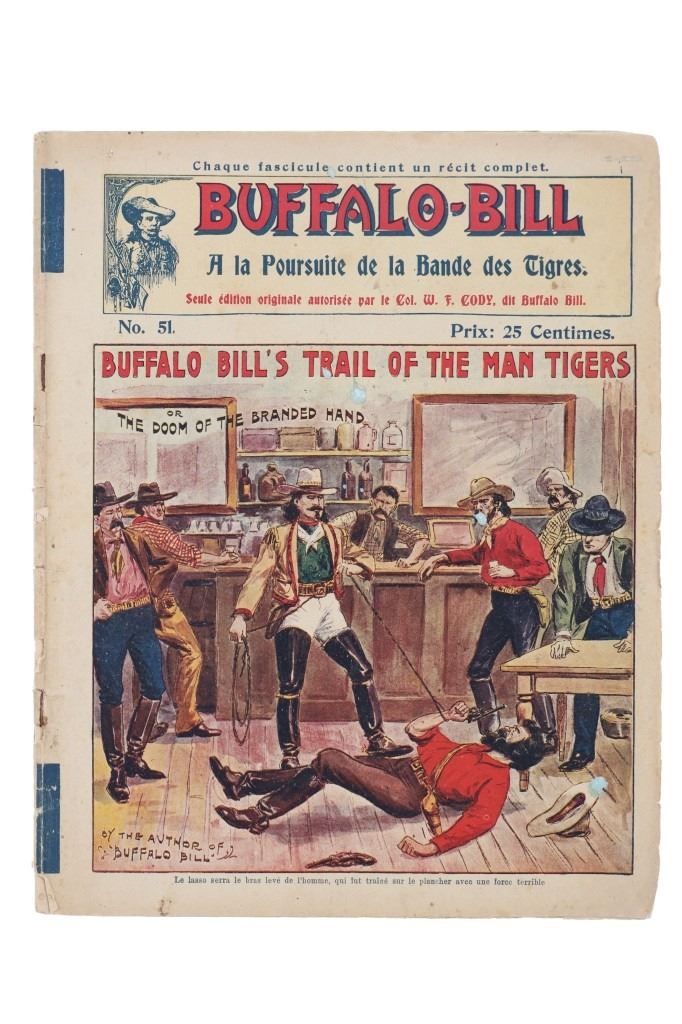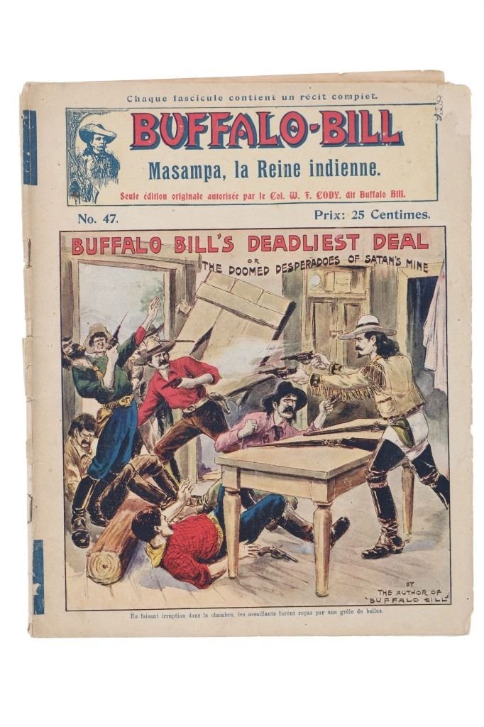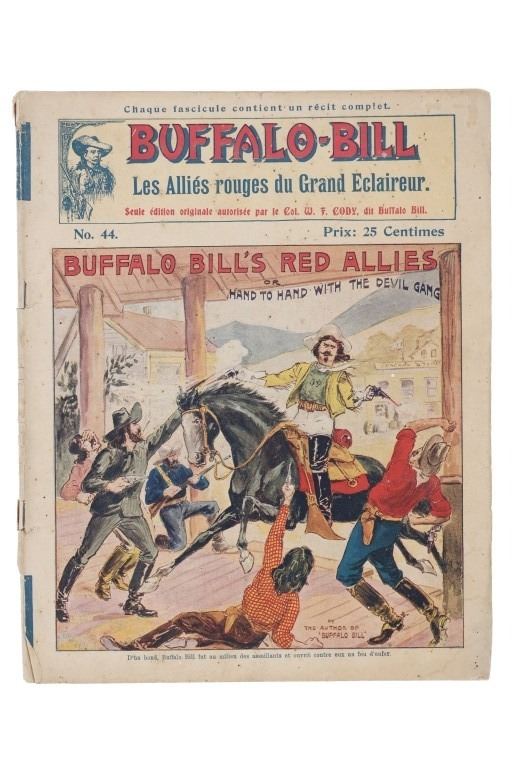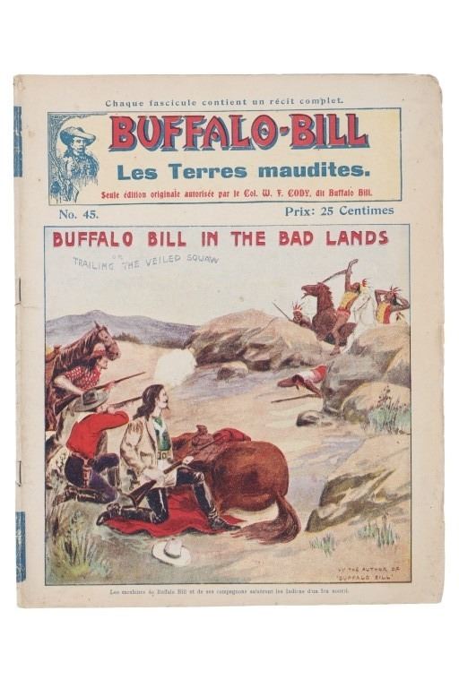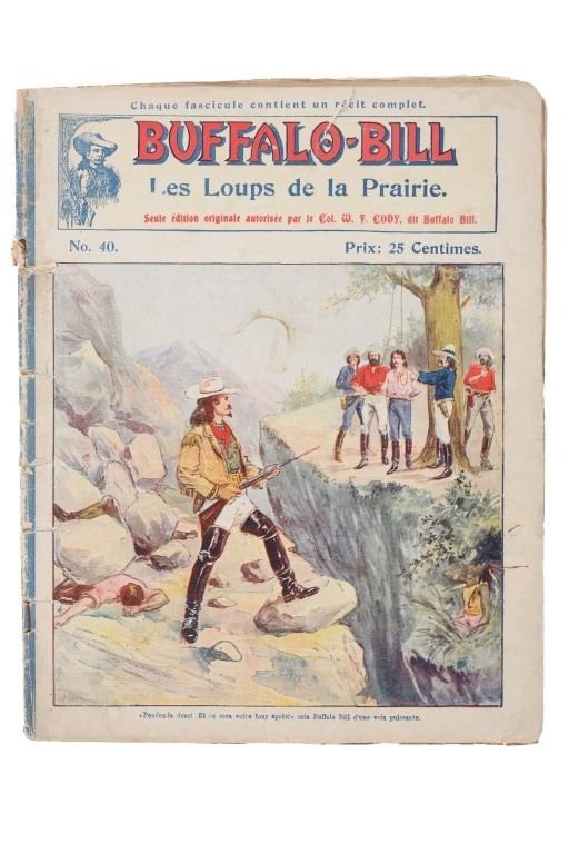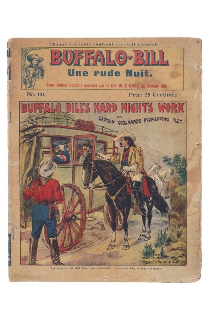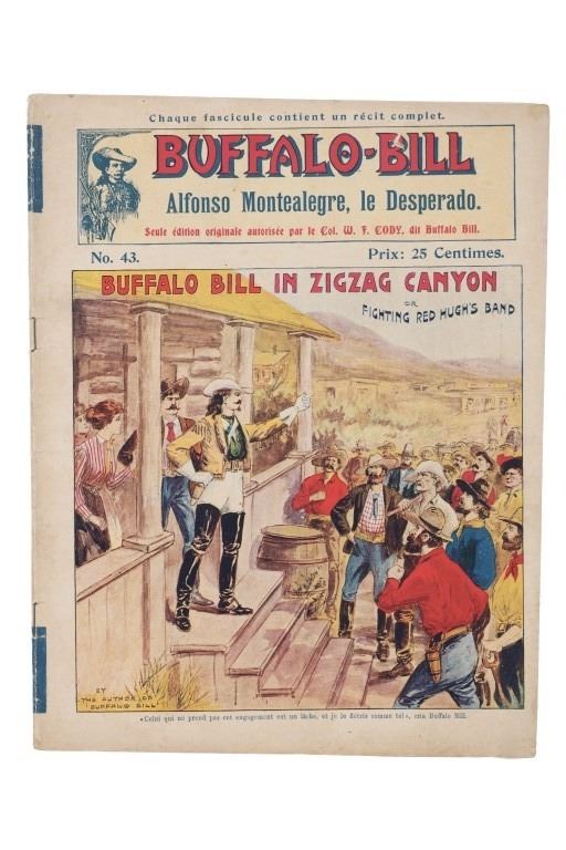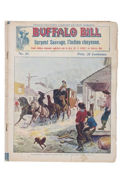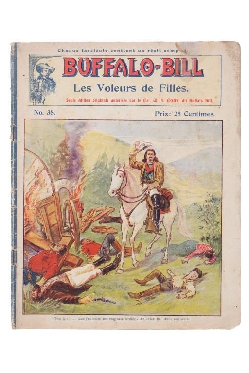 The lot features a set of twelve circa 1900 Buffalo Bill Heroes of the West French Pulp Magazines. These William F. “Buffalo Bill” Cody magazines include issue numbers 34,38, 40, 43, 44, 45, 46, 47, 48, 50, 51, and 110. These “Buffalo Bill Stories” were a weekly publication of pulp magazine printed and distributed in Paris, France (published by Street & Smith in New York). These date around 1900 and are only editions authorized by Cody himself, according to the sub-title on each issue. Each issue has a chromolithograph cover illustrating some aspect of the featured story. The colorful imagery shows desirable images of the west include Buffalo Bill driving a stagecoach, coming onto a wagon accident, stopping a hanging, W.F. Cody in a shootout and more. The titles include: Serpent Sauvage, I’Indien cheyenne; Les Voleurs de Filles; Les Loup de la Prairie; Buffal Bill in Zigzag Canyon or Fighting Red Hugh’s Band; Buffalo Bill’s Red Allies or Hand to Hand with the Devil Gang; Buffalo Bill in the Bad Lands or Trailing the Veiled Squaw; Buffalo Bill’s Trail of the Ghost Dancers or The Sioux Chief’s Secret; Buffalo Bill’s Deadliest Deal or The Doomer Desperadoes of Satan’s Mine; Buffalo Bill’s Secret or The Trail of a Traitor; Buffalo Bill’s Brother in Buckskin or The Redskin Lariat Rangers; Buffalo Bill’s Trail of the Man Tigers or The Doom of the Branded Hand; and Buffalo Bill’s Hard Night’s Work or Captain Coolhand’s Kidnapping Plot. These are highly desirable with beautiful original artwork and stories from Buffalo Bill, selling for has high as the set sold by Heritage Auction in their June 2014 sale for $1,250. Some loss to the edge and spine, see pictures for condition. Mostly appear complete and display well. Each issue measures approx. 10 5/8-inches by 8 5/8-inches and all together are about 1.5-inches high.