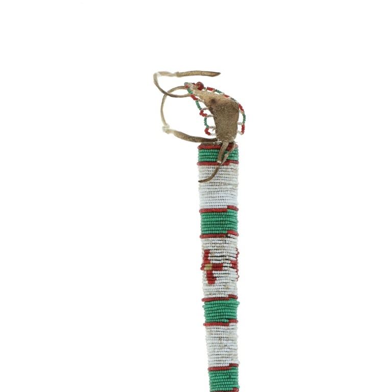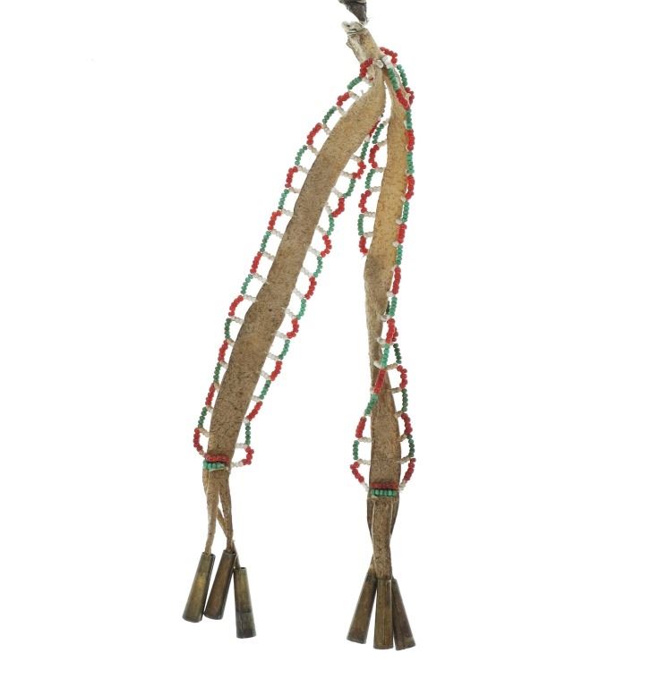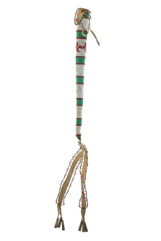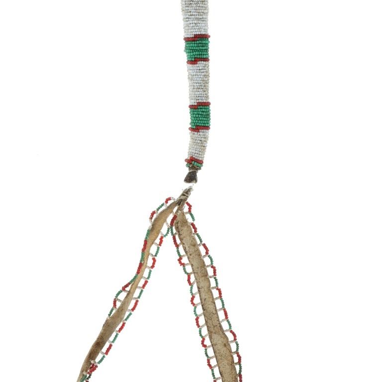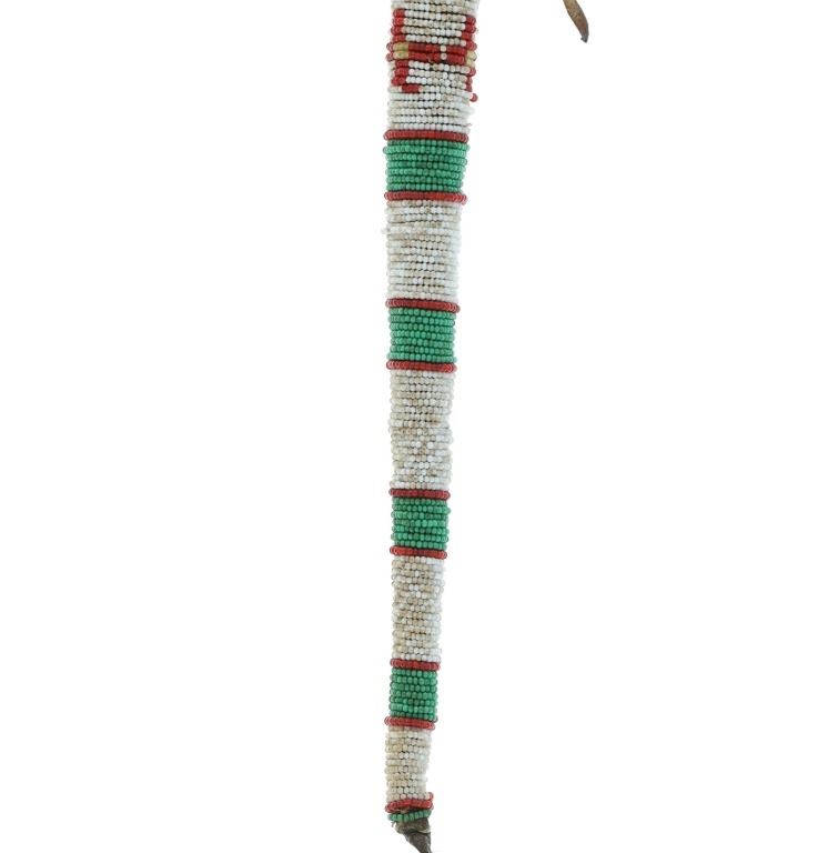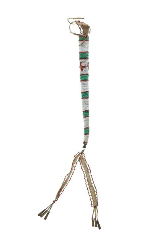The lot features a beaded hide awl case dating to the early 1900's from the Crow Native American Indians from Montana. The piece shows a typical awl case pattern with parfleche rawhide cone shape, wrapped in Indian tanned buckskin hide with is completely covered in early glass trade seed bead beadwork with a banded geometric pattern. The top flap and bottom fringes have a unique fancy beaded design. The bottom fringe piece has separated from the case itself as shown. The beads include some petit beads and overall the colors are as such: chalk white, red white heart and medium green. The bottom fringe shows rolled brass or copper jingle dangle cone set. The top strap shows a wound glass red white heart bead and some later added hide ties. Overall a nice set. With the bottom fringe the case measures 17.25"L.