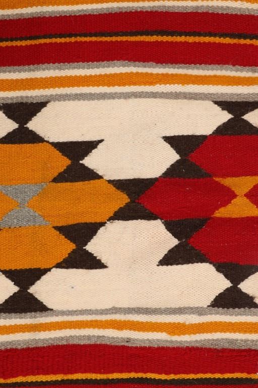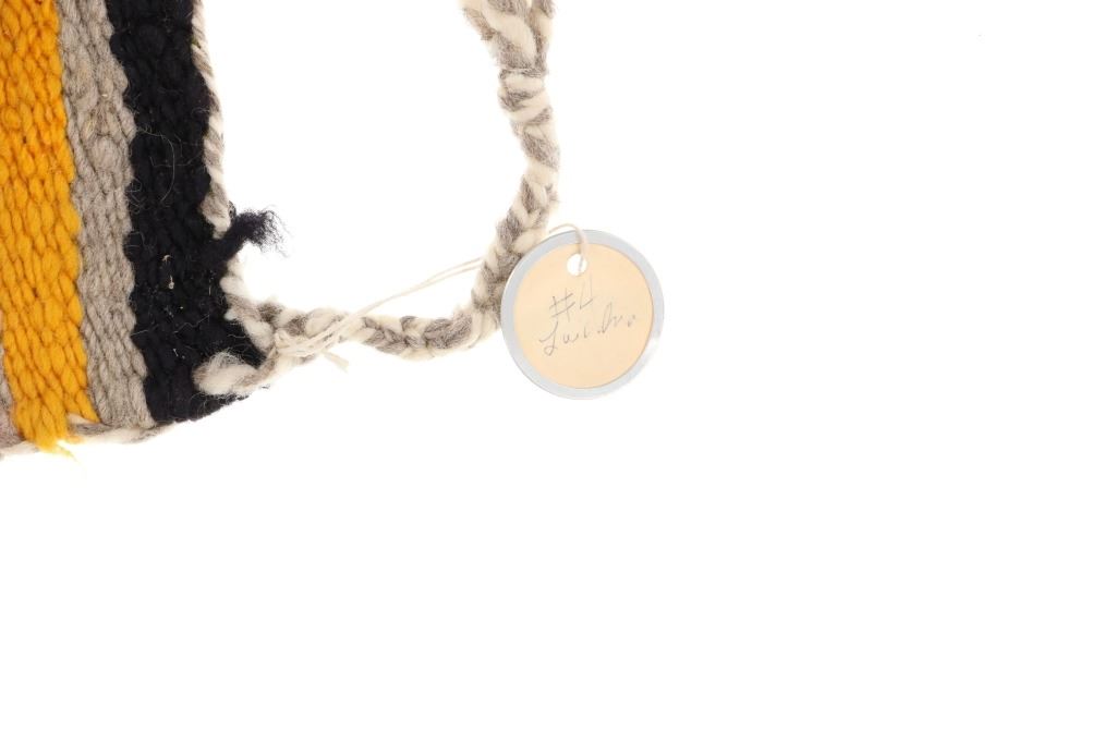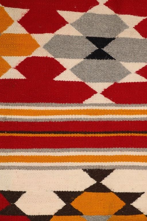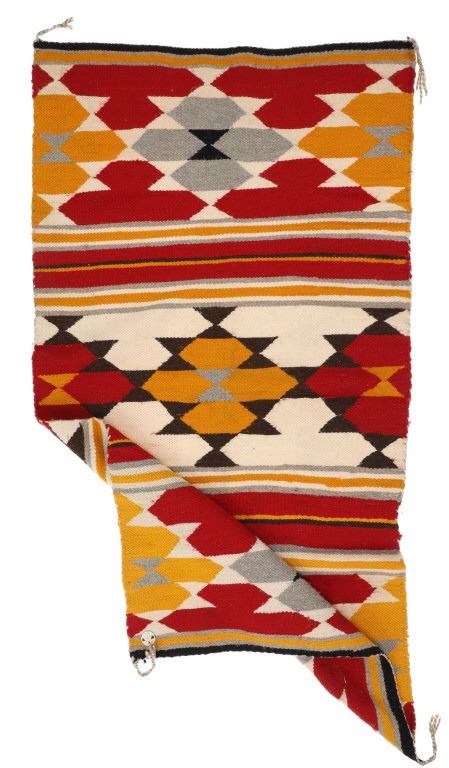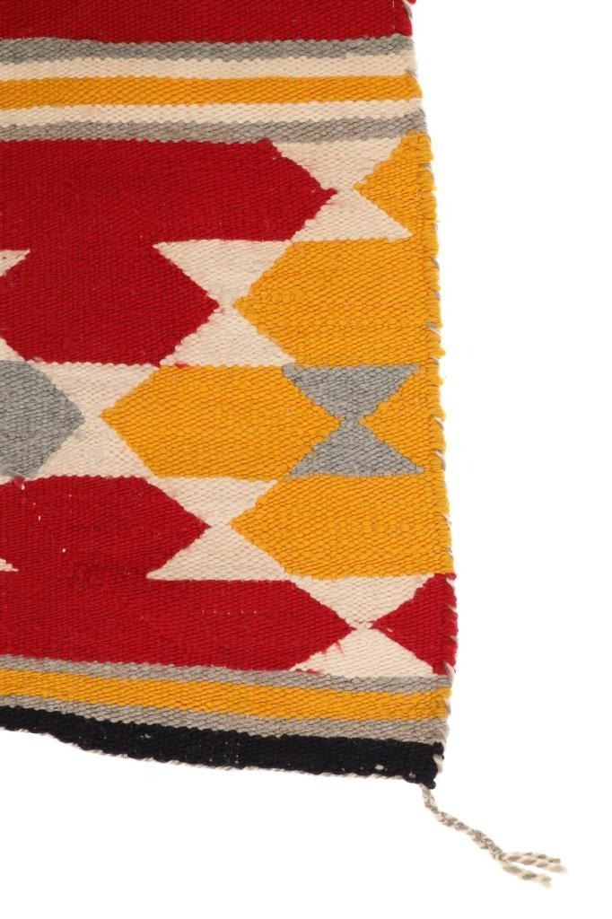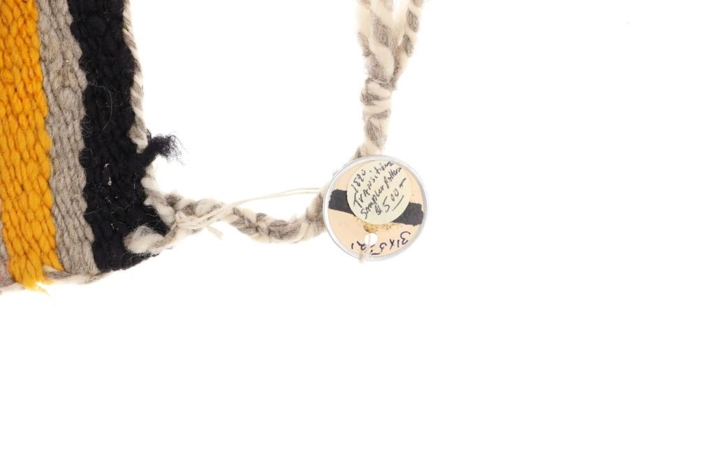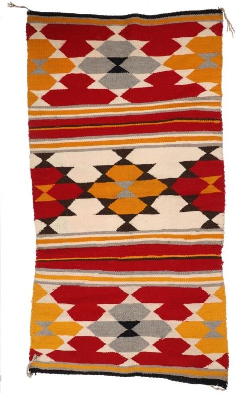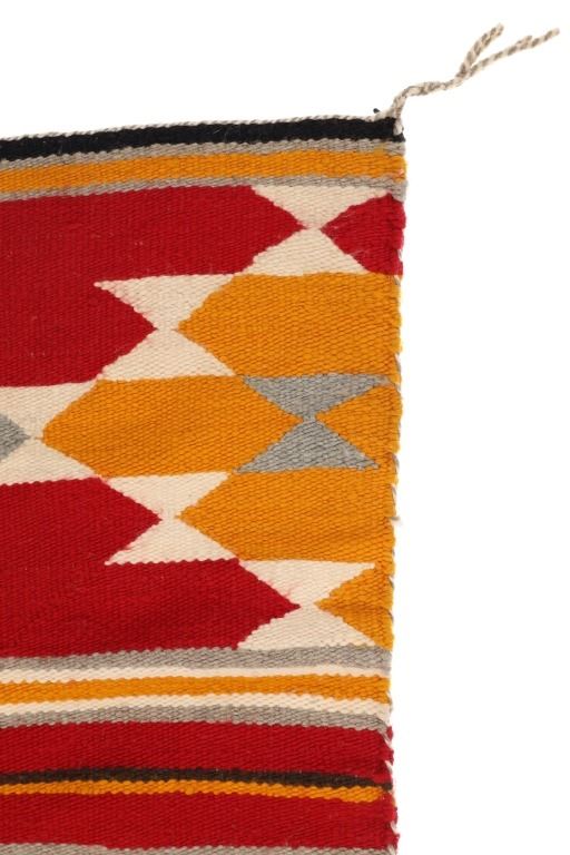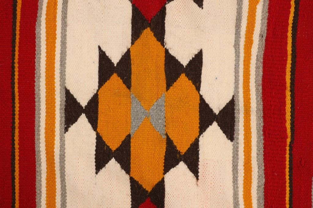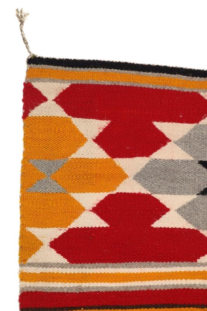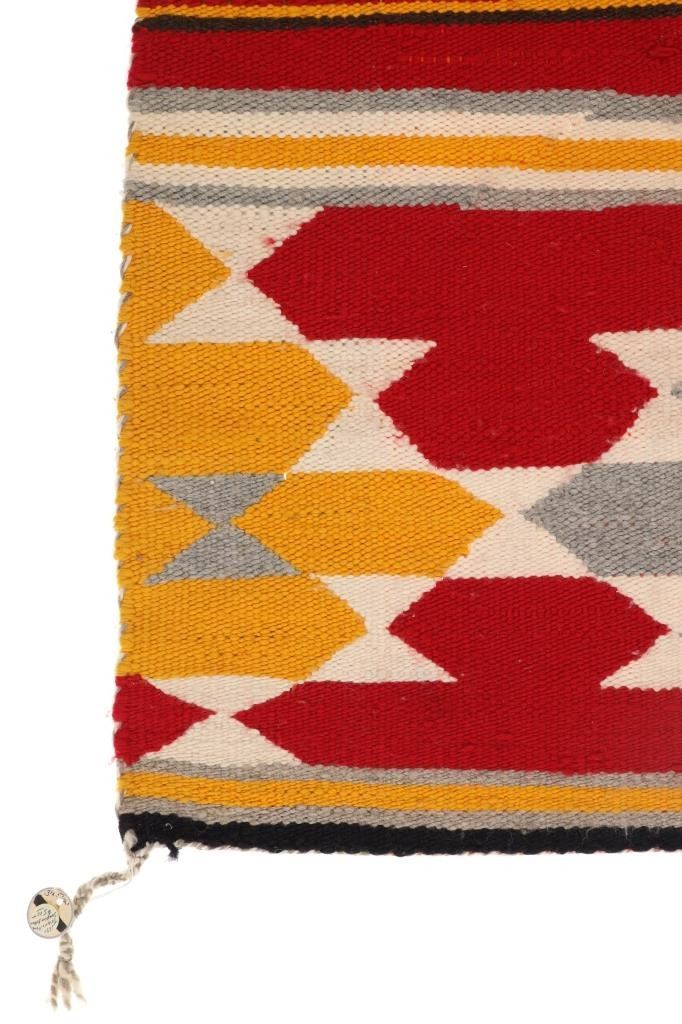 Featured in this lot is this Navajo transitional pattern wool blanket circa 1900-. The blanket features a wonderfully and professionally crafted wool construction that shows a thicker yearn with bands of yellow, grey, dark brown, red, black, and off white with tassels in the corners of the rug. The rug shows a tag that is marked and dated as follows: Transitional Sampler Blanket - 1890. Navajo Transitional blankets (also frequently called Navajo Transitional rugs) were a specific type of textile created by Navajo weavers from about 1885 to 1910. In terms of construction, you can think of these Transitional weavings as being “in between” a rug and a blanket: They are thicker and heavier than a Navajo wearing blanket yet softer and less rugged than a Navajo rug. The reason for this midway state is that Transitionals were woven during the time that the pressures of a changing consumer market forced Navajo weavers to stop making blankets for wearing and instead weave floor rugs to sell to tourists and buyers back east. The change from weaving blankets to rugs did not occur overnight, taking a good 15 years to evolve. During this transitional time, weavers exhibited a wide range of innovative designs and color choices, bolstered both by the freedom of not needing to make the same kind of blankets that had been woven for generations and also having increased access (through the trading posts) to aniline synthetic dyes. The condition of this Navajo rug is well preserved with some slight wear but no bleeding and shows a well preserved condition. The measurements of this Navajo rug is 63" x 35". The thread count is 56 threads per square inch.