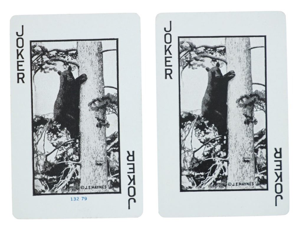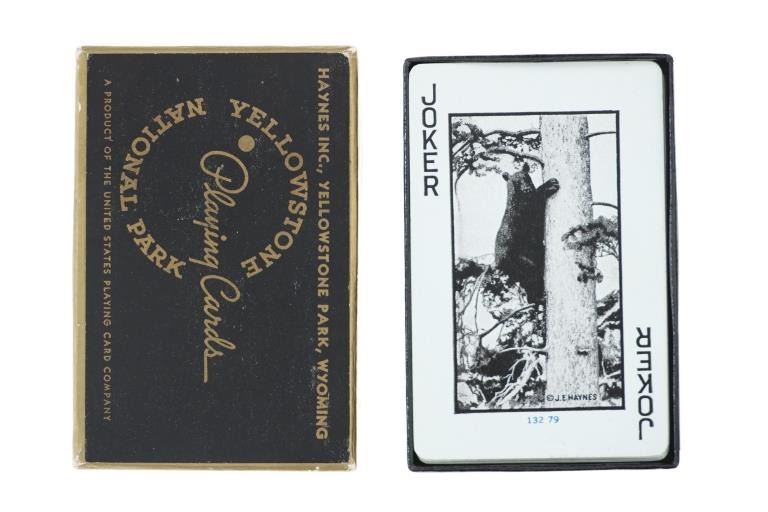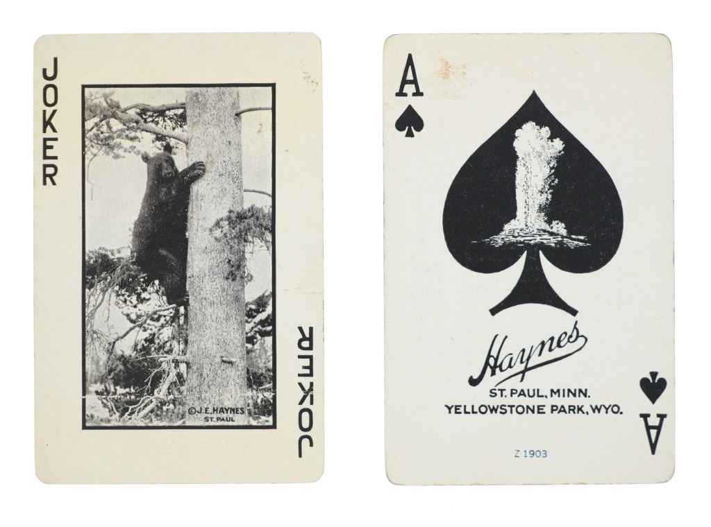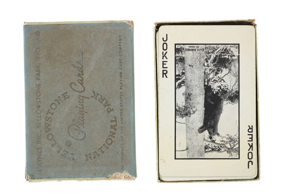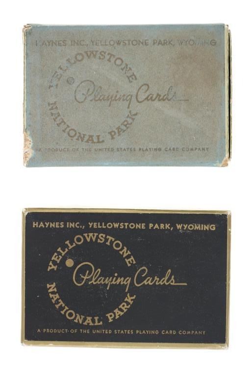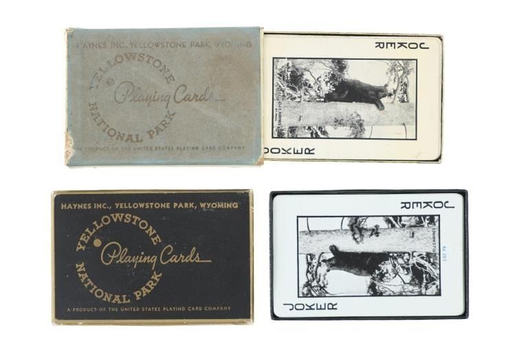 The lot features two sets of circa 1903-1935 Haynes Photographer Yellowstone National Park, Wyoming Playing Cards. The lot includes a light blue felt and gold set and a dark brown and gold set. Light blue set is marked on the ace of spades Haynes St. Paul, Minn. Yellowstone Park, Wyo. Z 1903. The dark brown set is marked on the ace of spades Haynes Bozeman, Mont. Yellowstone Park, Wyo. R 1935. The front of each is marked, “HAYNES INC., YELLOWSTONE PARK, WYOMING / YELLOWSTONE NATIONAL PARK Playing Cards A PRODUCT OF THE UNITED STATES PLAYING CARD COMPANY.” Both sets show the Old Faithful Geyser Haynes gilt colorized photograph on the back. Both sets show the J.E. Haynes St. Paul black bear climbing a tree photograph Joker 132 79. The light blue set shows 53 cards (52 number and face cards, 1 Joker card). The dark brown set shows 54 cards (52 number and face cards, 2 Joker cards). Measures 3.75-inches by 2 5/8-inches by ¾-inches each.