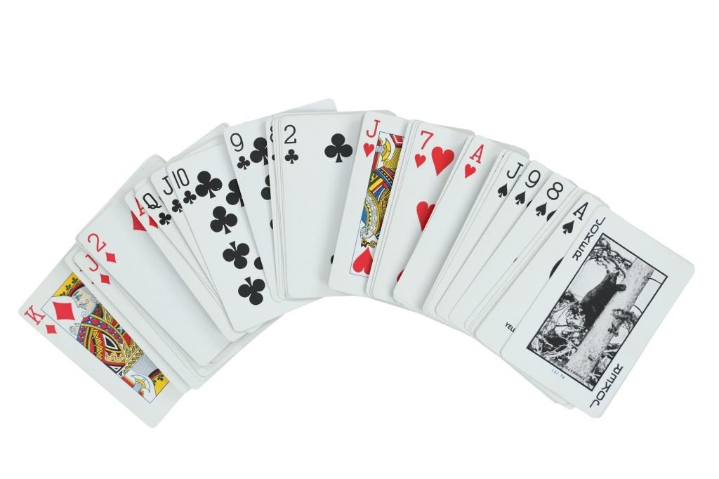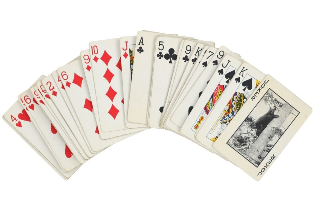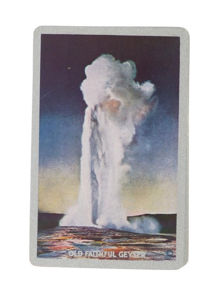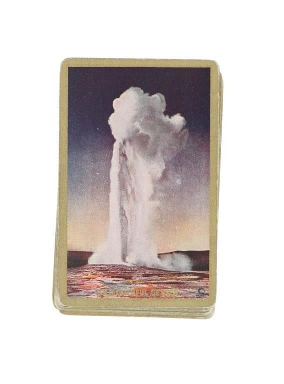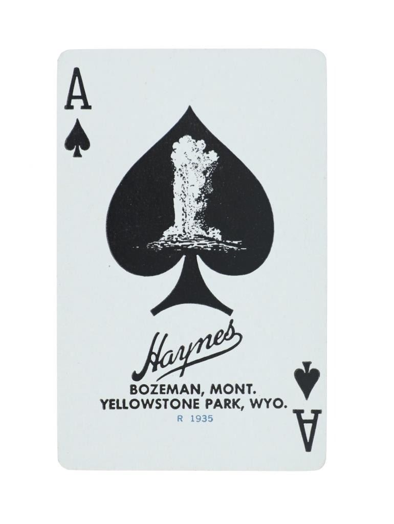 The lot features two sets of circa 1903-1935 Haynes Photographer Yellowstone National Park, Wyoming Playing Cards. The lot includes a light blue felt and gold set and a dark brown and gold set. Light blue set is marked on the ace of spades Haynes St. Paul, Minn. Yellowstone Park, Wyo. Z 1903. The dark brown set is marked on the ace of spades Haynes Bozeman, Mont. Yellowstone Park, Wyo. R 1935. The front of each is marked, “HAYNES INC., YELLOWSTONE PARK, WYOMING / YELLOWSTONE NATIONAL PARK Playing Cards A PRODUCT OF THE UNITED STATES PLAYING CARD COMPANY.” Both sets show the Old Faithful Geyser Haynes gilt colorized photograph on the back. Both sets show the J.E. Haynes St. Paul black bear climbing a tree photograph Joker 132 79. The light blue set shows 53 cards (52 number and face cards, 1 Joker card). The dark brown set shows 54 cards (52 number and face cards, 2 Joker cards). Measures 3.75-inches by 2 5/8-inches by ¾-inches each.