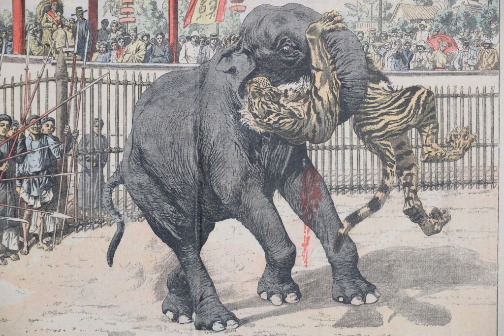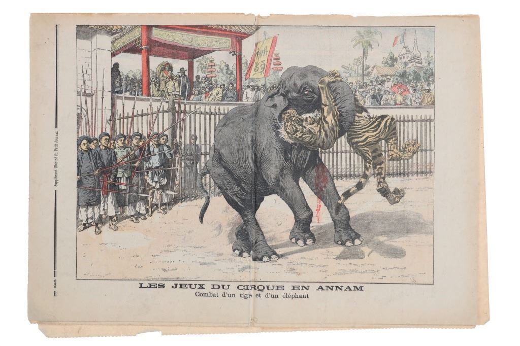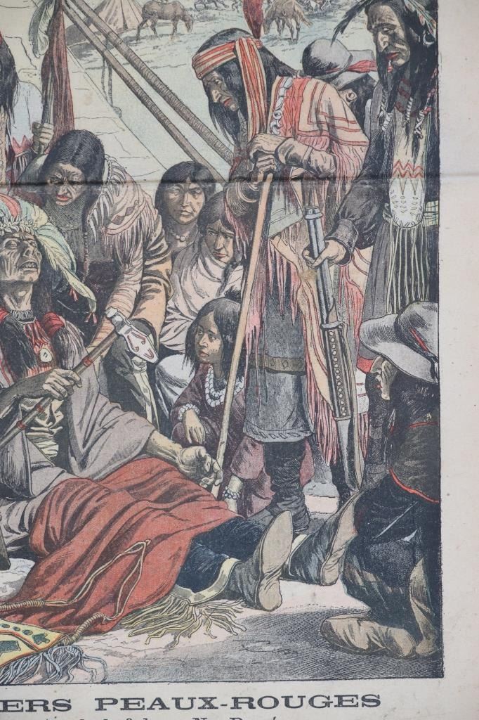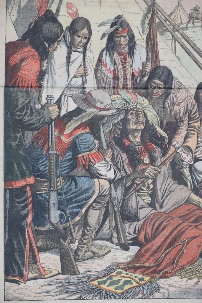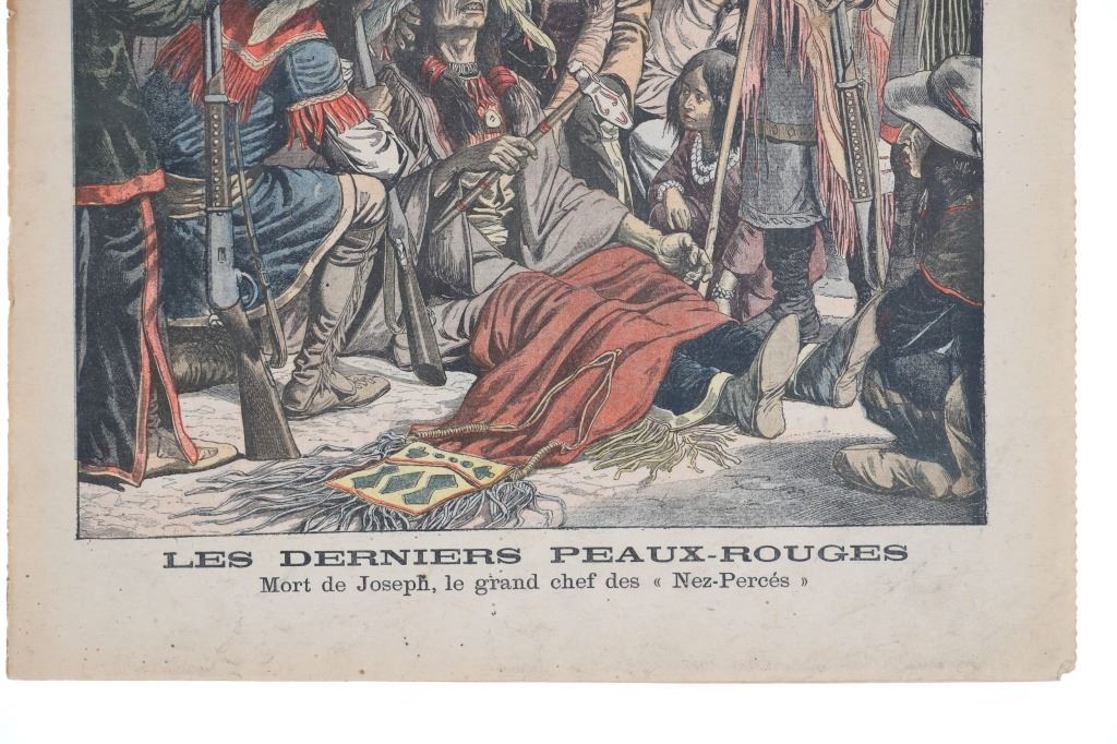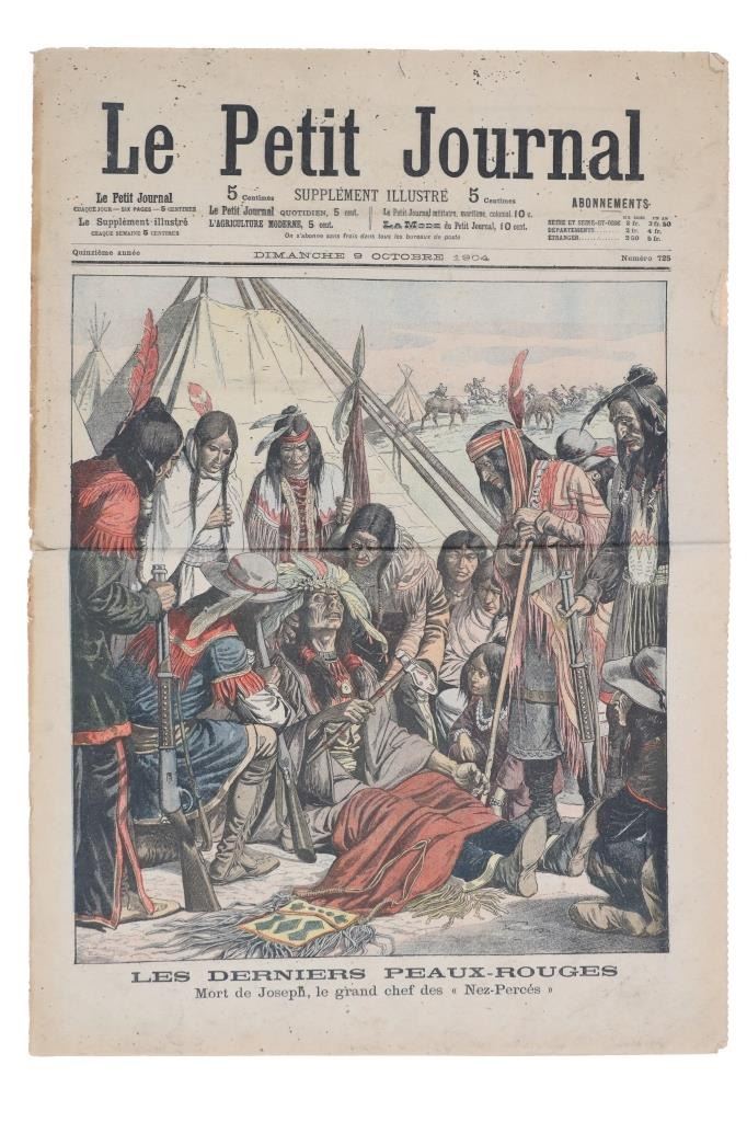 This is an original engraving Le Petit Journal colored images of the Death of Chief Joseph October 9, 1904, likely by Fortuné Louis Méaulle (1844-1916). This illustration has a very romantic depiction of the "Death of Chief Joseph", one of the "last of the redskins." with accompanying article. It is very interesting to not that the passing of the great Nez Perce Chief made the front page news in this French magazine. Believed to be the only publication showing this wonderful colored scene. The back cover shows an advertisement for "Les Jeux Du Cirque En Annam - Combat d'un tigre et d'um elephant" in excellent bright color. The wood-enraving image is not signed in the image but looks to be the work of Fortuné Louis Méaulle and Henri Meyer. The condition of this Le Petit Journal is well preserved with some minor wear to the corners and browning consistent with the age of the journal. The measurements of this journal is 17 3/4" x 12 3/8".