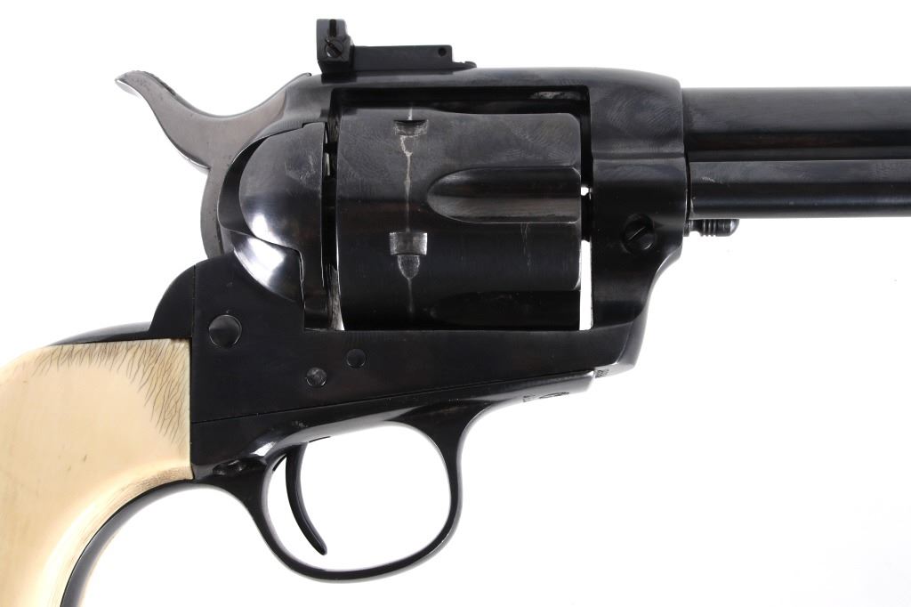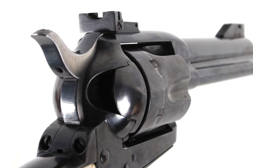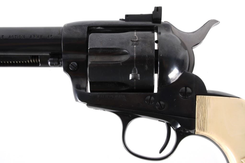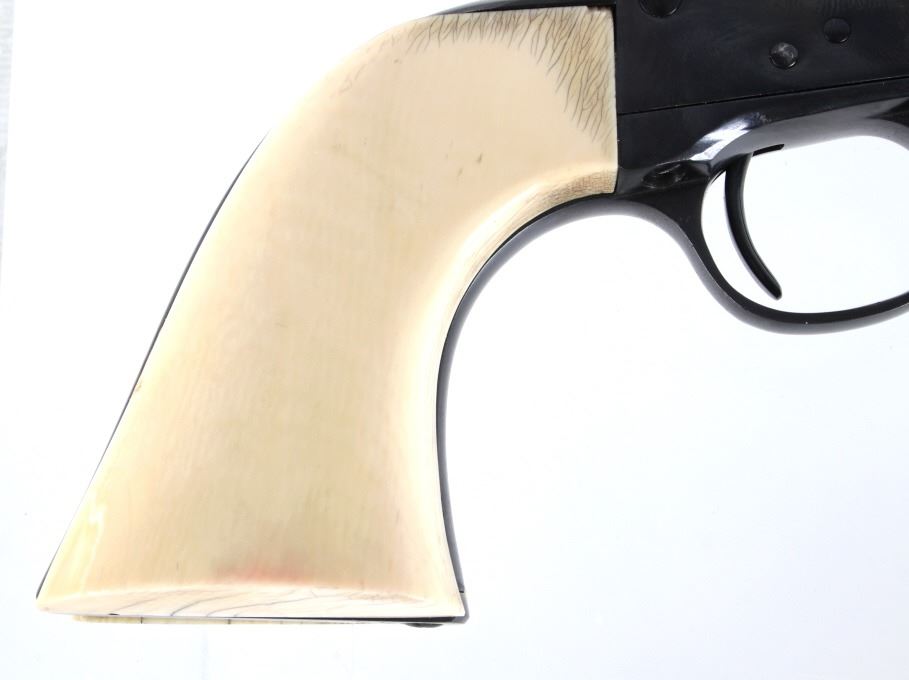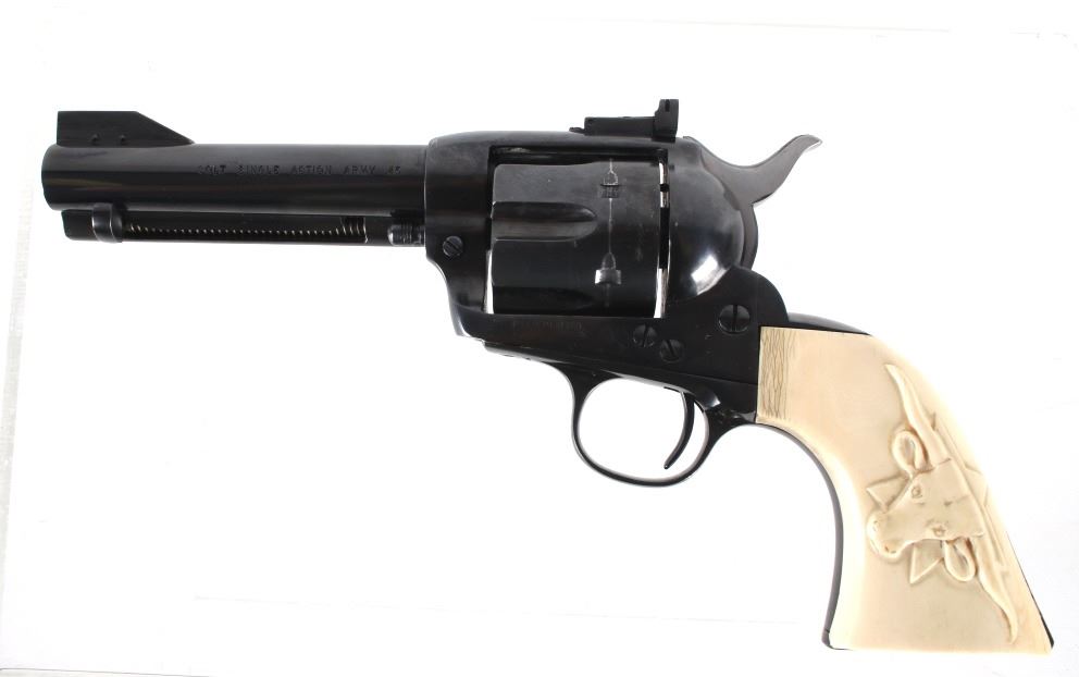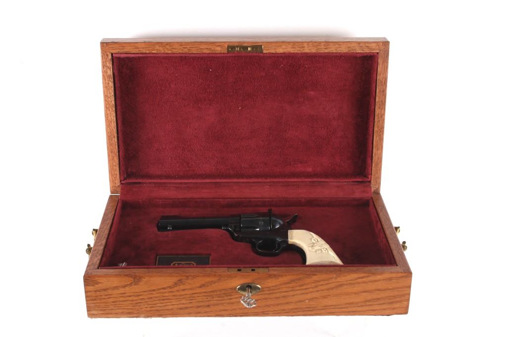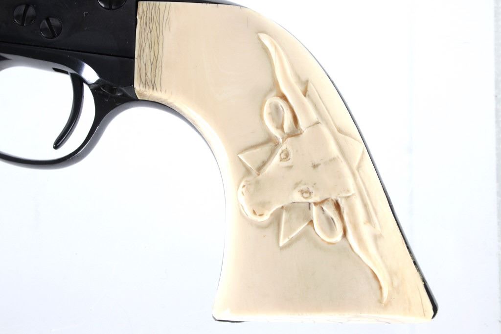This is an original circa 1907 Colt Single Action Army Model 1873 first model revolver which is chambered in .45 caliber with original antique bone / tusk carved grips with long horn steer carving. The revolver has been paired with a later John Wayne Commemorative SAA box case and the barrel and sites appear to be later additions as well. The revolver was manufactured by Colt in 1907. The piece displays a 4 5/8" long barrel, six-shot cylinder, bone grips, under barrel hand ejector, and blue'd finish. The bone grips features an embossed depiction of a longhorn steer over a five pointed star. The barrel is marked across the side "COLT SINGLE ACTION ARMY .45" with the top reading "COLT'S PT.F.A. MFG. CO. HARTFORD CT. U.S.A.". The side of the frame is marked with "PAT SEPT. 19. 1871 JULY. 3. 72. JAN. 19. 75.". The frame, trigger guard, and grip display matching serial numbers. The revolver comes with a Colt John Wayne Commemorative lock box with oak construction and red leather interior. The revolver shows good condition with some light action wear on the cylinder and the box showing good condition. The revolver and box weighs 8lbs 12oz. The box measures 9 1/4" wide by 17 1/4" long and 4 1/4" tall. Serial Number: 288084. This firearm qualifies as a Curio & Relic firearm, and requires FFL Transfer or NICS Background Check.