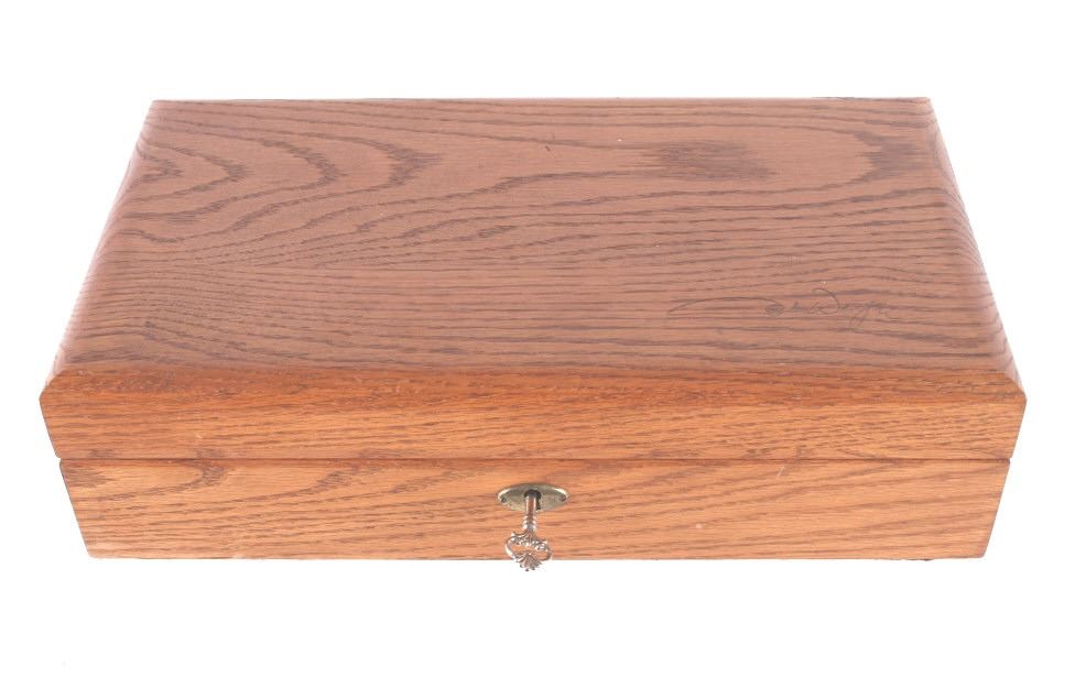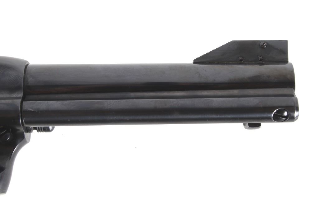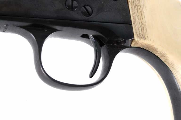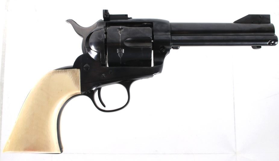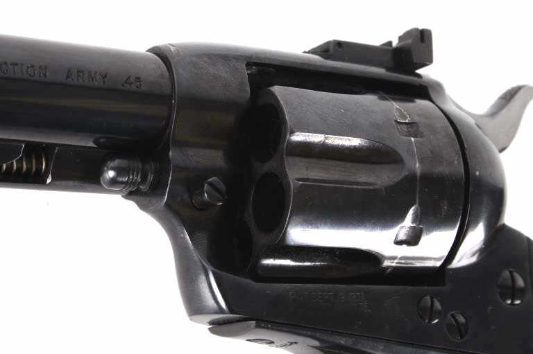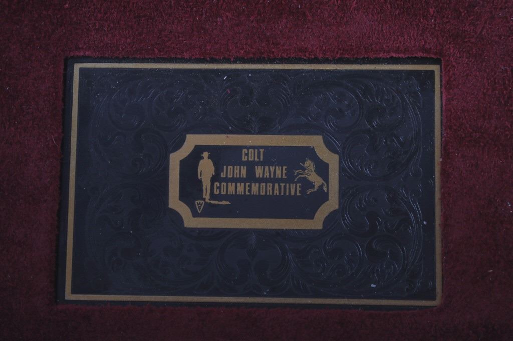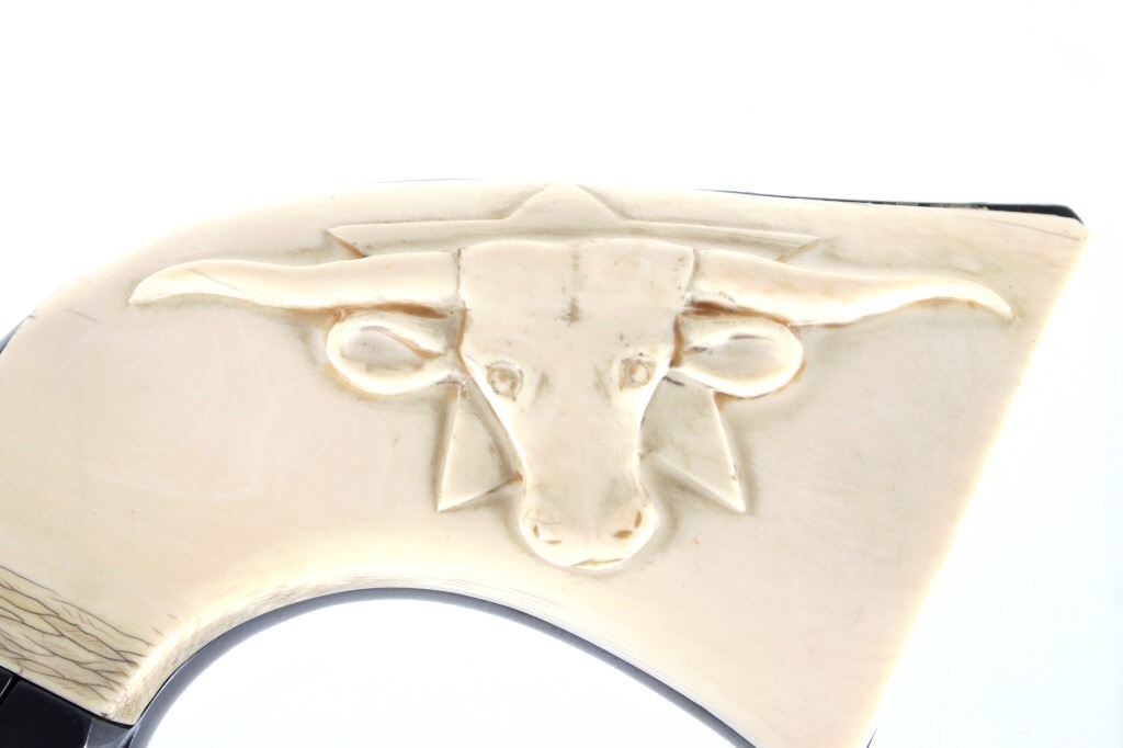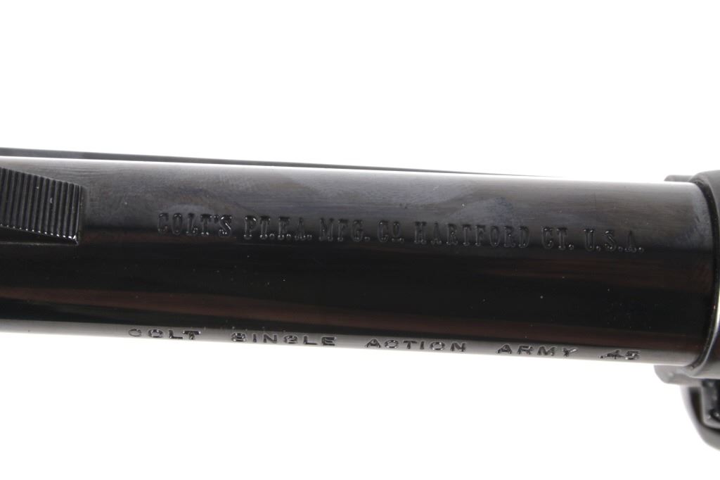 This is an original circa 1907 Colt Single Action Army Model 1873 first model revolver which is chambered in .45 caliber with original antique bone / tusk carved grips with long horn steer carving. The revolver has been paired with a later John Wayne Commemorative SAA box case and the barrel and sites appear to be later additions as well. The revolver was manufactured by Colt in 1907. The piece displays a 4 5/8" long barrel, six-shot cylinder, bone grips, under barrel hand ejector, and blue'd finish. The bone grips features an embossed depiction of a longhorn steer over a five pointed star. The barrel is marked across the side "COLT SINGLE ACTION ARMY .45" with the top reading "COLT'S PT.F.A. MFG. CO. HARTFORD CT. U.S.A.". The side of the frame is marked with "PAT SEPT. 19. 1871 JULY. 3. 72. JAN. 19. 75.". The frame, trigger guard, and grip display matching serial numbers. The revolver comes with a Colt John Wayne Commemorative lock box with oak construction and red leather interior. The revolver shows good condition with some light action wear on the cylinder and the box showing good condition. The revolver and box weighs 8lbs 12oz. The box measures 9 1/4" wide by 17 1/4" long and 4 1/4" tall. Serial Number: 288084. This firearm qualifies as a Curio & Relic firearm, and requires FFL Transfer or NICS Background Check.