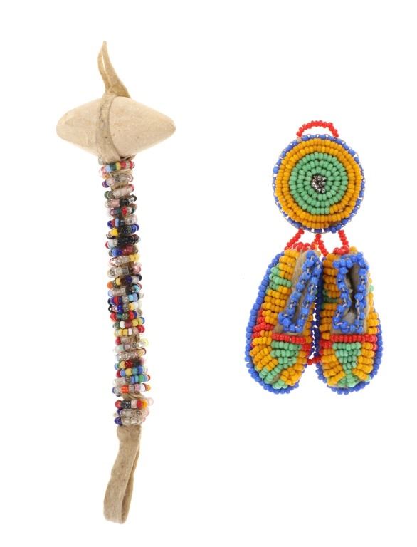 The lot features two Sioux beaded miniatures from the Duhamel Trading Post in Rapid City, South Dakota dating to circa 1907-1920’s. Both beaded pieces are from the Sioux at Pine Ridge Indian Reservation. The Duhamel Trading Post was established in Rapid City, South Dakota in 1907 by Pete Duhamel, born in 1839 in Canada and moved to Rapid City, Dakota Territory in 1879. A digital photograph is shown in the description of the inside of Duhamel Trading Post with the walls lined with Indian wares such as Indian blankets, rugs, sculpture, beadwork, leather goods and more. First shows a bi-point stone head skull cracker war club with Indian hide wrapped head and wrapped handle which is covered in glass trade seed beadwork that is sinew sewn in a “crazy” pattern, the bottom has an Indian hide loop. The war club head is carved from stone and has a small chip. Next is a set of Sioux beaded Indian hide moccasins hanging from a beaded medallion trade thread sewn with glass trade seed beadwork in colors of greasy yellow, greasy green, medium blue and red / orange having a small section of faceted metal beads. From the Duhamel Trading Post and Pine Ridge Indian Reservation from the Sioux circa 1907-1920’s. War club measures 5”L by 1 3/8”W. The moccasins and medallion measures 3” by b 1.5”.