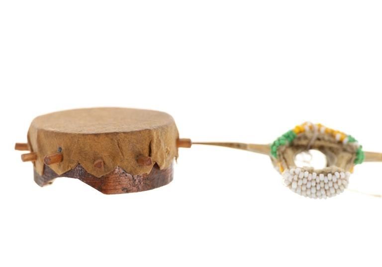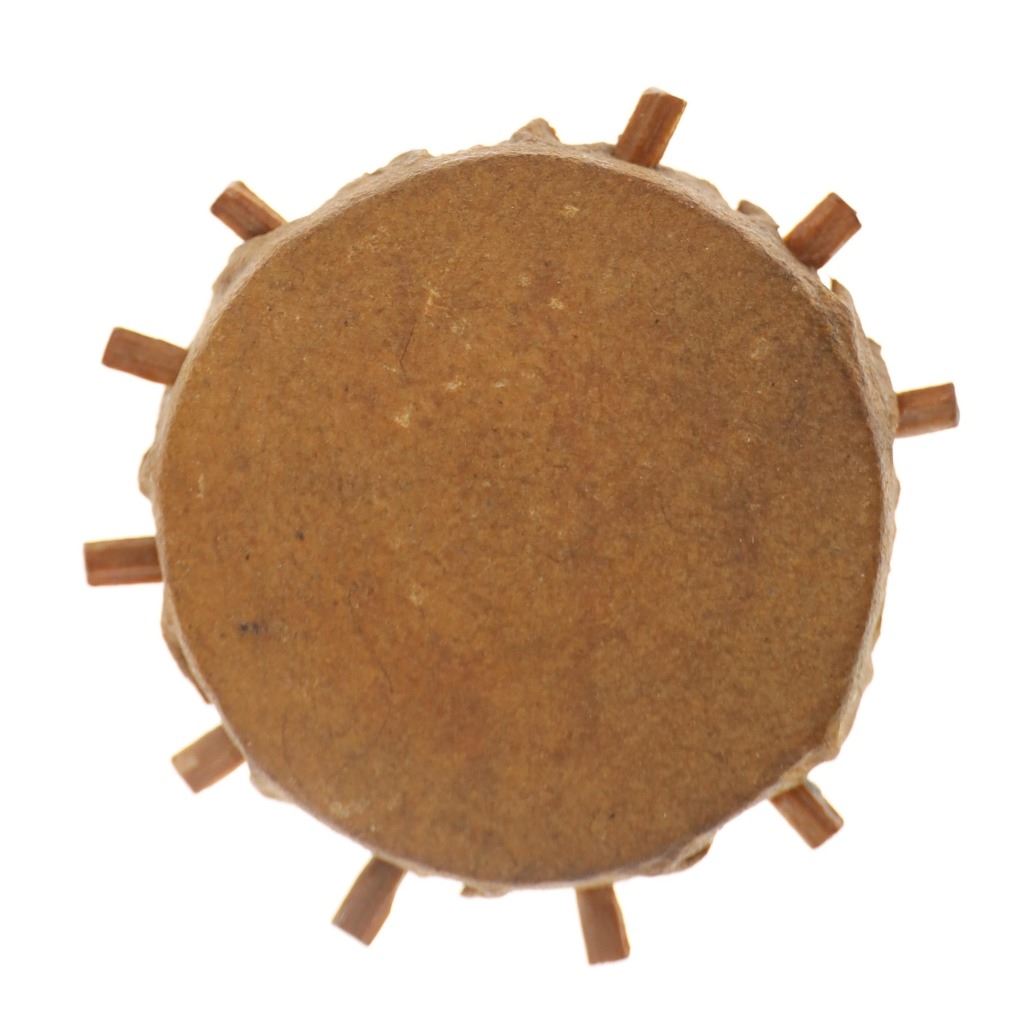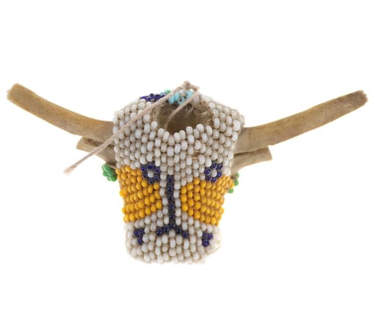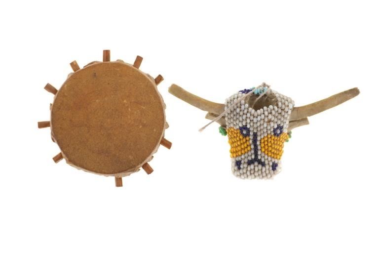 The lot features two Sioux miniatures, one beaded buffalo / steer skull and one war / dance drum, from the Duhamel Trading Post in Rapid City, South Dakota dating to circa 1907-1920’s. Both pieces are from the Sioux at Pine Ridge Indian Reservation. The Duhamel Trading Post was established in Rapid City, South Dakota in 1907 by Pete Duhamel, born in 1839 in Canada and moved to Rapid City, Dakota Territory in 1879. A digital photograph is shown in the description of the inside of Duhamel Trading Post with the walls lined with Indian wares such as Indian blankets, rugs, sculpture, beadwork, leather goods and more. First is the Buffalo / Bison or Steer / Bull skull miniature which is made from glass trade seed beadwork over a bone vertebra over a trade muslin being trade thread sewn. Next is a war drum or dance drum which is comprised of a carved wood hoop stretched with rawhide parfleche and held in place with spikes of wood. The beadwork of the skull shows a greasy white, greasy corn yellow, cobalt, sky padre blue and medium green. From the Duhamel Trading Post and Pine Ridge Indian Reservation from the Sioux circa 1907-1920’s. Skull measures 3.5”W by 1 5/8”. The drum measures 2.5” diameter by 7/8”H.