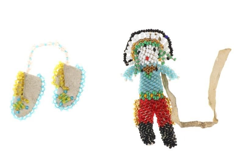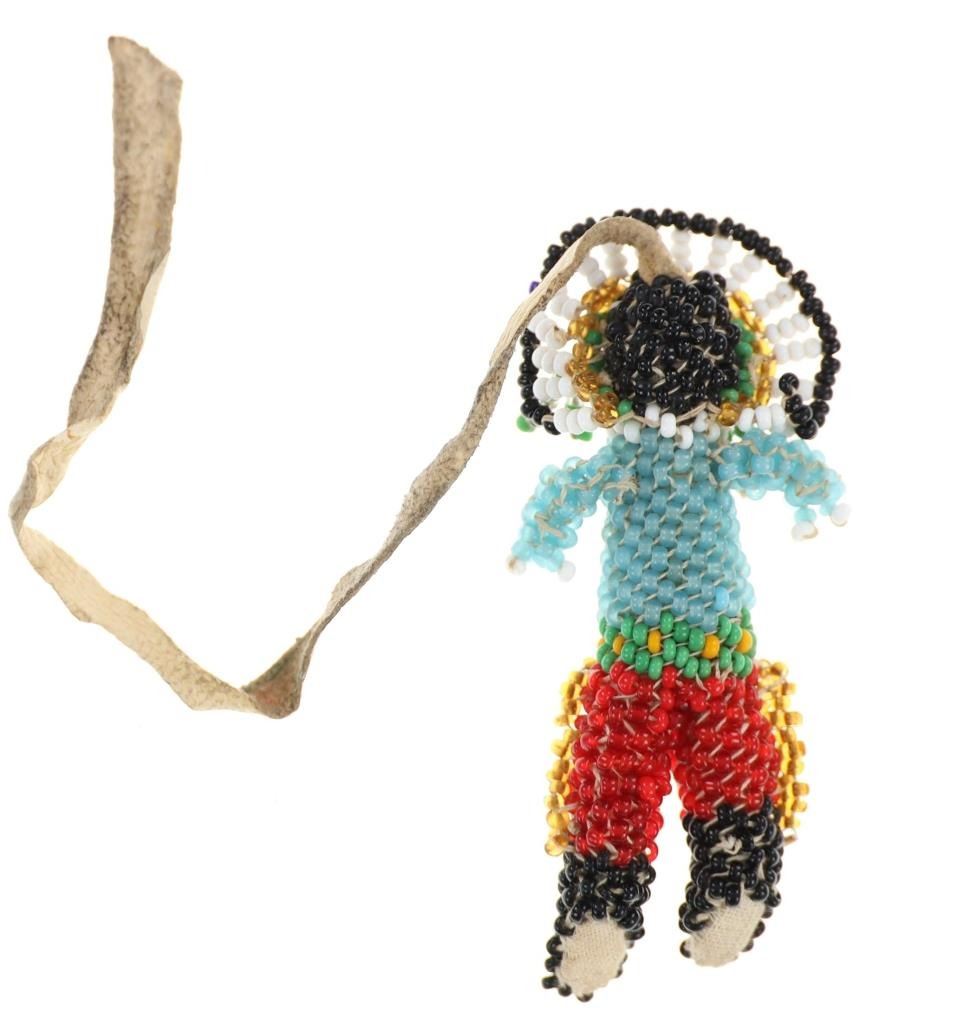 The lot features two Sioux beaded pieces from the Duhamel Trading Post in Rapid City, South Dakota dating to circa 1907-1930’s. Both pieces are from the Sioux at Pine Ridge Indian Reservation. The Duhamel Trading Post was established in Rapid City, South Dakota in 1907 by Pete Duhamel, born in 1839 in Canada and moved to Rapid City, Dakota Territory in 1879. A digital photograph is shown in the description of the inside of Duhamel Trading Post with the walls lined with Indian wares such as Indian blankets, rugs, sculpture, beadwork, leather goods and more. Frist is a beaded human effigy figure, in the shape of a War Chief being loom beaded over trade clothe using trade seed beads and an Indian tanned hide tie at the top. The figure shows a feathered headdress , beaded shirt and beaded leggings. The beadwork shows colors of greasy blue, chalk white, greasy green, butterscotch yellow, black, cobalt, amber, red and more. Also included is a set of Indian tanned hide beaded moccasins trade thread sewn with glass trade seed beadwork. Beaded in faceted light pink, along with semi-transparent light blue, yellow and green. Both are miniatures. From the Duhamel Trading Post and Pine Ridge Indian Reservation from the Sioux circa 1907-1920’s. Beaded figure is a total of 3”H with an additional 6”L Indian hide tie. The moccasins are about 2.5” by 1.75”W. U6.