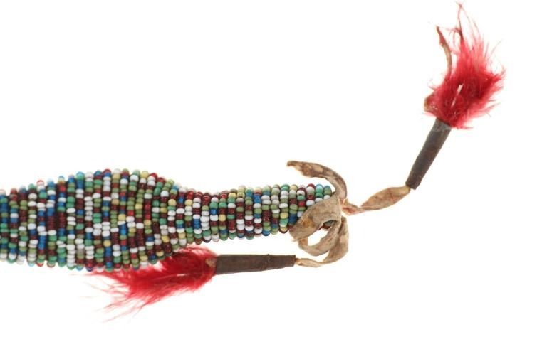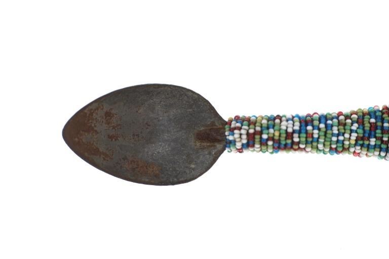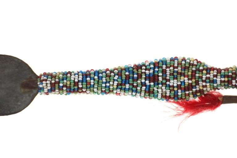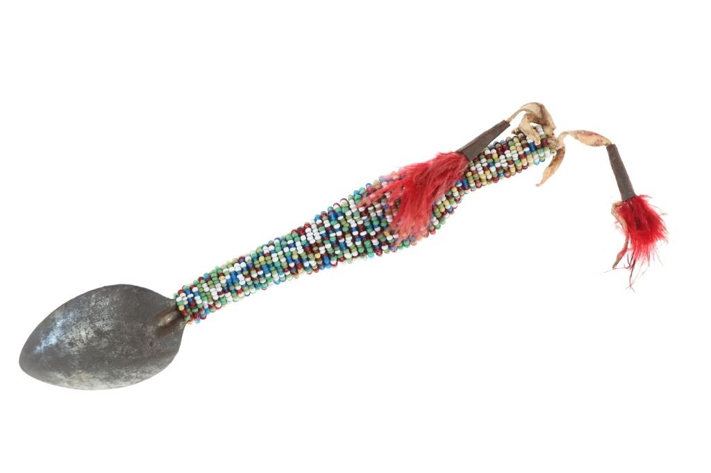 This is a circa 1910-1920's Crow beaded hide wrapped metal spoon. The piece shows a metal spoon at the center which has been wrapped in Indian tanned buckskin with thread sewing and is covered in thread sewn glass trade beads in a "crazy crow" or "crazy" pattern of random colors. The top shows Indian buckskin hide fringes with a red ocher coloring and two rolled tin jingle dangle metal cones with red plume feathers. The beads are all early example with colors of greasy yellow, greasy green, semi-transparent red, chalk white, medium green, greasy blue. The piece shows little to no bead loss and is well kept. Measures overall 7.25-inches long with an additional 2-inches of fringe by about 1 3/8-inches at its widest.
