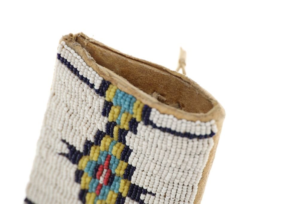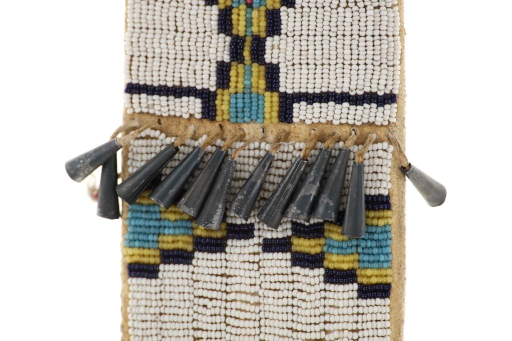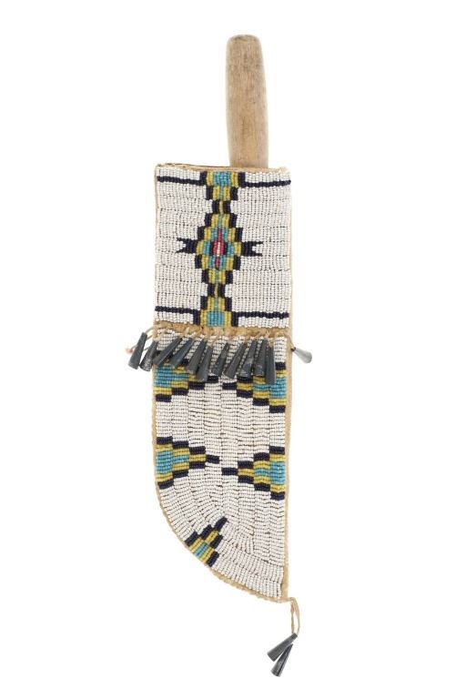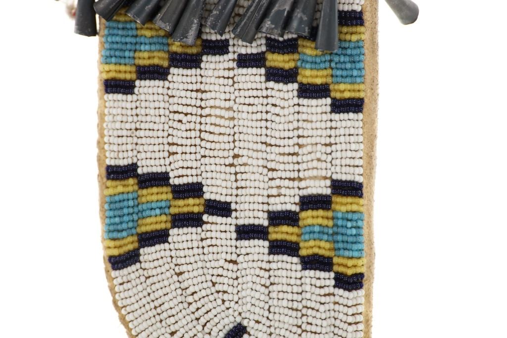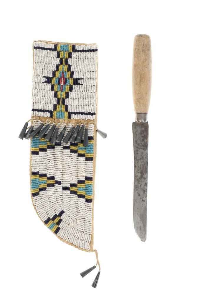 The lot features an Indian hide knife sheath with parfleche lining adorned with beautiful beadwork dating to circa 1910-1930's from the Sioux of the Northern Plains. The sheath shows Indian tanned hide that is sinew sewn and has a parfleche rawhide hard inside lining. The front is covered in trade thread sewn classic geometric patterns commonly seen on Sioux beadwork showing a chalk white background and triangle and stepped patterns in black, greasy yellow, red white heart, greasy blue and cobalt. The center shows Indian hide fringes with rolled tin jingle dangle cones and the top a belt strap. The bottom also has fringes with rolled tin jingle dangle cones. The piece is paired with a Dexter trade knife dating to circa 1930-1940's with one piece wood handle. The sheath was likely traded soon after being crafted as it is well kept. The sheath itself without fringes measures 10-inches long by 3.25-inches wide. Knife is 10-inches long.