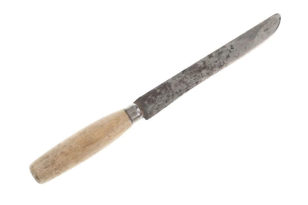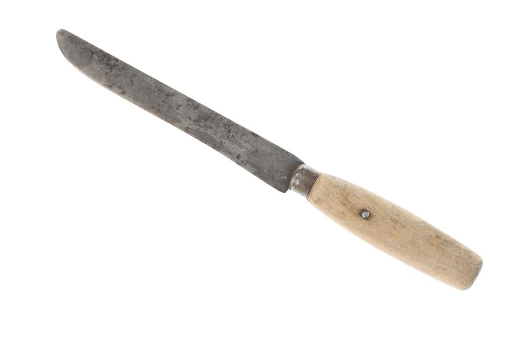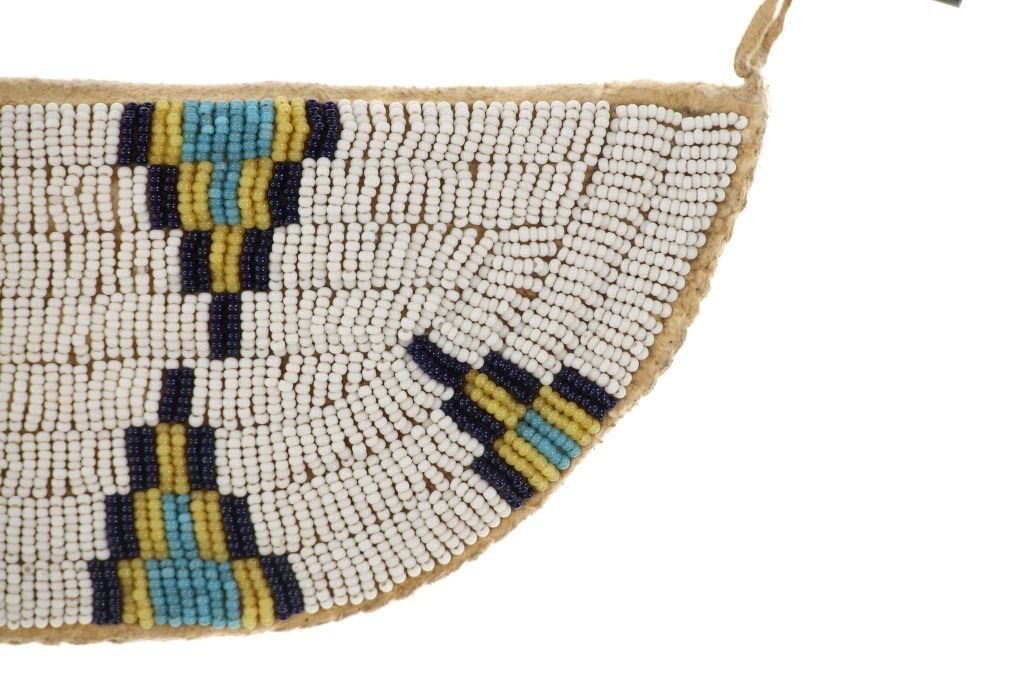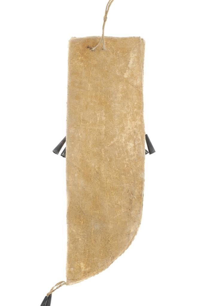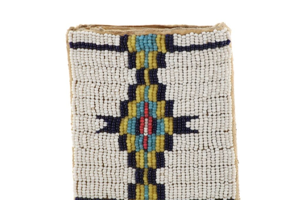The lot features an Indian hide knife sheath with parfleche lining adorned with beautiful beadwork dating to circa 1910-1930's from the Sioux of the Northern Plains. The sheath shows Indian tanned hide that is sinew sewn and has a parfleche rawhide hard inside lining. The front is covered in trade thread sewn classic geometric patterns commonly seen on Sioux beadwork showing a chalk white background and triangle and stepped patterns in black, greasy yellow, red white heart, greasy blue and cobalt. The center shows Indian hide fringes with rolled tin jingle dangle cones and the top a belt strap. The bottom also has fringes with rolled tin jingle dangle cones. The piece is paired with a Dexter trade knife dating to circa 1930-1940's with one piece wood handle. The sheath was likely traded soon after being crafted as it is well kept. The sheath itself without fringes measures 10-inches long by 3.25-inches wide. Knife is 10-inches long.