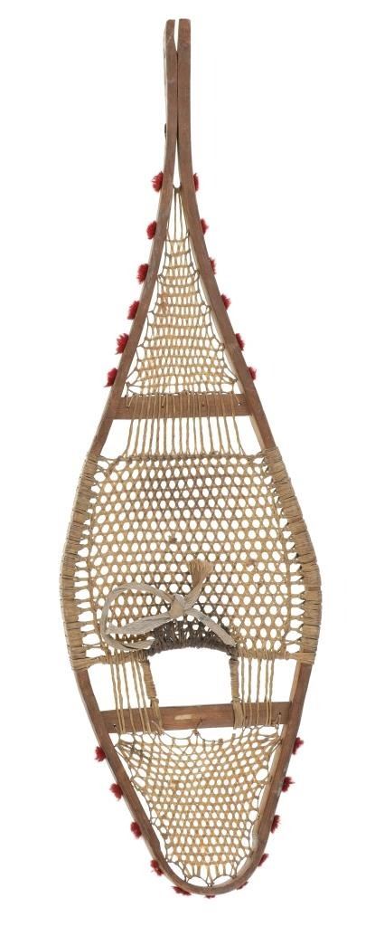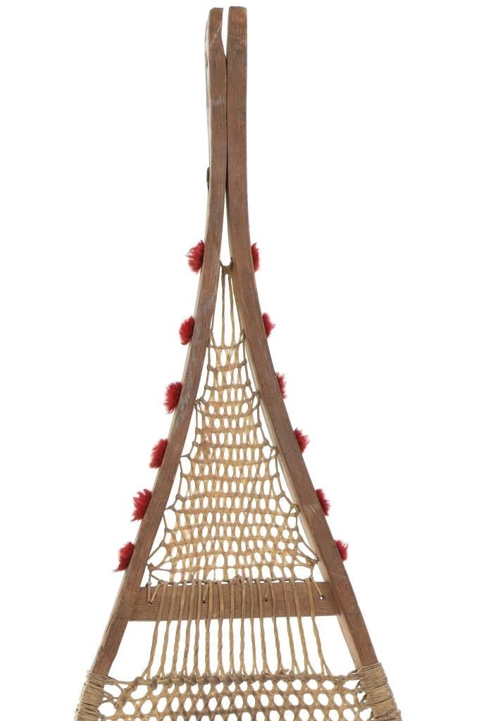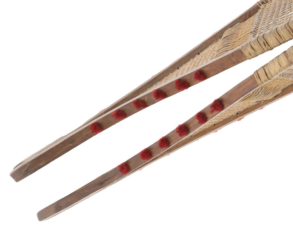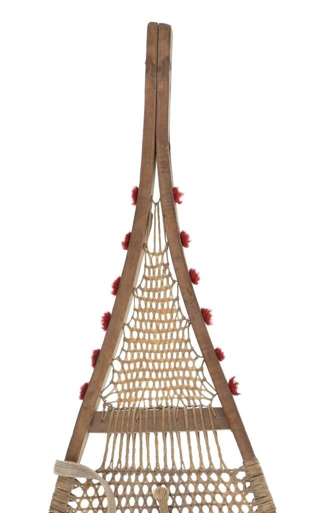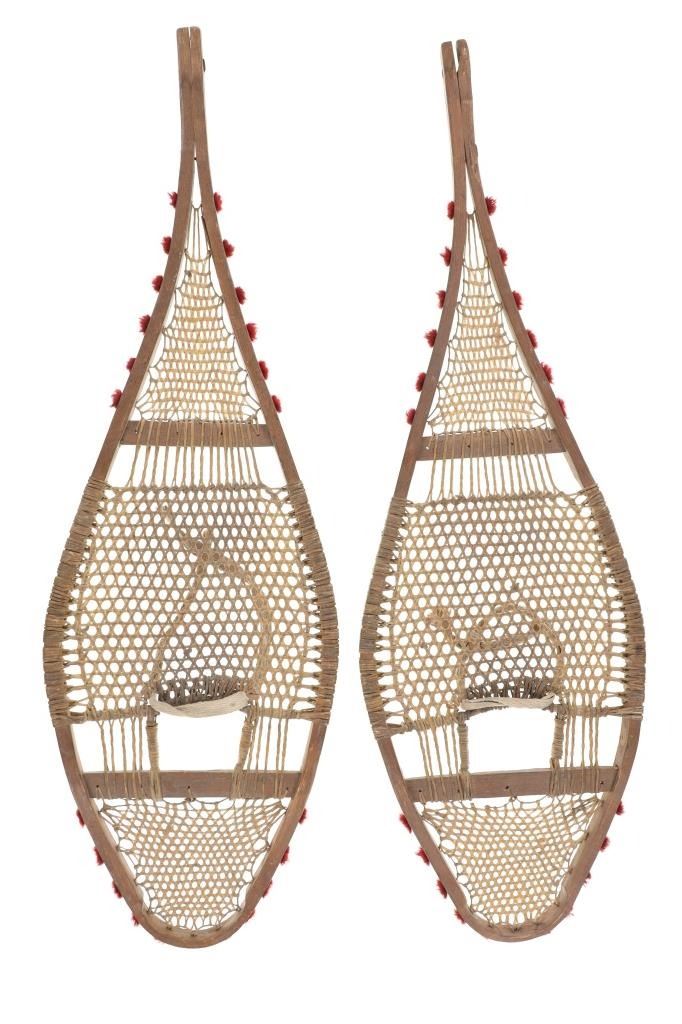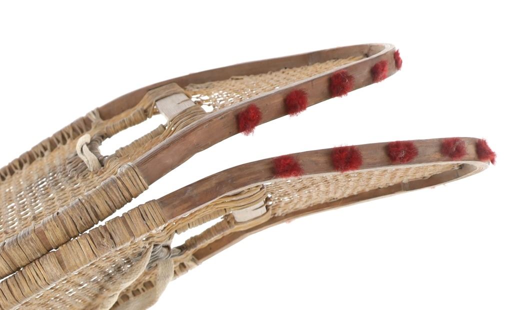 The lot features a set of rawhide and wood snowshoes with red plume adornments from the Ojibwa people of the Great Lakes Huron region. The set is dated to circa 1910 and show a classic snow show shape with rawhide pads and inlaid into the outside edge puffs or plumes of red yarn, similar to that of Germantown yarn. The set is well kept. Each measures overall 36.75-inches long by 11-inches wide.