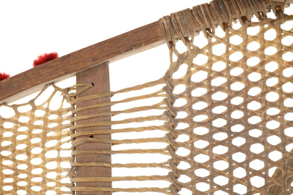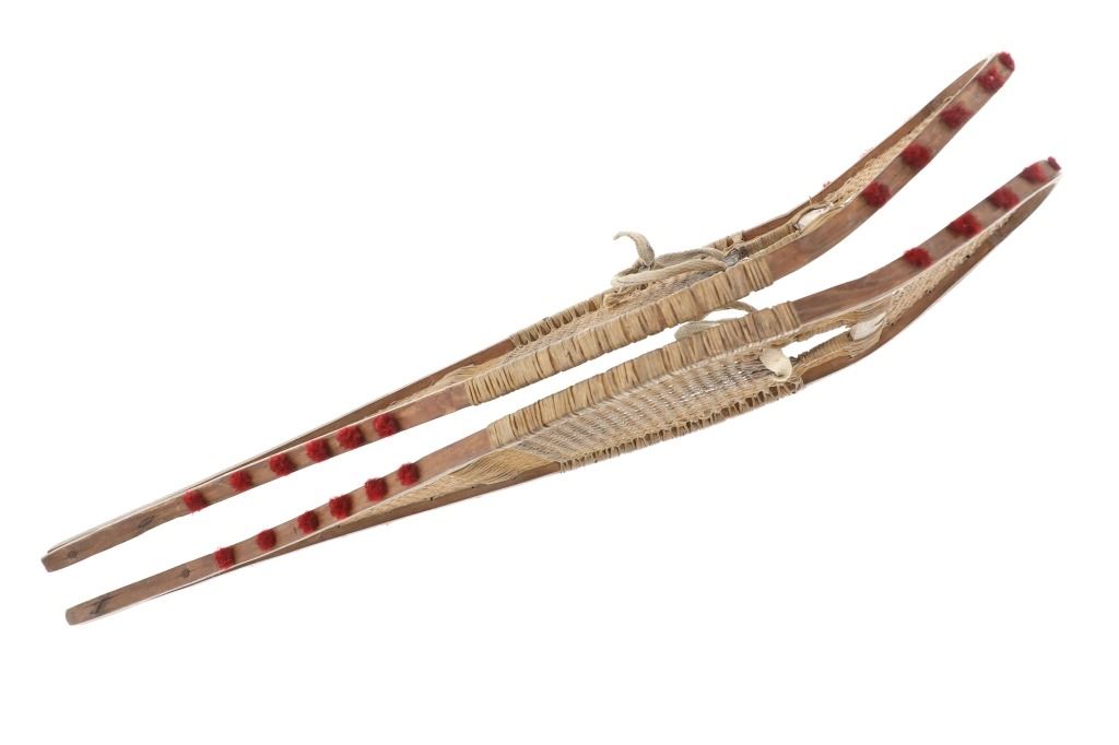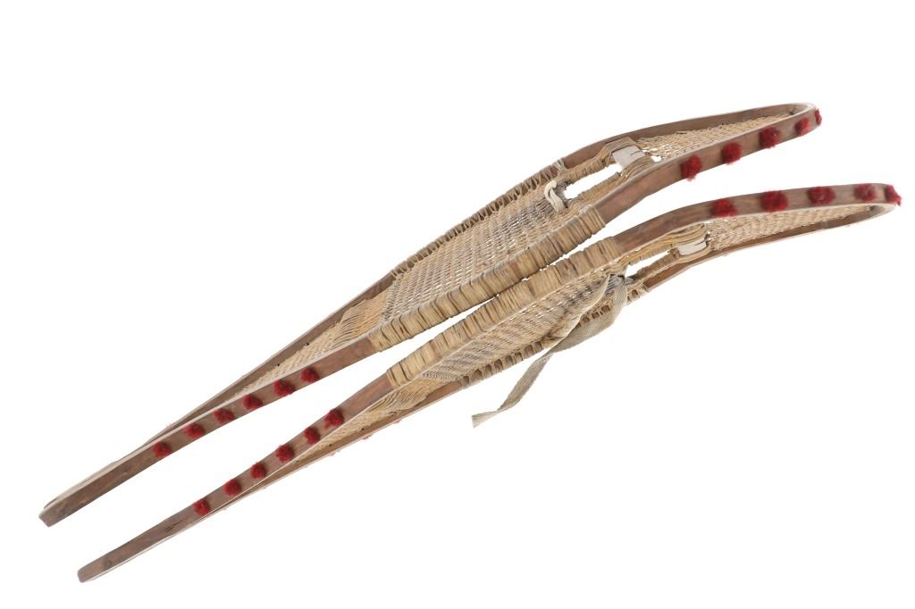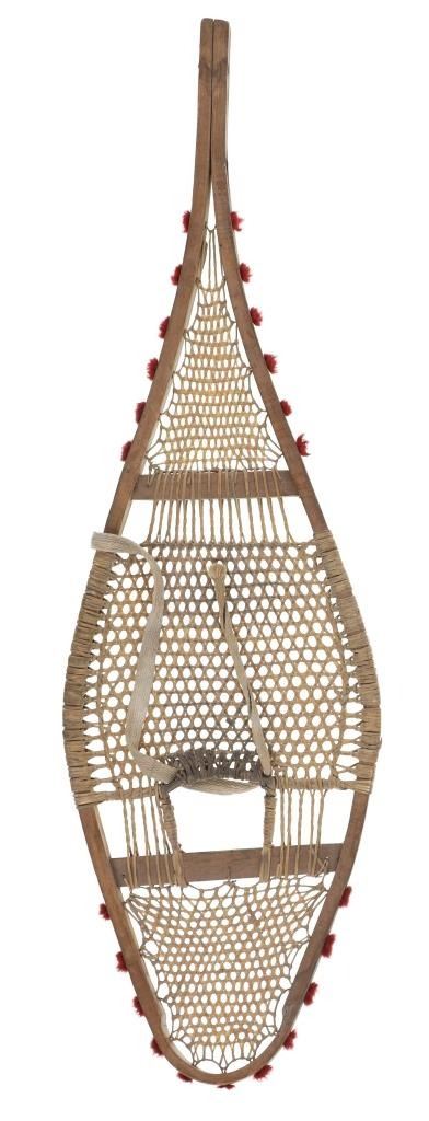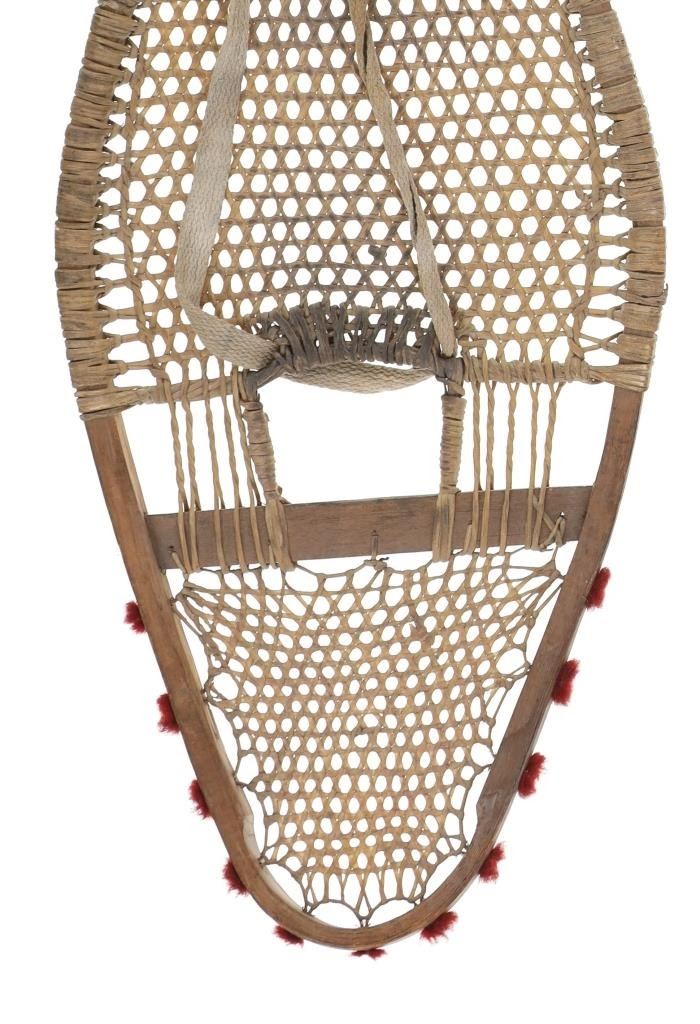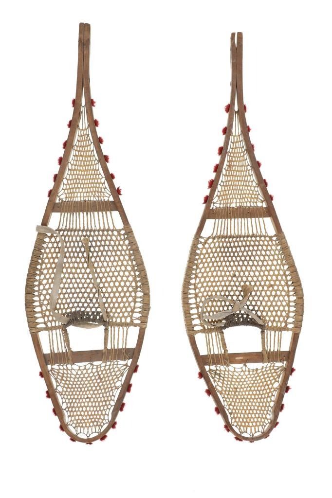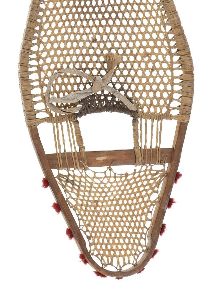 The lot features a set of rawhide and wood snowshoes with red plume adornments from the Ojibwa people of the Great Lakes Huron region. The set is dated to circa 1910 and show a classic snow show shape with rawhide pads and inlaid into the outside edge puffs or plumes of red yarn, similar to that of Germantown yarn. The set is well kept. Each measures overall 36.75-inches long by 11-inches wide.