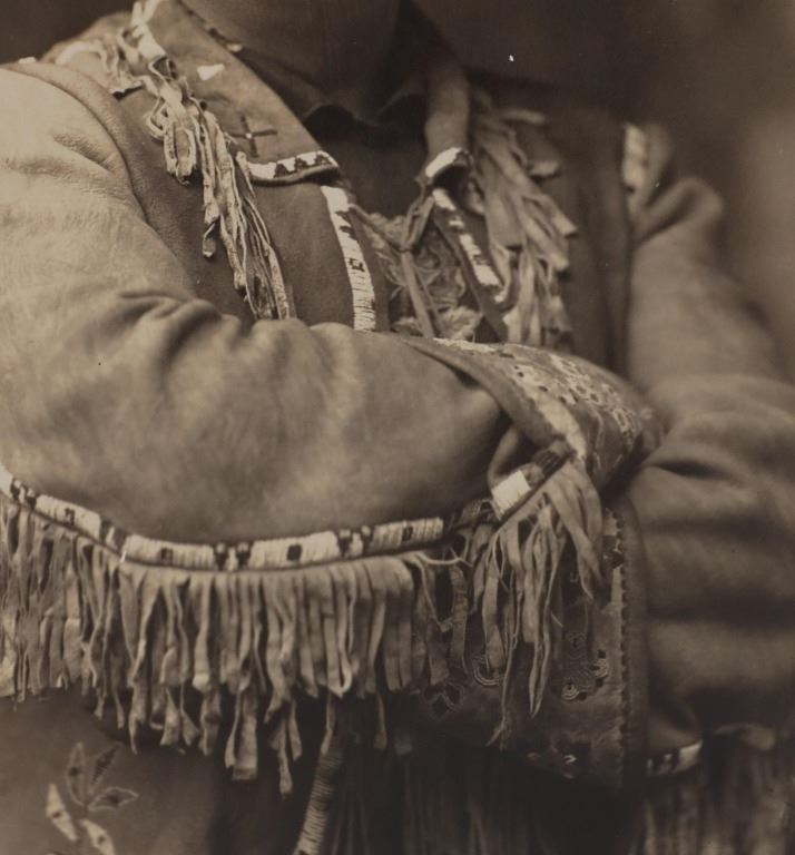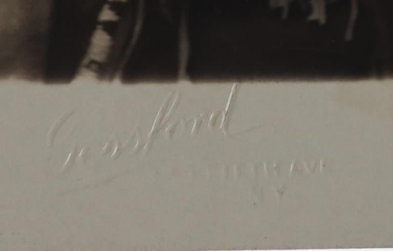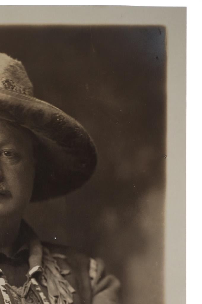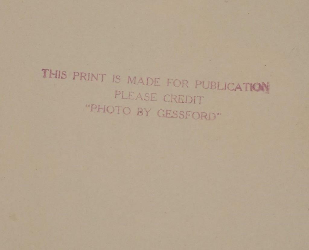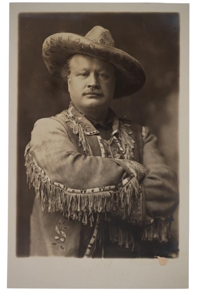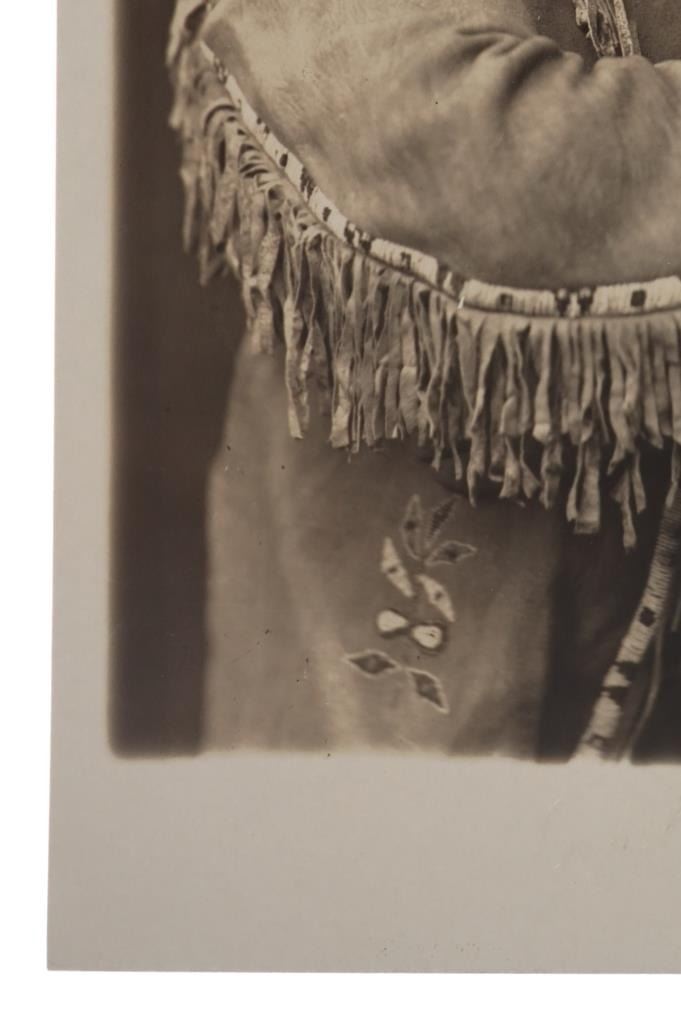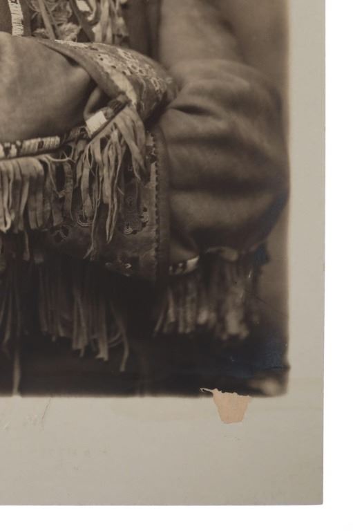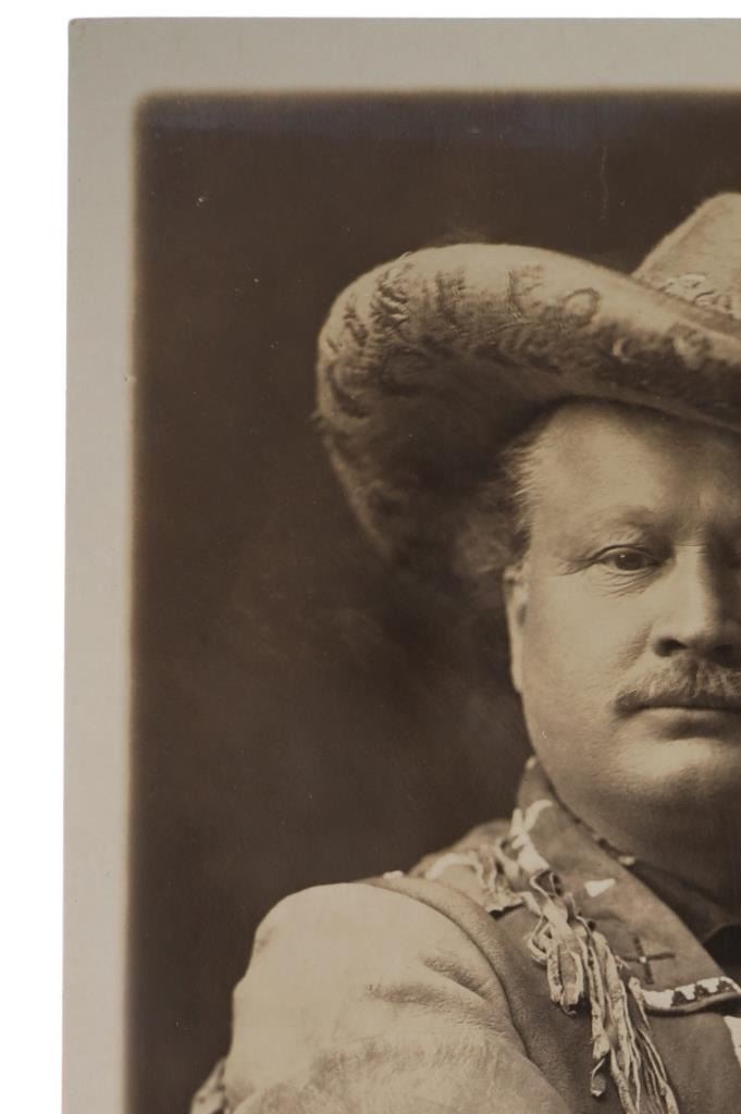 This is an original photograph of Pawnee Bill in his traditional Wild West show clothing with rattlesnake cowboy hat from Gessford circa 1910. This image was taken at the same time, in the same studio as the famous image by Gessford showing Buffalo Bill, Pawnee Bill and Buffalo Jones. This appears to be a silver gelatin photograph and shows Pawnee Bill with arms crossed wearing his iconic beaded scout jacket and beaded gauntlet gloves with the outrageous rattlesnake skin cowboy hat. Gordon William Lillie (1860-1942) known as Pawnee Bill was an American showman and performer who specialized in Wild West shows and was best known for his partnership with William “Buffalo” Bill Cody. The bottom of the image is blind stamped Gessford 373 Fifth Avenue N.Y. and on the back printed “THIS PRINT IS MADE FOR PUBLICATION PLEASE CREDIT ‘PHOTO BY GESSFORD’”. Rarely seen image from an iconic photo shoot. Provenance: From the Jim Aplan Piedmont, South Dakota collection. The image measures 7 1/8” BY 4.5”. Good overall condition, begin well kept with a clear wonderful image, one small blemish bottom right corner.