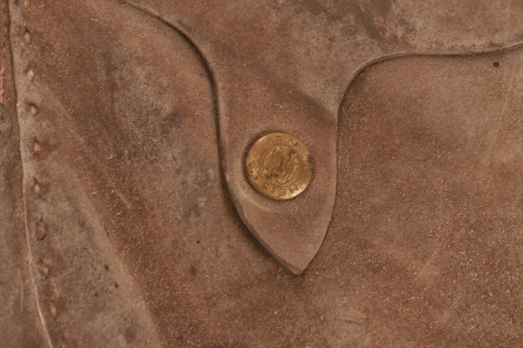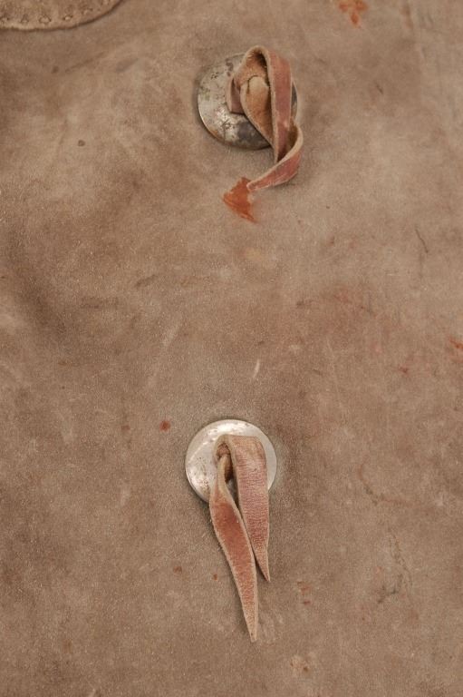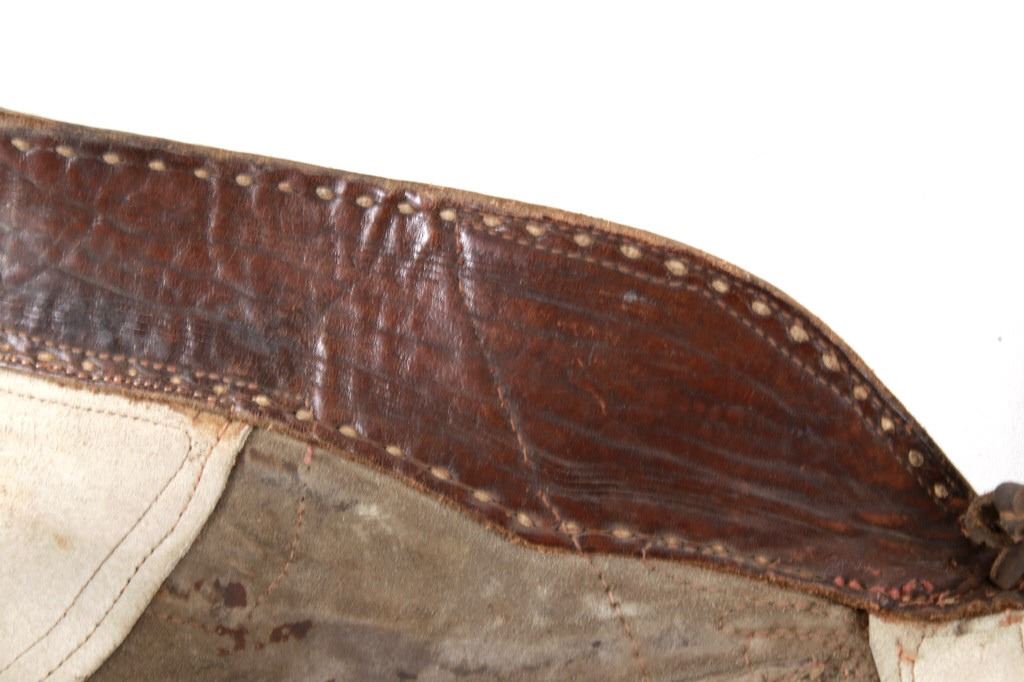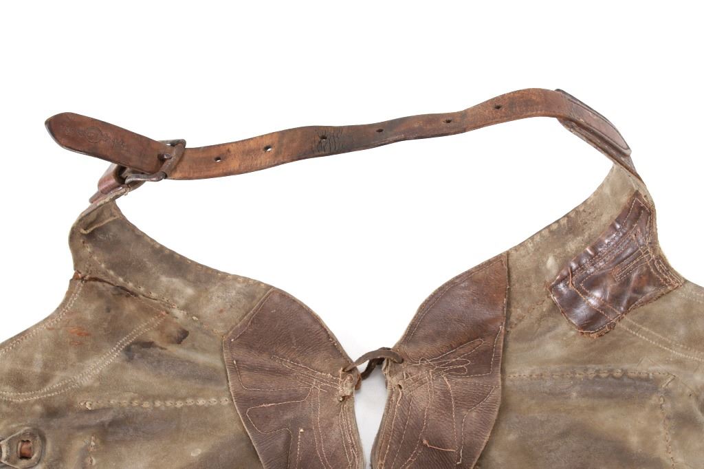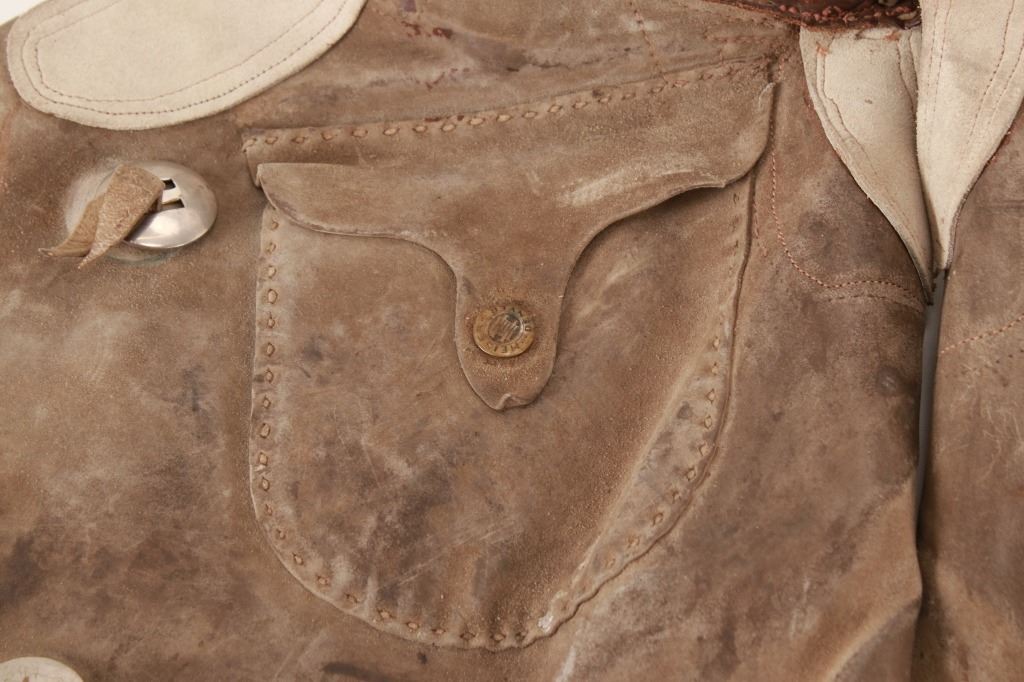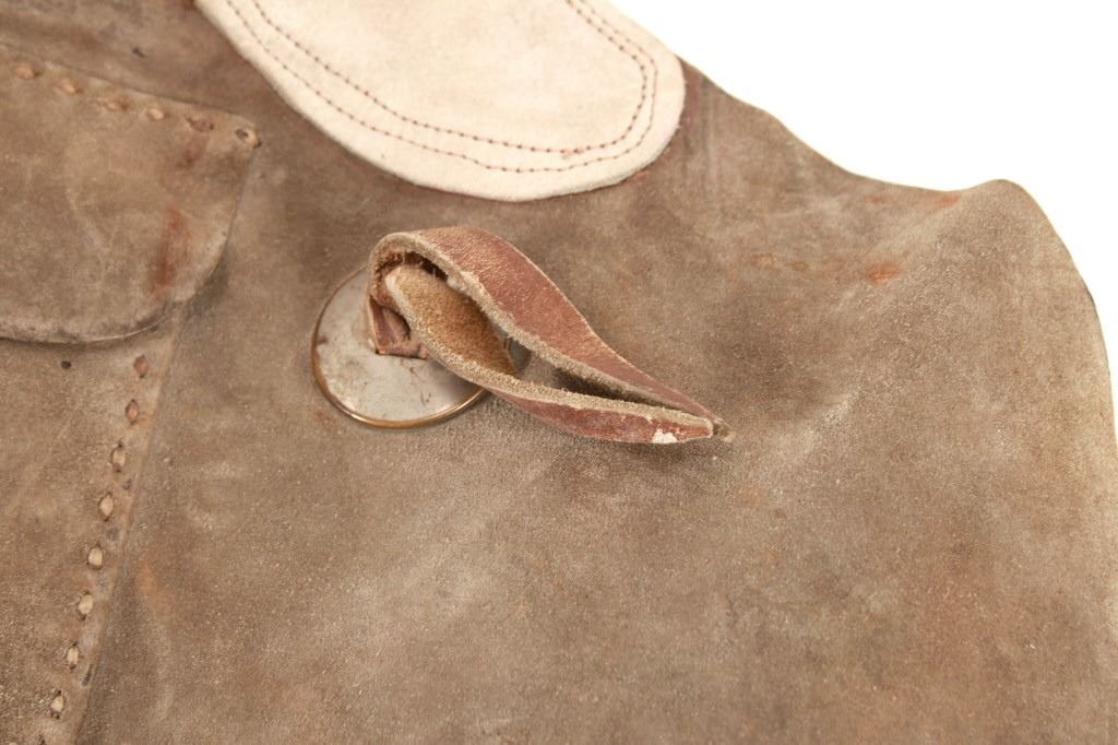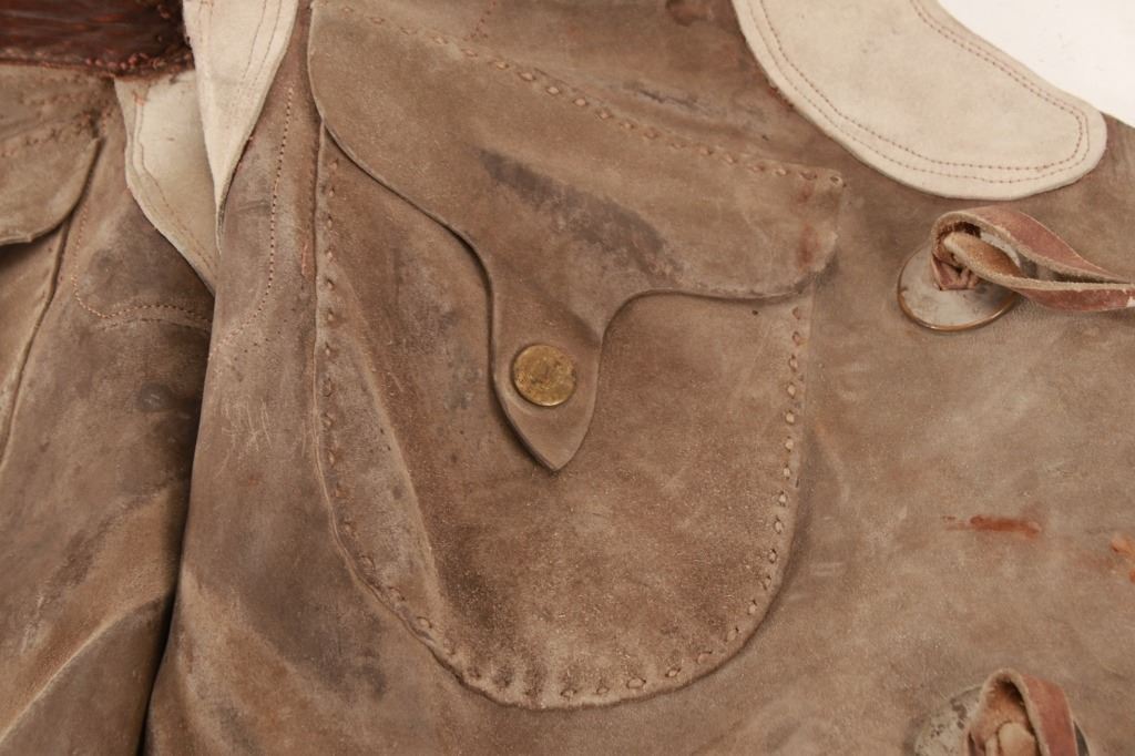 Featured in this lot is this Quebec, Colorado custom batwing work chaps circa 1910 to 1940's. The chaps feature a wonderfully and professionally crafted leather, brass, and stainless steel construction that shows a batwing shape with pockets sewn into the chaps. The chaps show a makers mark on the chap belt (most of it can be read but the top rocker is unreadable) as follows: "" "" E Davis - Always Reliable - Quebec, Colo. The brass buttons are marked from the iconic saddlery out of Denver, Colorado 'Heiser'. The condition of this pair of chaps is well preserved with some wear to the leather consistent with age and use of the chaps is in well preserved condition. The overall measurements of this pair of chaps is 42" x 18". The collective weight of this pair of chaps is 5lbs. Provenance: Owned by Steve Gongo who summered sheep and cattle for ranchers at Deer Lodge in Beef Straight and German Gulch, southeast of Anaconda, MT.