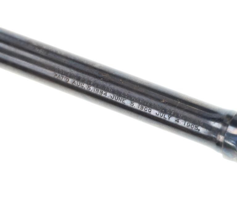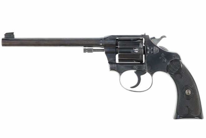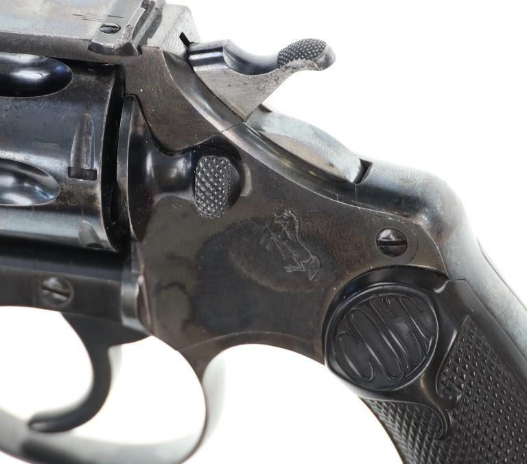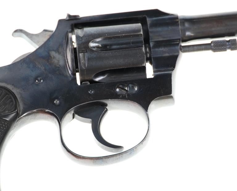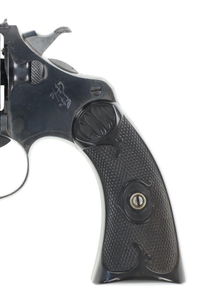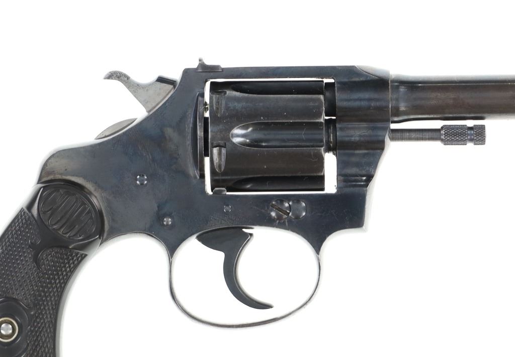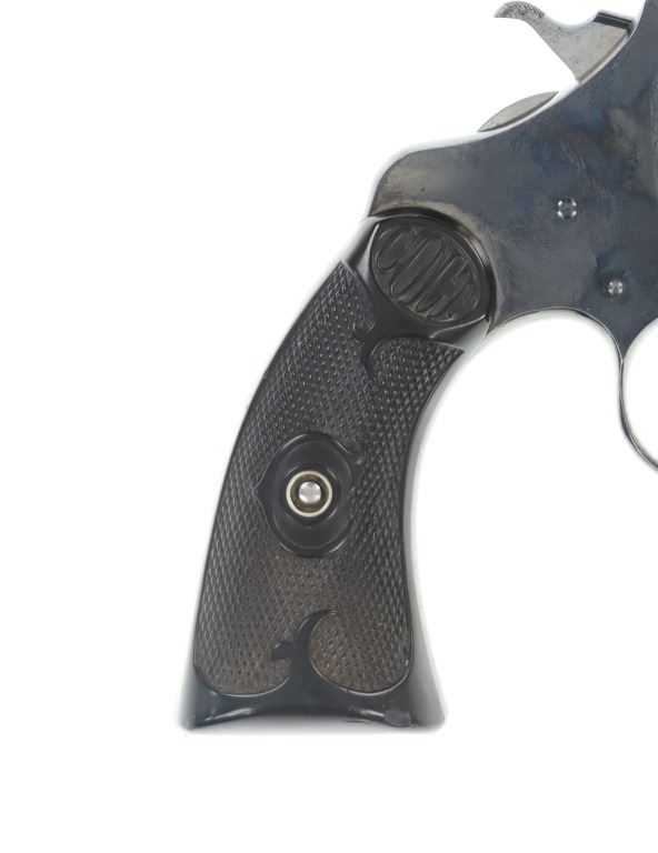 Early Colt Police Positive TARGET revolver in .22 Long Rifle chambering. This high condition Colt with serial number 13210 was made 110 years ago in 1915. It displays nearly all of the original Colt high polish blue on the barrel, cylinder, frame, grip straps, trigger guard, ejector rod etc. Further it retains the desirable fire blue on the hammer back and trigger. The original Colt embossed grips are also in excellent condition. This is the flat top adjustable sight version of the famed Colt Police Positive and was considered the state of the art target rim fire revolver of the early part of the 20th century. All markings are sharp and clear including the rampant colt on the left side of the frame, and the address and last patent date of 1905 on the barrel top. These early target Colts were very popular with both