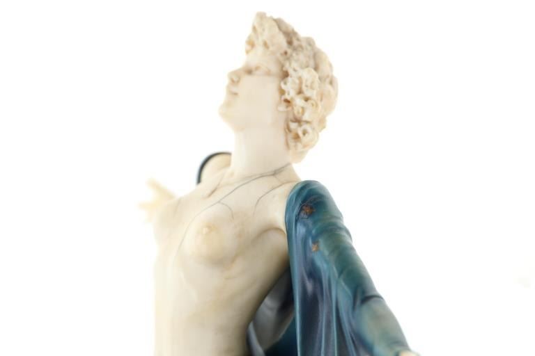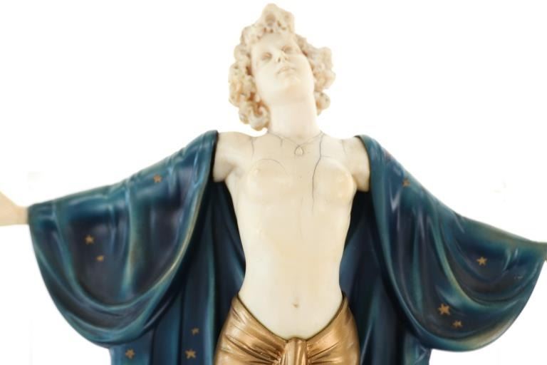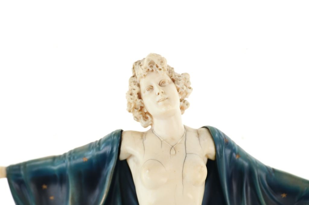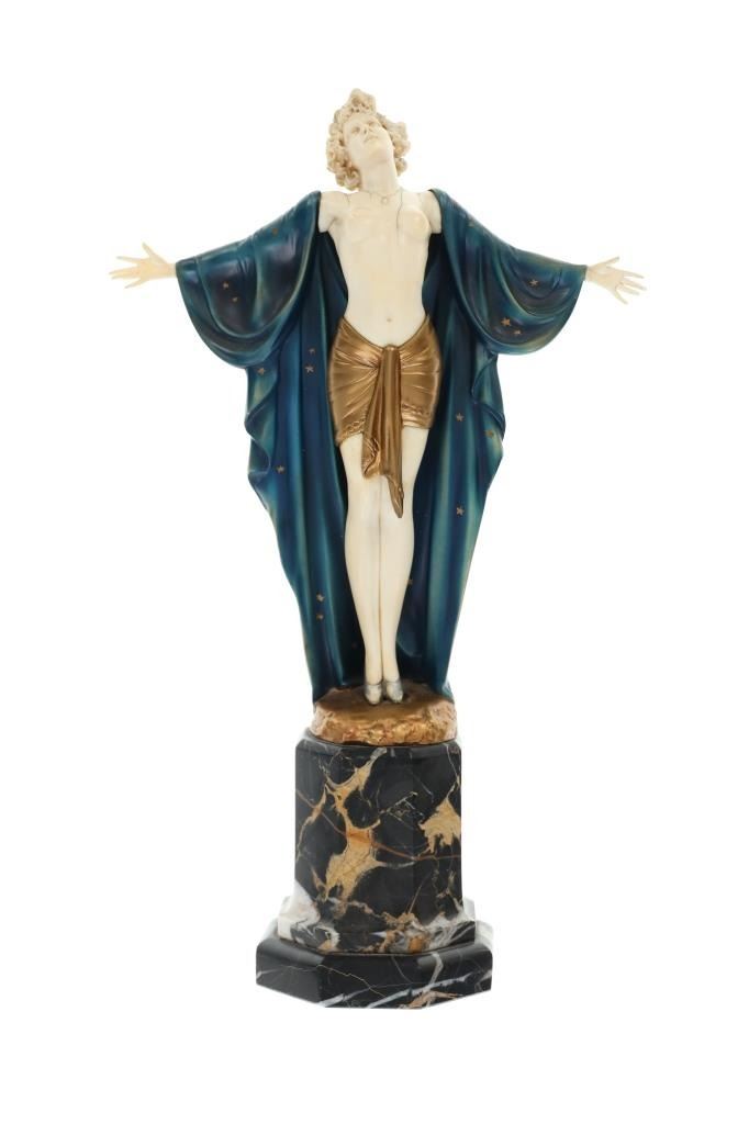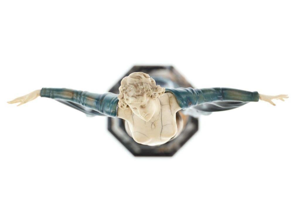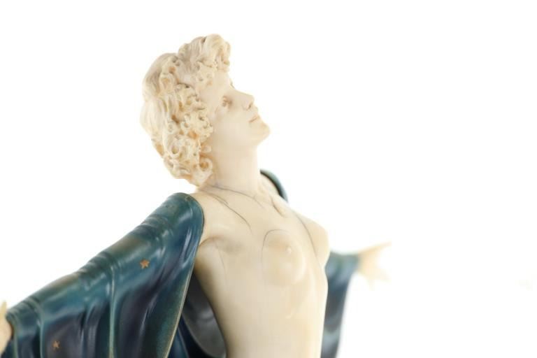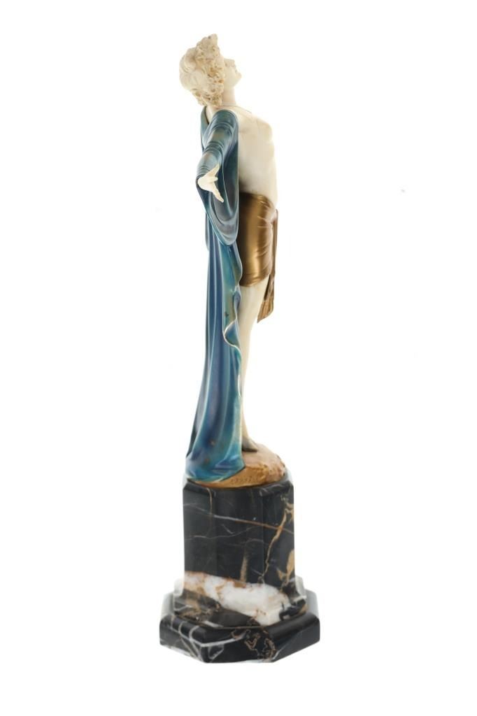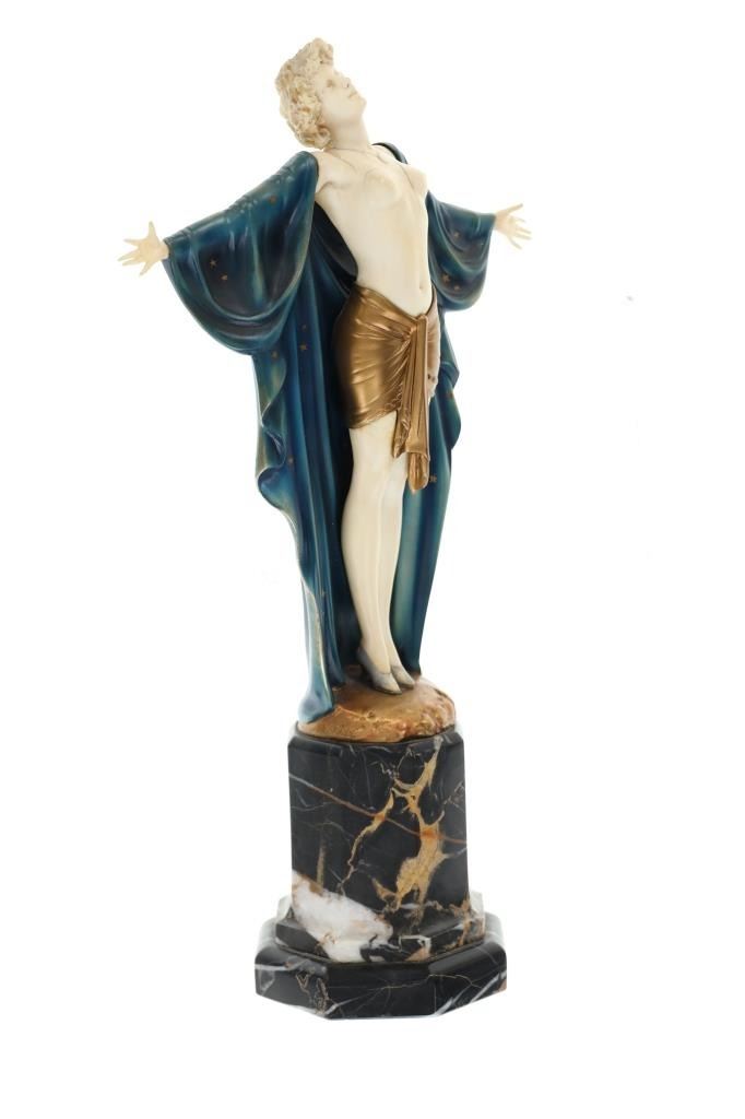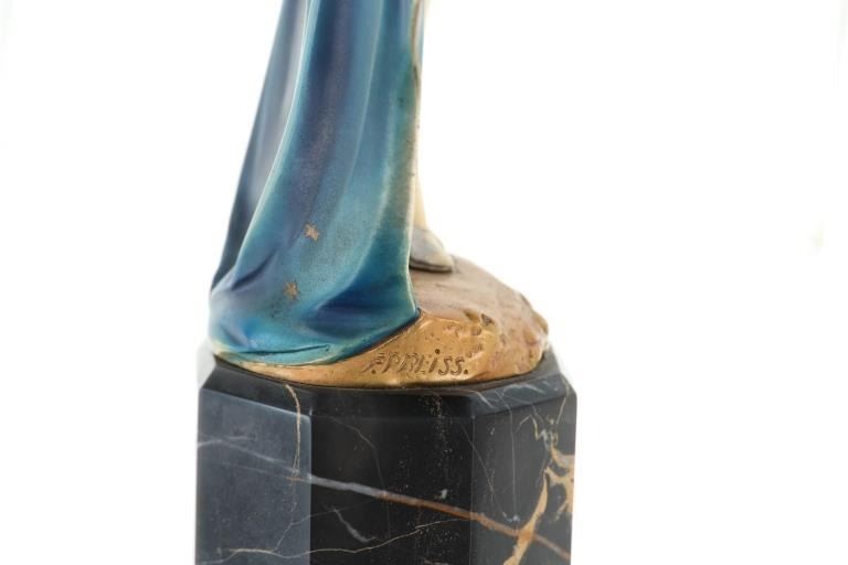 This is an original, astounding circa early-1920’s cold-painted bronze, gilded and carved bone sculpture by Johann Philipp Ferdinand Preiss (1882-1943). The sculpture is signed at the base, “F. PREISS.” The sculpture has a two-part octagonal marble base and shows an original bronze that is cold-painted and fielded showing a partially-nude woman with arms spread out standing atop of a base with a shawl draping from her arms. The hands, body, head and legs are carved from tusk i.v.o.r.y. bone which is in original condition. Ferdinand Preiss was born in Erbach, German Empire in 1882. By 15 years of age both of his parents had died and shortly after apprenticed to the tusk carver Philipp Willmann and lived with his family. He befriended Arthur Kassler and founded Preiss & Kassler in Berlin. The piece was crafted in the early 1920’s and is titled, “Spring Awakening”. A piece from this edition, sold at Quittenbaum’s November 2018 auction for 55,000 euro’s ($60,481 in US). Provenance: From the ex-collections of Carl & Doris Loomis and Jerry Loomis. Measures 14-inches high by 8.5-inches wide and the base is 4-inches across. The fingers are present in good condition but incredibly fragile and could possibly damage in shipping.