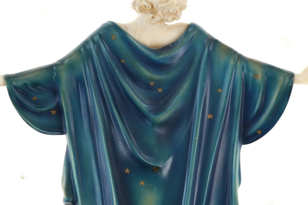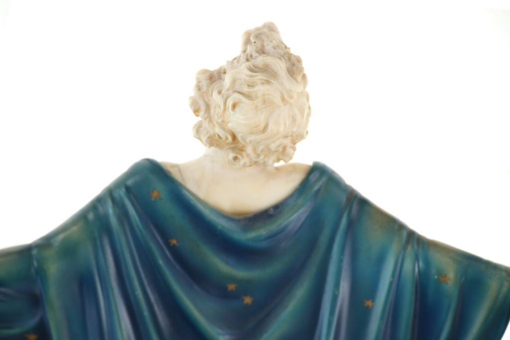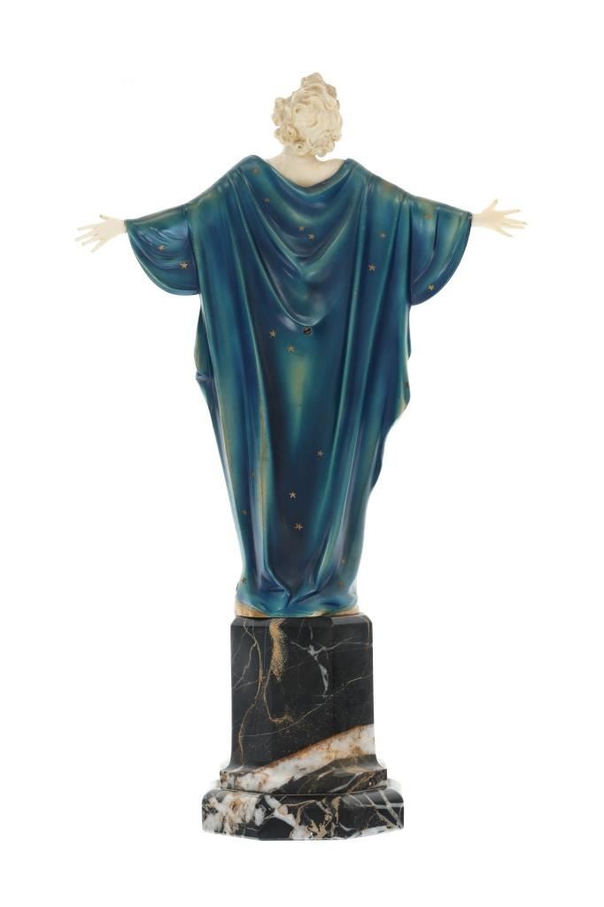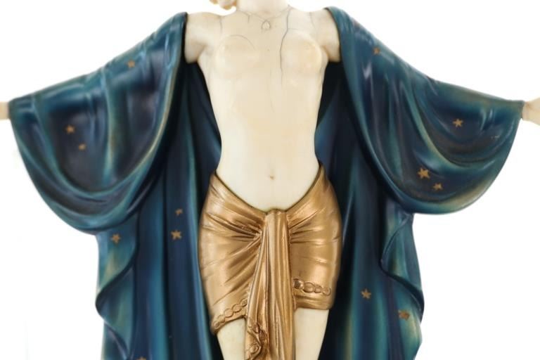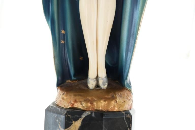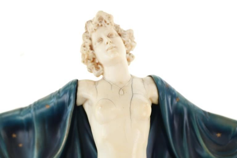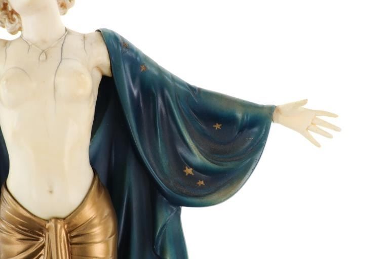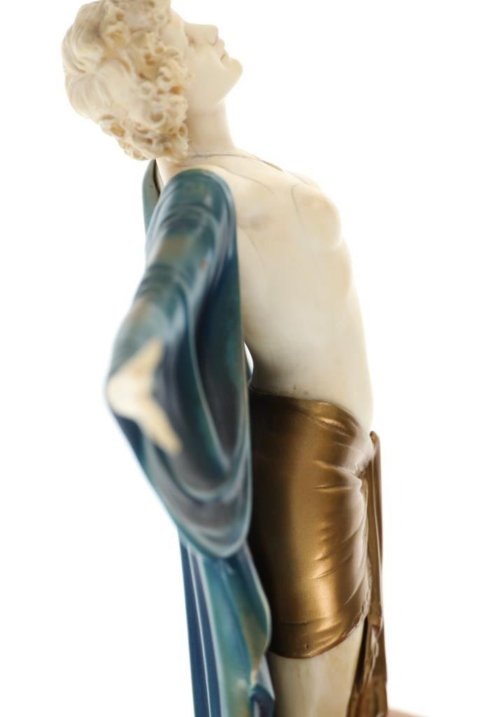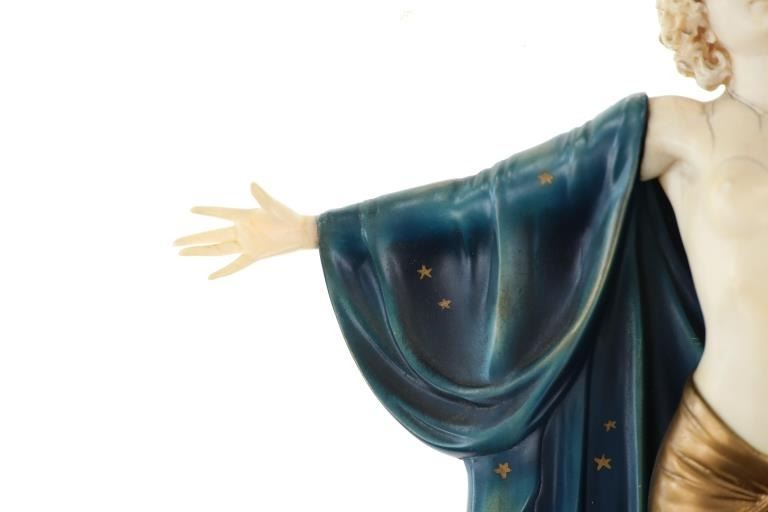 This is an original, astounding circa early-1920’s cold-painted bronze, gilded and carved bone sculpture by Johann Philipp Ferdinand Preiss (1882-1943). The sculpture is signed at the base, “F. PREISS.” The sculpture has a two-part octagonal marble base and shows an original bronze that is cold-painted and fielded showing a partially-nude woman with arms spread out standing atop of a base with a shawl draping from her arms. The hands, body, head and legs are carved from tusk i.v.o.r.y. bone which is in original condition. Ferdinand Preiss was born in Erbach, German Empire in 1882. By 15 years of age both of his parents had died and shortly after apprenticed to the tusk carver Philipp Willmann and lived with his family. He befriended Arthur Kassler and founded Preiss & Kassler in Berlin. The piece was crafted in the early 1920’s and is titled, “Spring Awakening”. A piece from this edition, sold at Quittenbaum’s November 2018 auction for 55,000 euro’s ($60,481 in US). Provenance: From the ex-collections of Carl & Doris Loomis and Jerry Loomis. Measures 14-inches high by 8.5-inches wide and the base is 4-inches across. The fingers are present in good condition but incredibly fragile and could possibly damage in shipping.